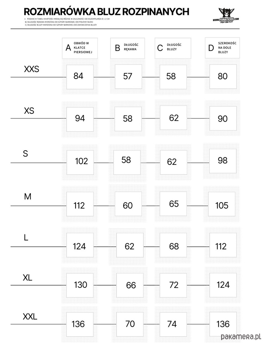 Koszt bluzy szytej na miarę oraz wykraczającej poza rozmiar XL jest wyższy od standardowej ceny o 40 złotych.