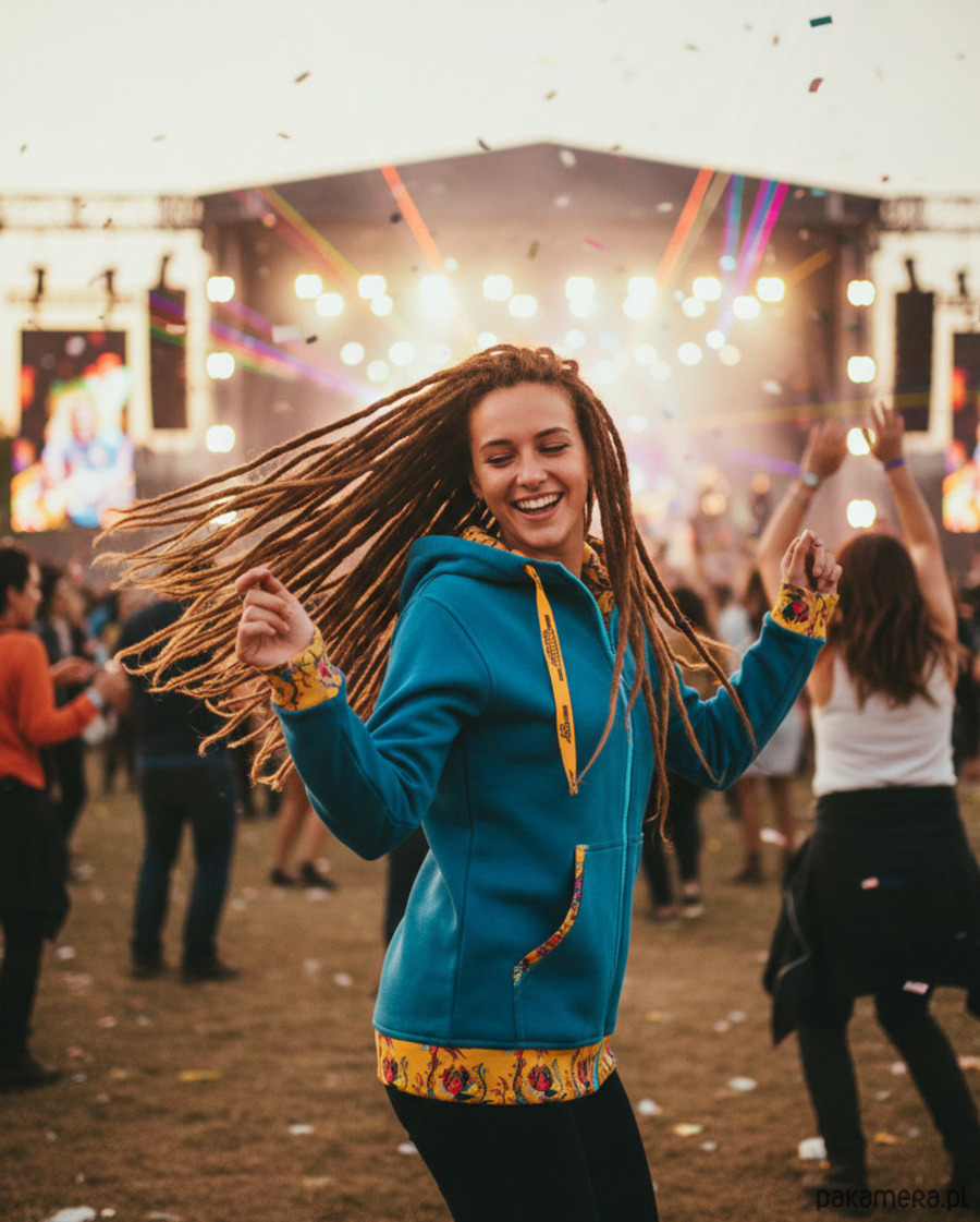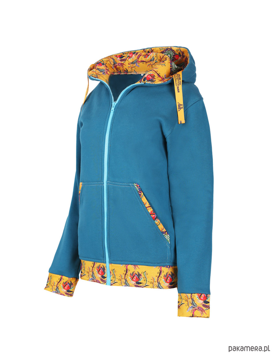 Bluza z wykończeniem we wzór w echnea (mankiety, ściągacz, kaptur), z turkusowym zamkiem.