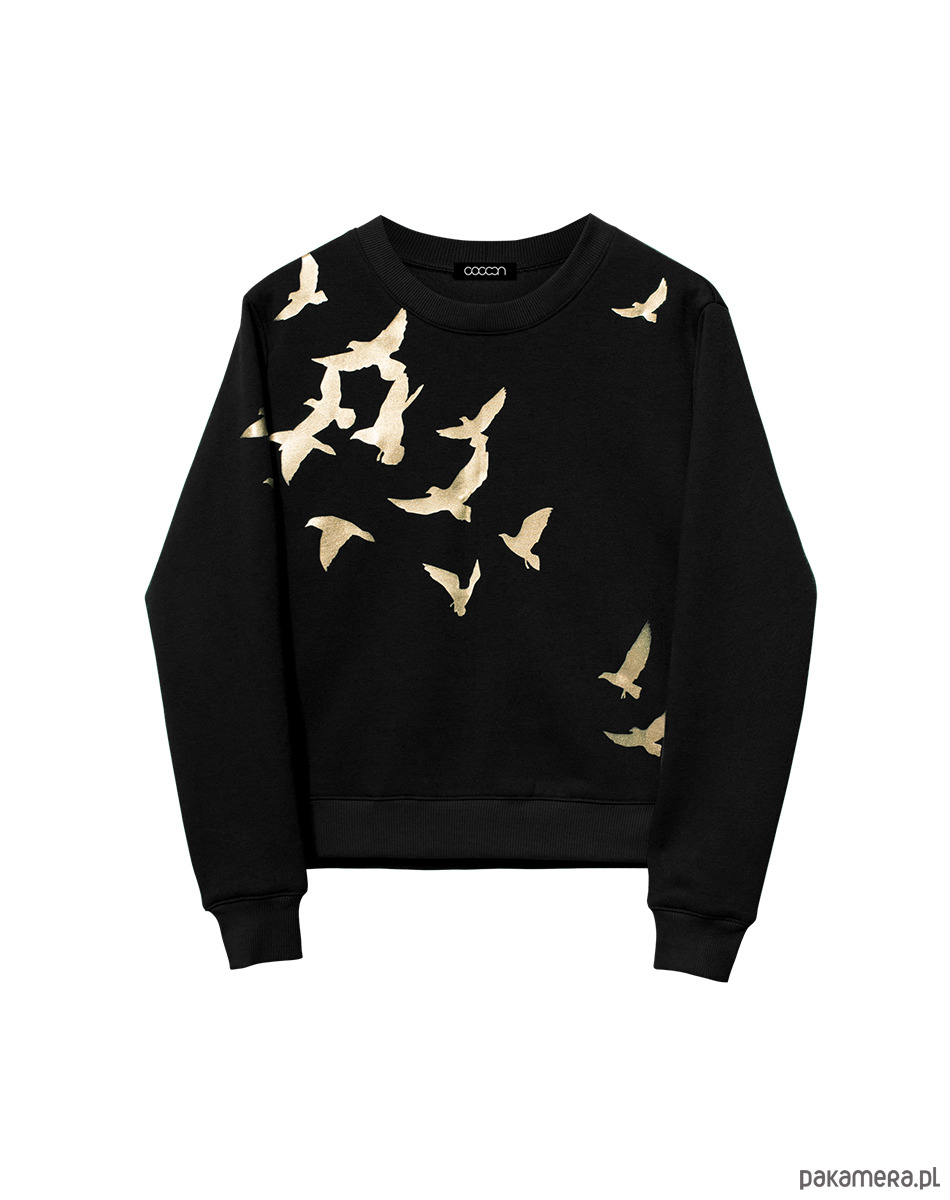 Bluza , uszyta z grubej a zarazem super miękkiej i przyjemnej w dotyku wysokogatunkowej dzianiny bawełnianej w kolorze czarnym. Bardzo ciepła i wygodna. "Złote ptaki" wykonana w technice sublimacji, z folii flex wygrzewanej na gorąco bezpośrednio na dzianinie. Nie jest to zwykły nadruk, ale ręcznie wykonywane zdobienia dające bardzo trwały efekt, który nigdy nie wyblaknie ;) Print czyni ją zupełnie wyjątkową i oryginalną sprawiając jednocześnie, że nie jest to zwykła bluza dresowa. Dzięki temu można ją nosić do eleganckich spodni, spódnic, szpilek tworząc tym samym niebanalne, nowoczesne stylizacje :) Dekolt bluzy, dół i rękawy wykończone bawełnianym ściągaczem. dzianina posiada. Dzianina posiada certyfikat oekotex