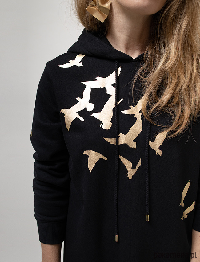 Długa bluza ze złotą aplikacją, w postaci lecących ptaków z kolekcji SKY. Uszyta z grubej a zarazem super miękkiej i przyjemnej w dotyku wysokogatunkowej dzianiny bawełnianej certyfikowanej znakiem OEKO-TEX. Kolor czarny. Ciepła i wygodna. Złota aplikacja wykonana w technice sublimacji, z folii flex wygrzewanej na gorąco bezpośrednio na dzianinie. Nie jest to zwykły nadruk, ale ręcznie wykonywane zdobienia dające bardzo trwały efekt. Jakość dzianiny wraz ze złotą aplikacja czyni ją zupełnie wyjątkową i oryginalną sprawiając jednocześnie, że nie jest to zwykła bluza dresowa. To nasza wersja #glam dresów. Bluza posiada kaptur, rękawy wykończone bawełnianym ściągaczem i rozcięcia po bokach.