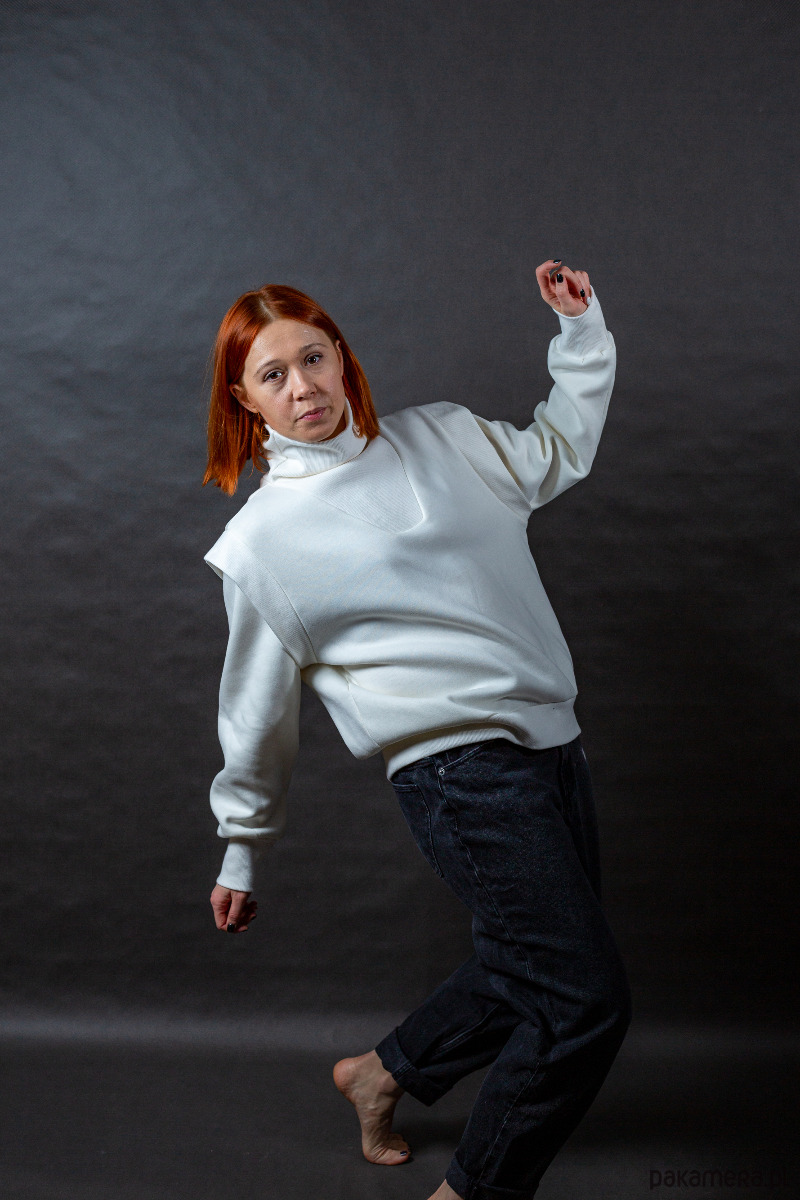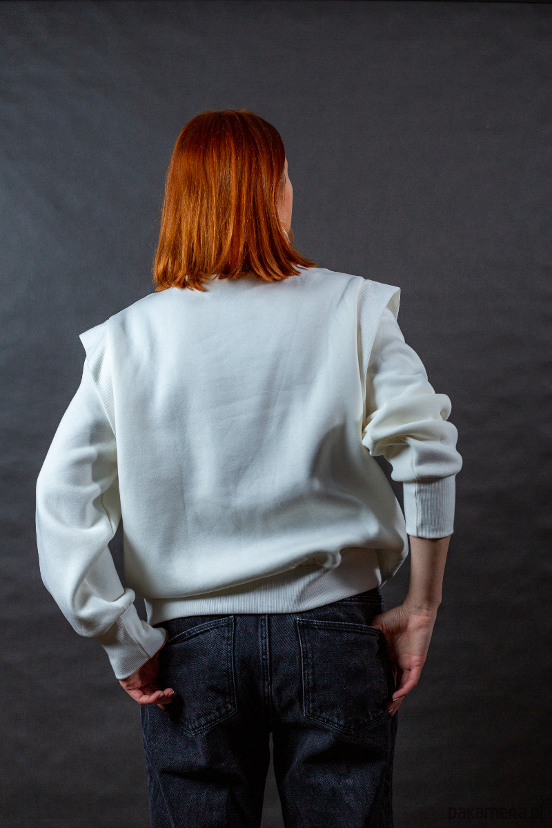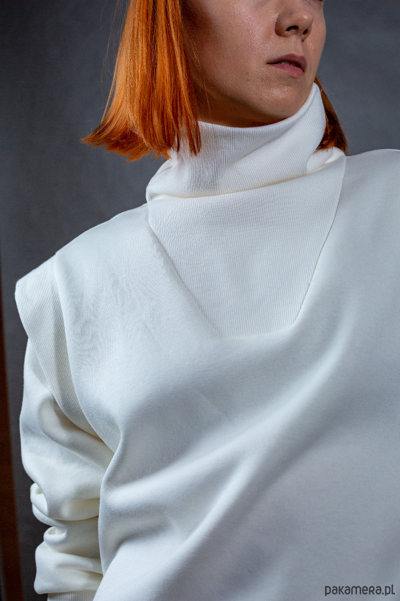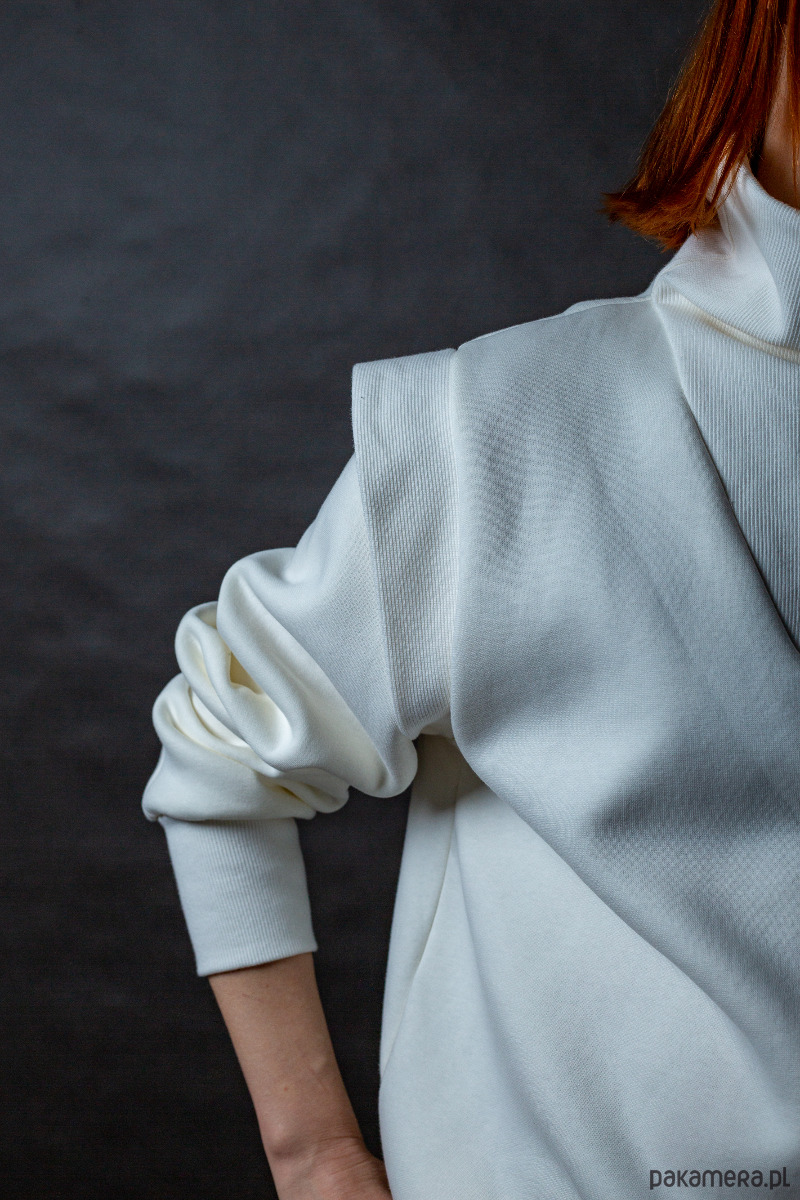 Wygodna bluza o klasycznym kroju, z ozdobną plisą na ramieniu i luźnymi rękawami. Posiada golf otulający nas w chłodniejsze dni. Jest szeroka, nie przylegająca do ciała, jeśli ktoś ceni sobie wygodę oraz komfort, to ta bluza, sprawdzi się na pewno.