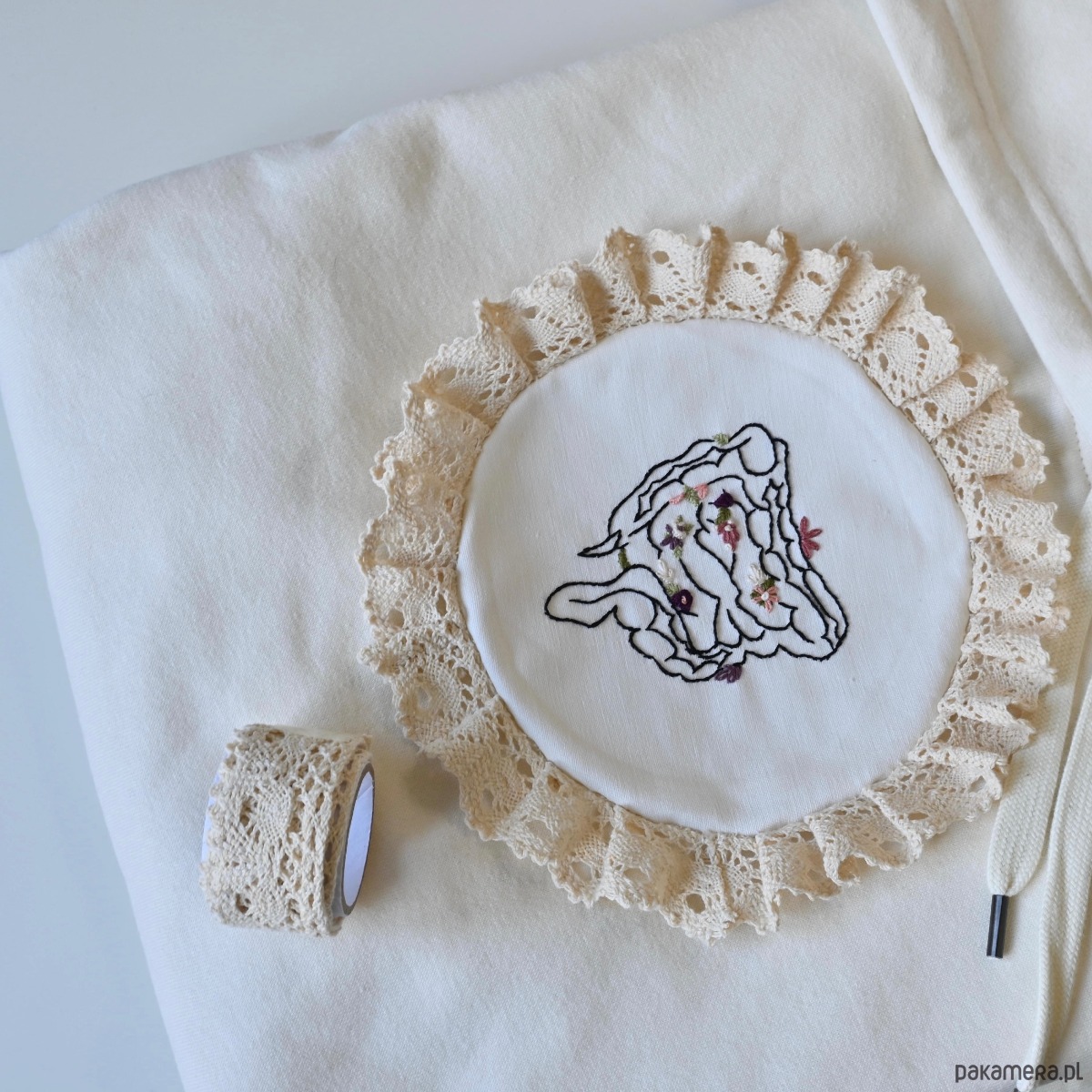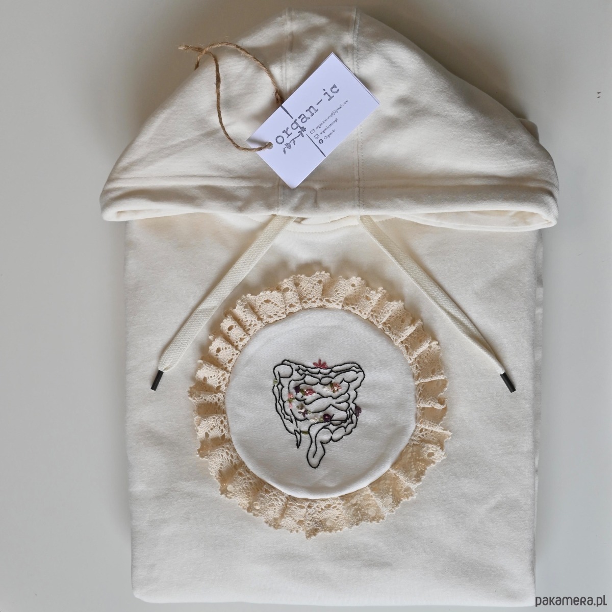 Bluza z kapturem i kieszonką kangurek z pięknie wykonanym haftem ręcznym oplecionym w koronkę.