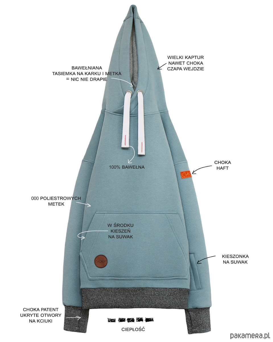 Bluza CHOKA LAZY KANGAROO GREY BLUE wykonana jest z bardzo ciepłej, miękkiej, a jednocześnie trwałej, najwyższej jakości dzianiny. Świetnie chroni przed wiatrem: wyposażona jest w wielki kaptur, pod który wejdzie czapka i otwory na kciuki. LAZY KANGAROO ma aż 3 kieszenie, w tym 2 zapinane na suwak - jedną na przedramieniu i jedną ukrytą w kangurce. Na ramieniu haft CHOKA.
