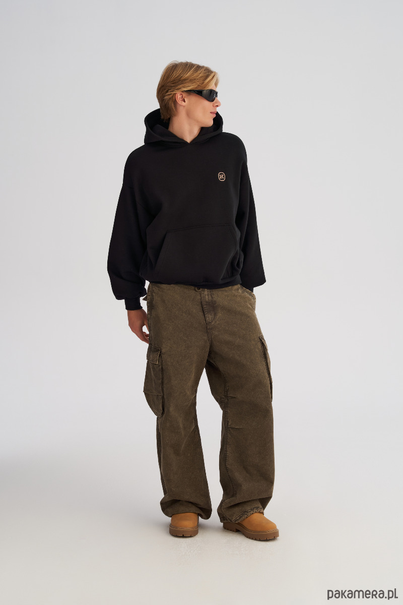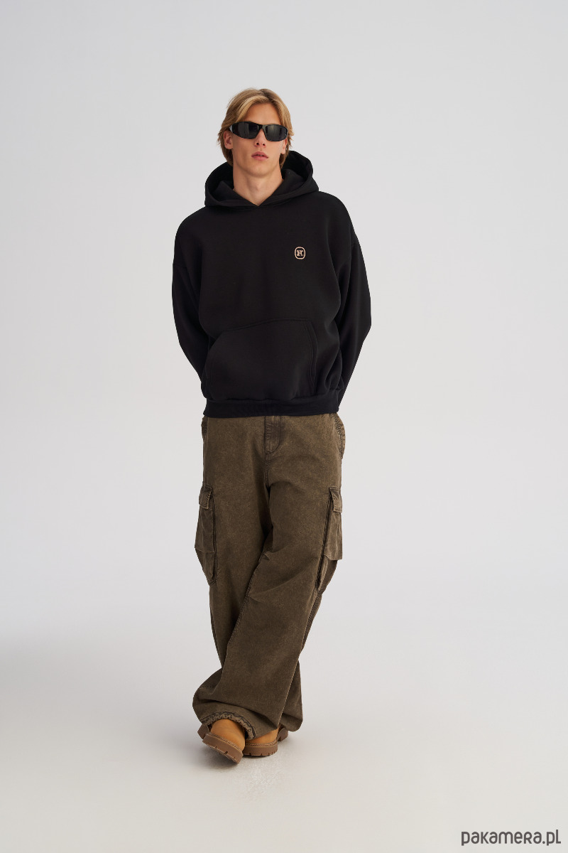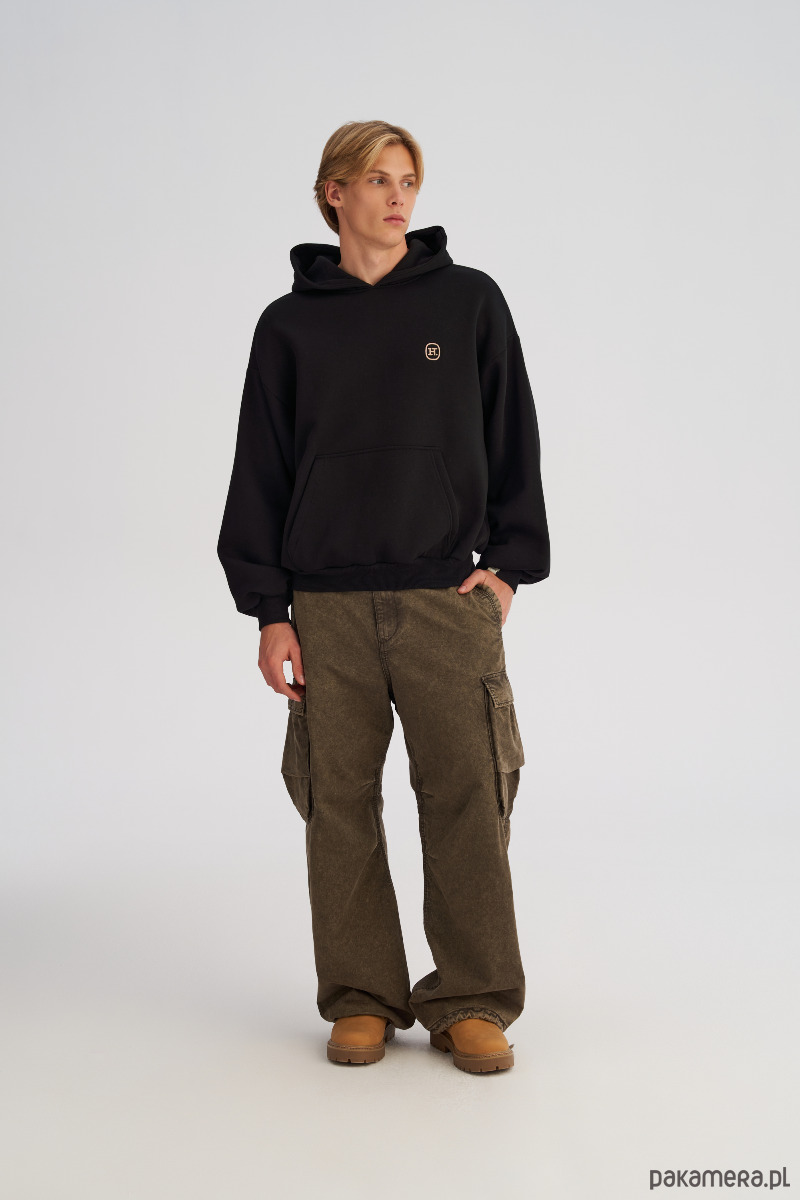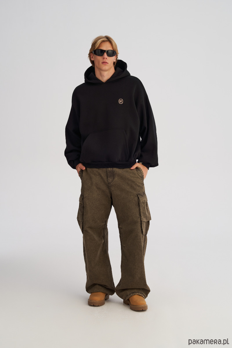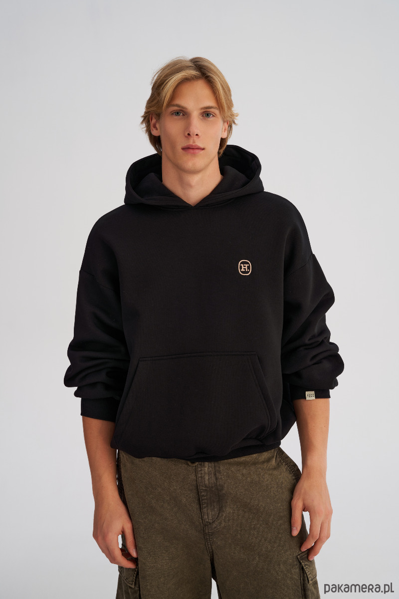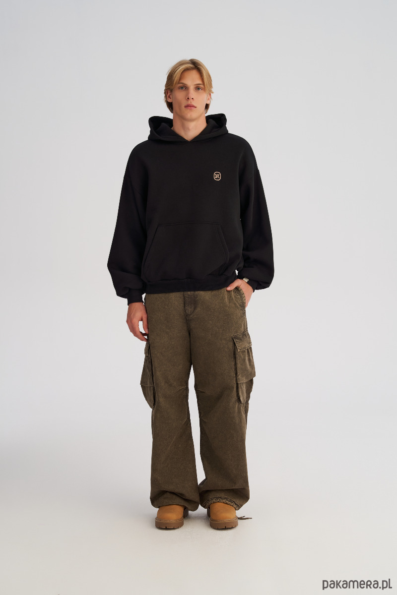 Krój jest nieco krótszy niż nasze standardowe bluzy i delikatnie zwęża się ku dołowi. Powoduje to, że ten model jest bardzo uniwersalny i dobrze układa się na różnych typach sylwetek. Ściągacz na dole tworzy subtelną bombkę, dzięki czemu możesz podwinąć bluzę i dopasować proporcje albo zostawić ją luźno, tak aby spod spodu wystawał t-shirt. Rękawy mają obniżoną linię, są bardzo obszerne i efektownie bufiaste przy mankietach. Z przodu znajduje się pojemna kieszeń kangurka i subtelny haft na piersi a na rękawie mała metka z logo.