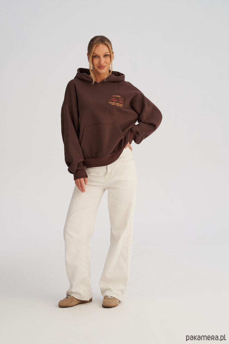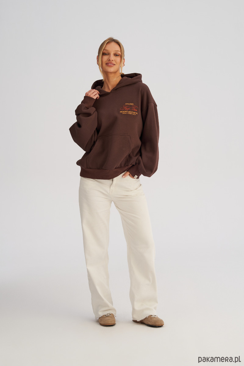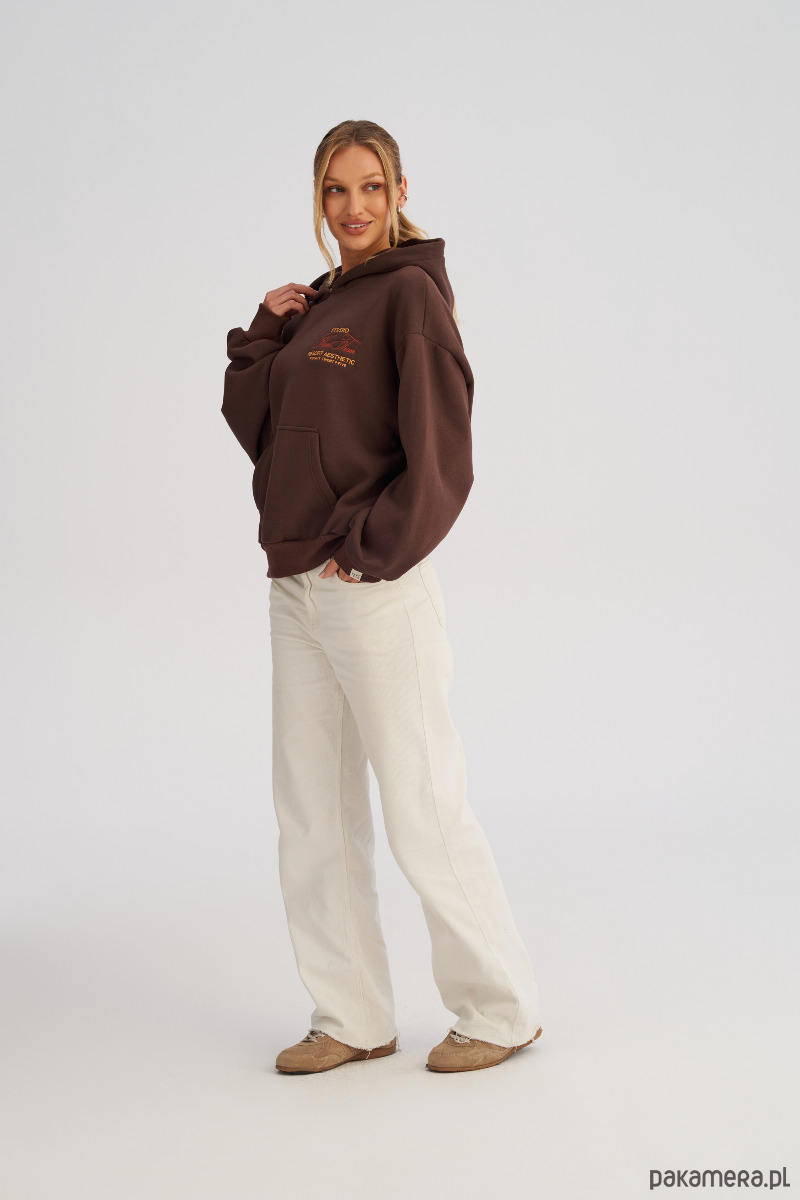 Krój jest nieco krótszy niż nasze standardowe bluzy i delikatnie zwęża się ku dołowi. Powoduje to, że ten model jest bardzo uniwersalny i dobrze układa się na różnych typach sylwetek. Ściągacz na dole tworzy subtelną bombkę, dzięki czemu możesz podwinąć bluzę i dopasować proporcje albo zostawić ją luźno, tak aby spod spodu wystawał t-shirt. Rękawy mają obniżoną linię, są bardzo obszerne i efektownie bufiaste przy mankietach. Z przodu znajduje się pojemna kieszeń kangurka i subtelny haft na piersi a na rękawie mała metka z logo.