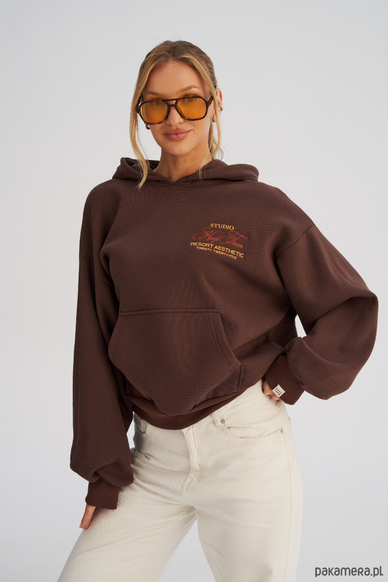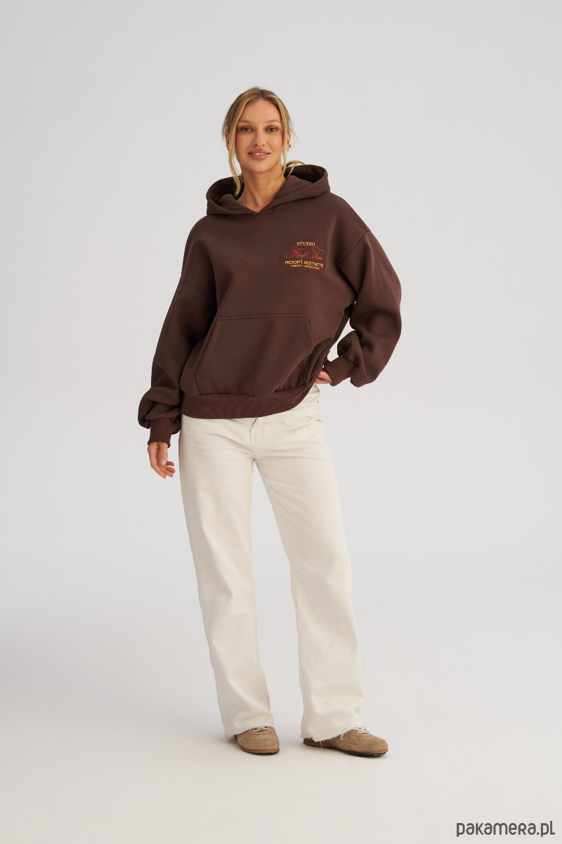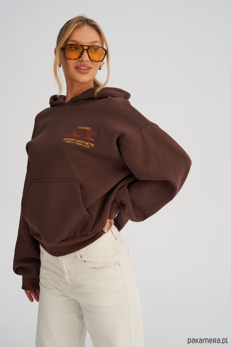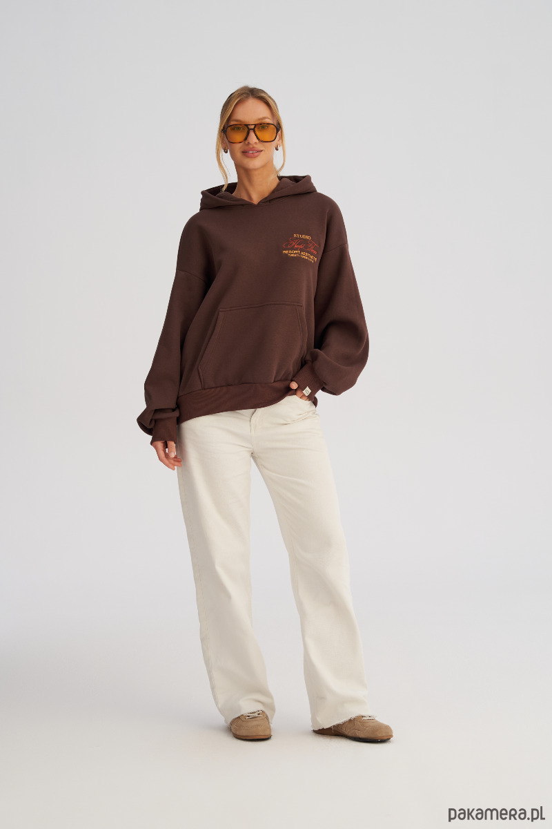 Krój jest nieco krótszy niż nasze standardowe bluzy i delikatnie zwęża się ku dołowi. Powoduje to, że ten model jest bardzo uniwersalny i dobrze układa się na różnych typach sylwetek. Ściągacz na dole tworzy subtelną bombkę, dzięki czemu możesz podwinąć bluzę i dopasować proporcje albo zostawić ją luźno, tak aby spod spodu wystawał t-shirt. Rękawy mają obniżoną linię, są bardzo obszerne i efektownie bufiaste przy mankietach. Z przodu znajduje się pojemna kieszeń kangurka i subtelny haft na piersi a na rękawie mała metka z logo.