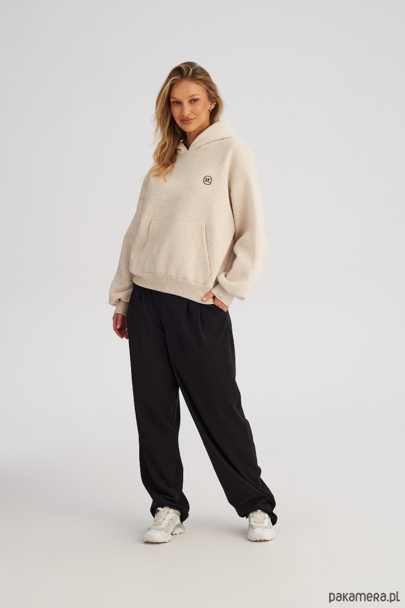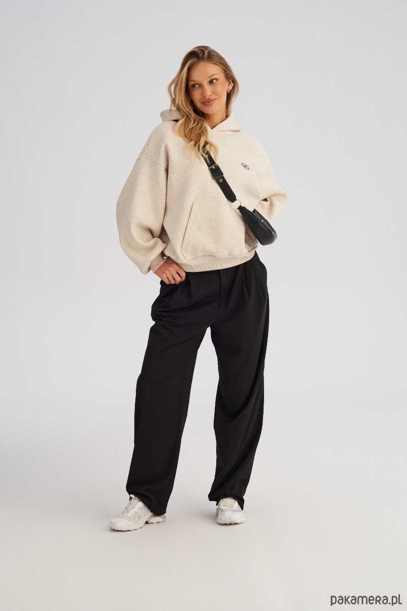 Krój jest nieco krótszy niż nasze standardowe bluzy i delikatnie zwęża się ku dołowi. Powoduje to, że ten model jest bardzo uniwersalny i dobrze układa się na różnych typach sylwetek. Ściągacz na dole tworzy subtelną bombkę, dzięki czemu możesz podwinąć bluzę i dopasować proporcje albo zostawić ją luźno, tak aby spod spodu wystawał t-shirt. Rękawy mają obniżoną linię, są bardzo obszerne i efektownie bufiaste przy mankietach. Z przodu znajduje się pojemna kieszeń kangurka i subtelny haft na piersi a na rękawie mała metka z logo.