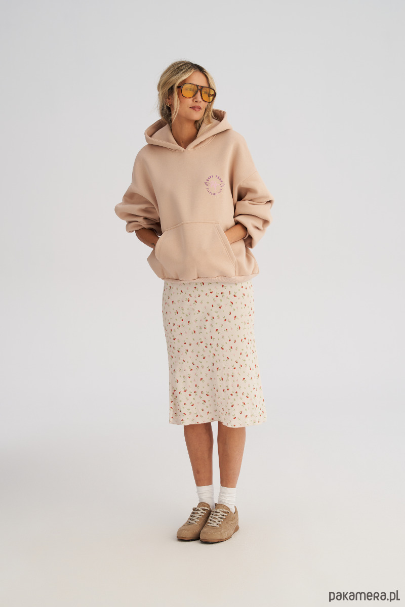 Krój jest nieco krótszy niż nasze standardowe bluzy i delikatnie zwęża się ku dołowi. Powoduje to, że ten model jest bardzo uniwersalny i dobrze układa się na różnych typach sylwetek. Ściągacz na dole tworzy subtelną bombkę, dzięki czemu możesz podwinąć bluzę i dopasować proporcje albo zostawić ją luźno, tak aby spod spodu wystawał t-shirt. Rękawy mają obniżoną linię, są bardzo obszerne i efektownie bufiaste przy mankietach. Z przodu znajduje się pojemna kieszeń kangurka, na rękawie mała metka z logo.
