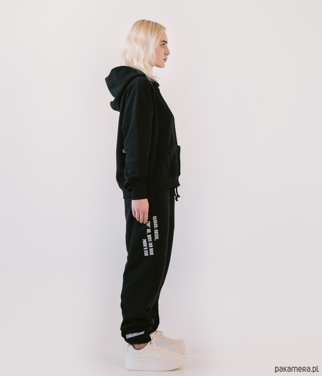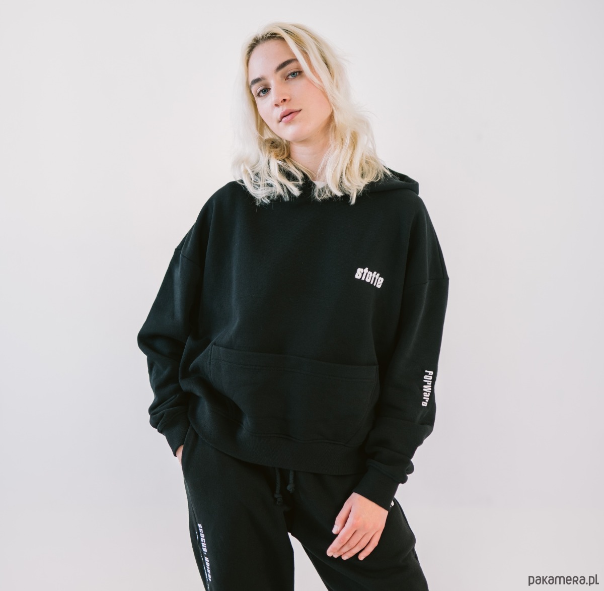 Czarna bluza z kapturem – minimalistyczny streetwear z charakterem w głębokim czarnym kolorze dla dziewczyny i chłopaka. Wykonana z miękkiej, przyjemnej w dotyku dzianiny, zapewnia komfort noszenia i swobodę ruchów. Bluza posiada obniżoną linię ramion, pojemną kieszeń kangurkę z przodu zapinaną na rzep, ściągacze przy mankietach i u dołu bluzy. Minimalistyczne, kontrastowe hafty dodają całości wyrazistości i podkreślają nowoczesny styl.