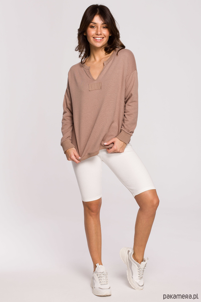 Na wygodną bluzę zawsze jest dobra pora. Lekka dzianina z ciekawą strukturą i przyjemnym wykończeniem od spodu i detale takie jak wycięcie w dekolcie i minimalistyczne wykończenie przy szyi i u dołu bluzy i rękawów.