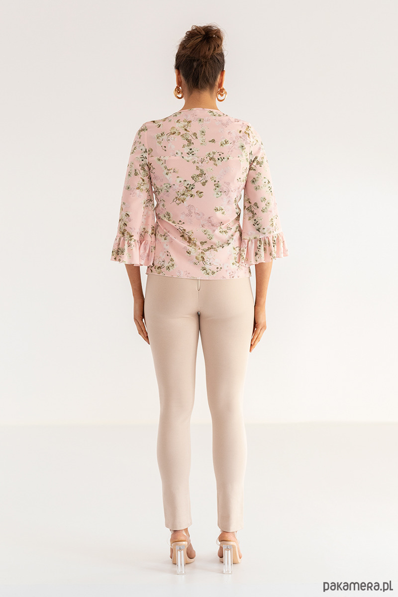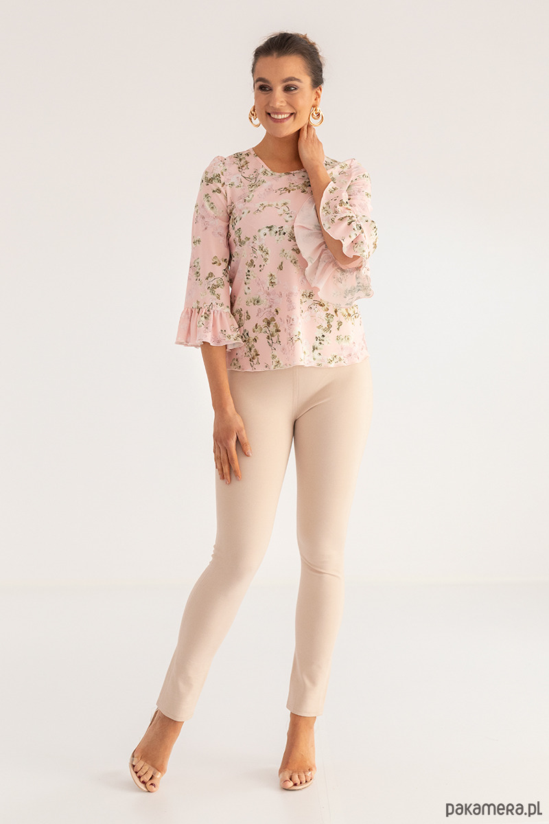 Bluzka uszyta z cienkiej tkaniny w kolorze bladego różu w motyw storczyków. Luźny fason lekko poszerzony ku dołowi, trochę elastyczny. Rękawy 3/4 rozkloszowane w falbankami. Długość około 65 cm. Modelka na zdjęciu ma 180 cm. Przed zakupem prosimy o dokładne zmierzenie sylwetki.