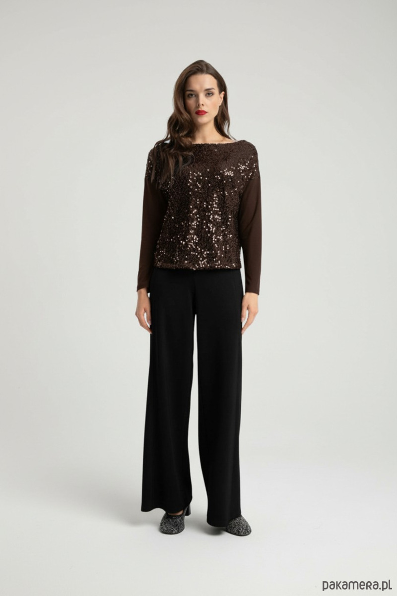 Brązowa, dzianinowa bluzka z długim rękawem.