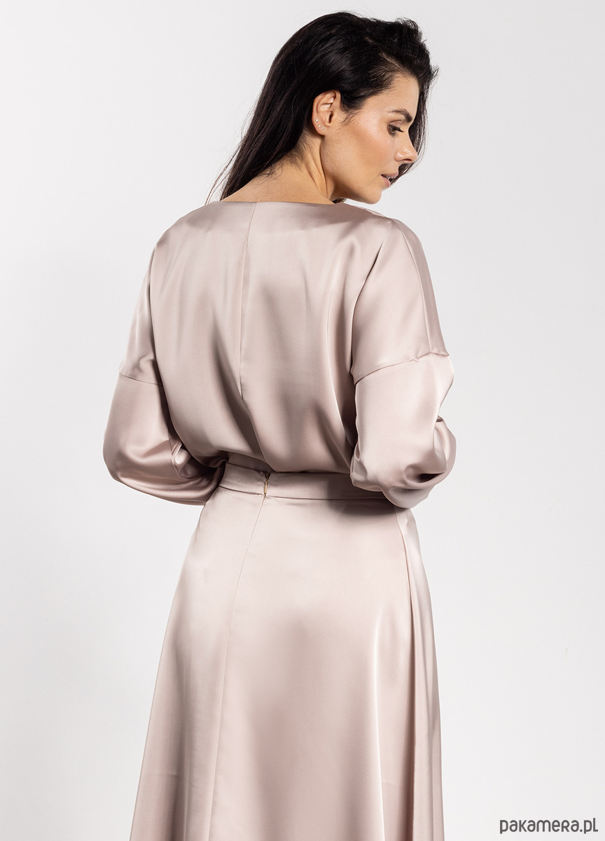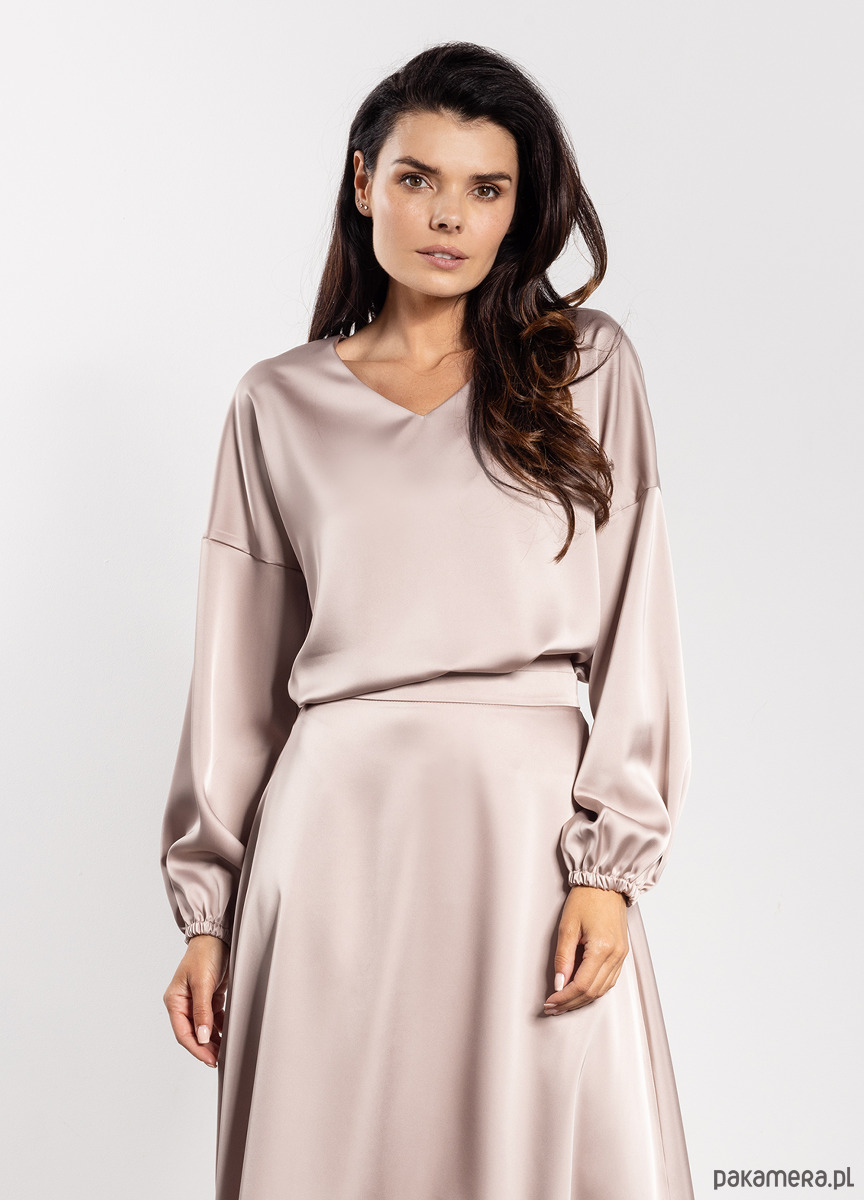 Satynowa bluzka o luźnym fasonie łączy wygodę z elegancją. Subtelny połysk materiału dodaje szyku, dzięki czemu model sprawdzi się zarówno w codziennych stylizacjach, jak i podczas wyjątkowych okazji. Dekolt w kształcie litery V wysmukla szyję i podkreśla kobiecy charakter, a lekko marszczone przy mankietach długie rękawy wprowadzają delikatność i lekkość. Uniwersalny krój pozwala łatwo dopasować bluzkę zarówno do spódnicy, jak i klasycznych spodni, tworząc stylizacje pełne elegancji i komfortu.