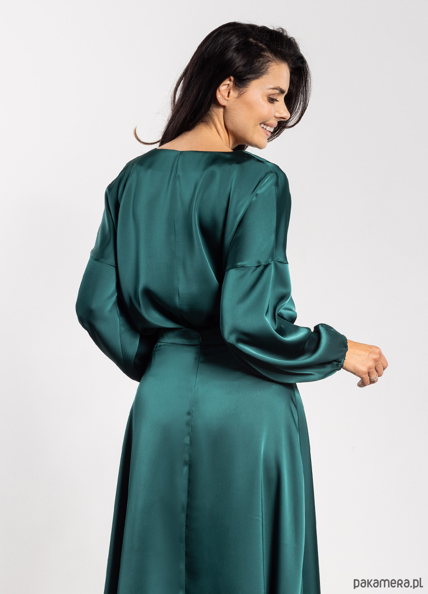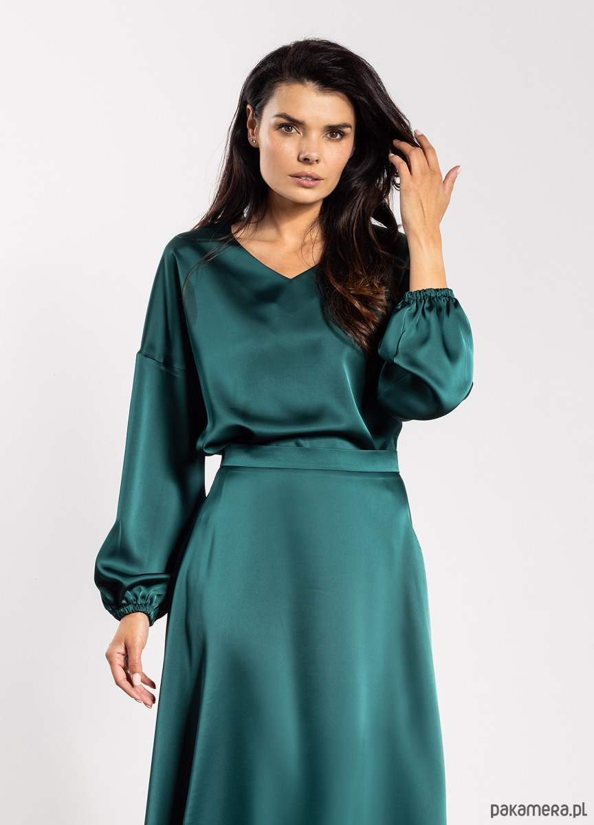 Satynowa bluzka o luźnym fasonie łączy wygodę z elegancją. Subtelny połysk materiału dodaje szyku, dzięki czemu model sprawdzi się zarówno w codziennych stylizacjach, jak i podczas wyjątkowych okazji. Dekolt w kształcie litery V wysmukla szyję i podkreśla kobiecy charakter, a lekko marszczone przy mankietach długie rękawy wprowadzają delikatność i lekkość. Uniwersalny krój pozwala łatwo dopasować bluzkę zarówno do spódnicy, jak i klasycznych spodni, tworząc stylizacje pełne elegancji i komfortu.