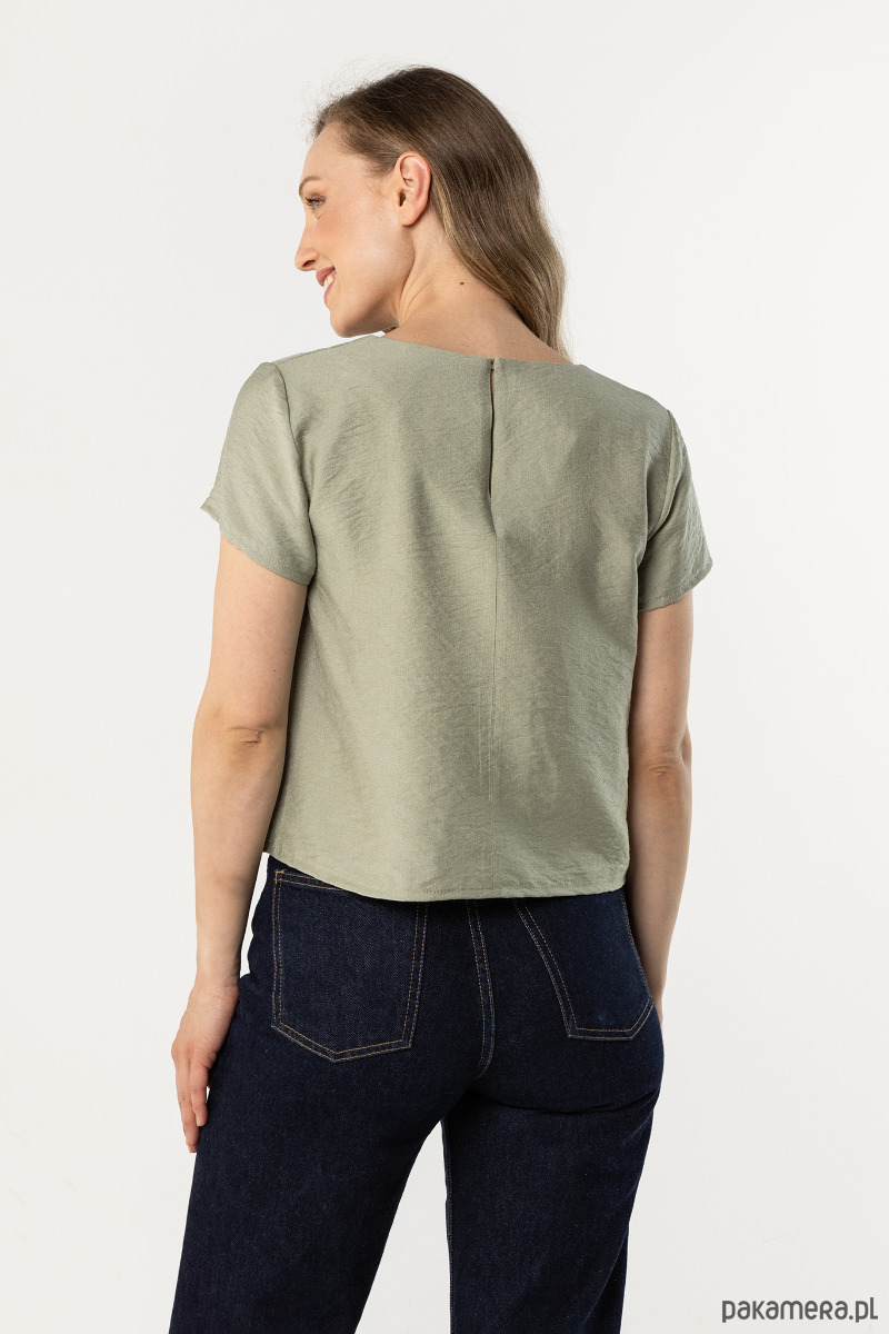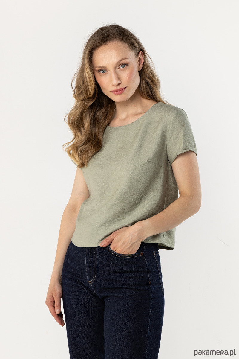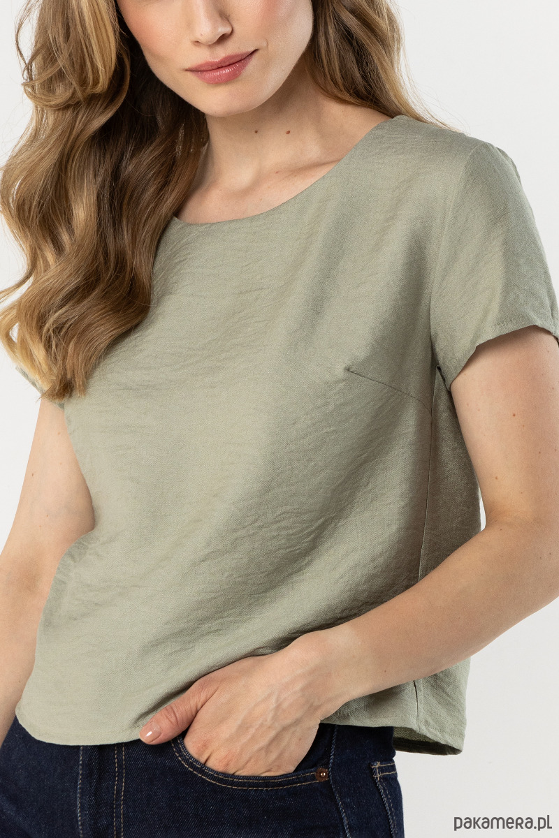 Bluzka w subtelnym, szałwiowym odcieniu o prostym, swobodnym kroju z krótkim rękawem i delikatnym, zaokrąglonym dekoltem. Lekki materiał miękko układa się na sylwetce, zapewniając komfort noszenia. Minimalistyczny fason sprawdzi się zarówno na co dzień, jak i w eleganckich stylizacjach.
