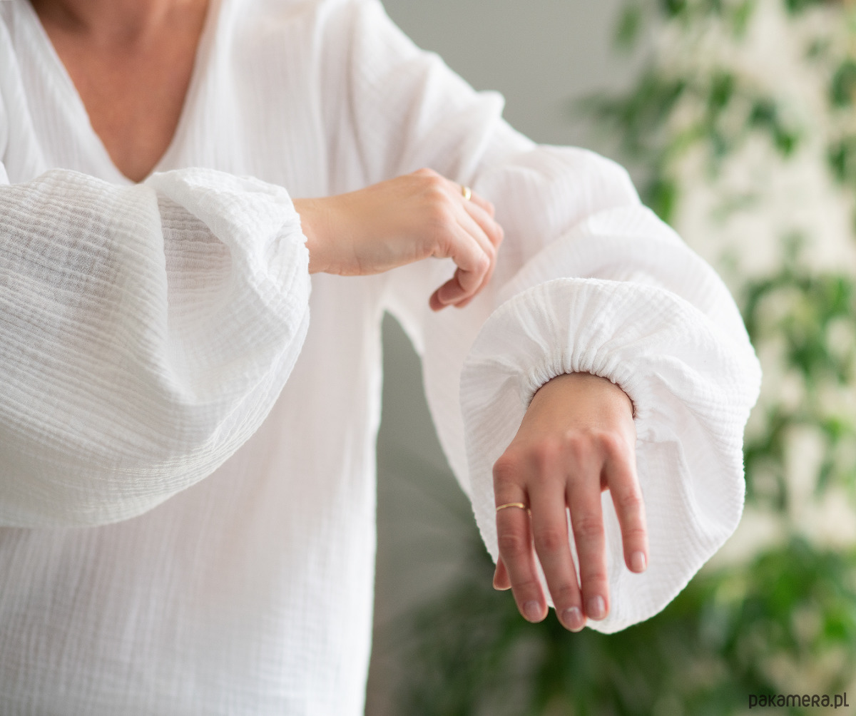 Biała bluzka WHITE ORGANIC z certyfikowanej bawełny organicznej GOTS. Wyjątkowy model stworzony na wiele okazji oraz sezonów. Elegancka, kobieca w najmodniejszym wydaniu a do tego ekologiczna. Bluzkę można nosić na wiele sposobów, włożoną do środka, luzem lub wiązana w pasie. Naturalny materiał Double Gauze GOTS jest to 100 % czysta, ekologiczna, certyfikowana bawełna. Niezwykle przyjemny, przewiewny, Ekologiczny MUŚLIN, przyjazny dla naszej skóry oraz bezpieczna dla naszego środowiska. Certyfikowany Naturalny material jest w 100 % Biodegradowalny.