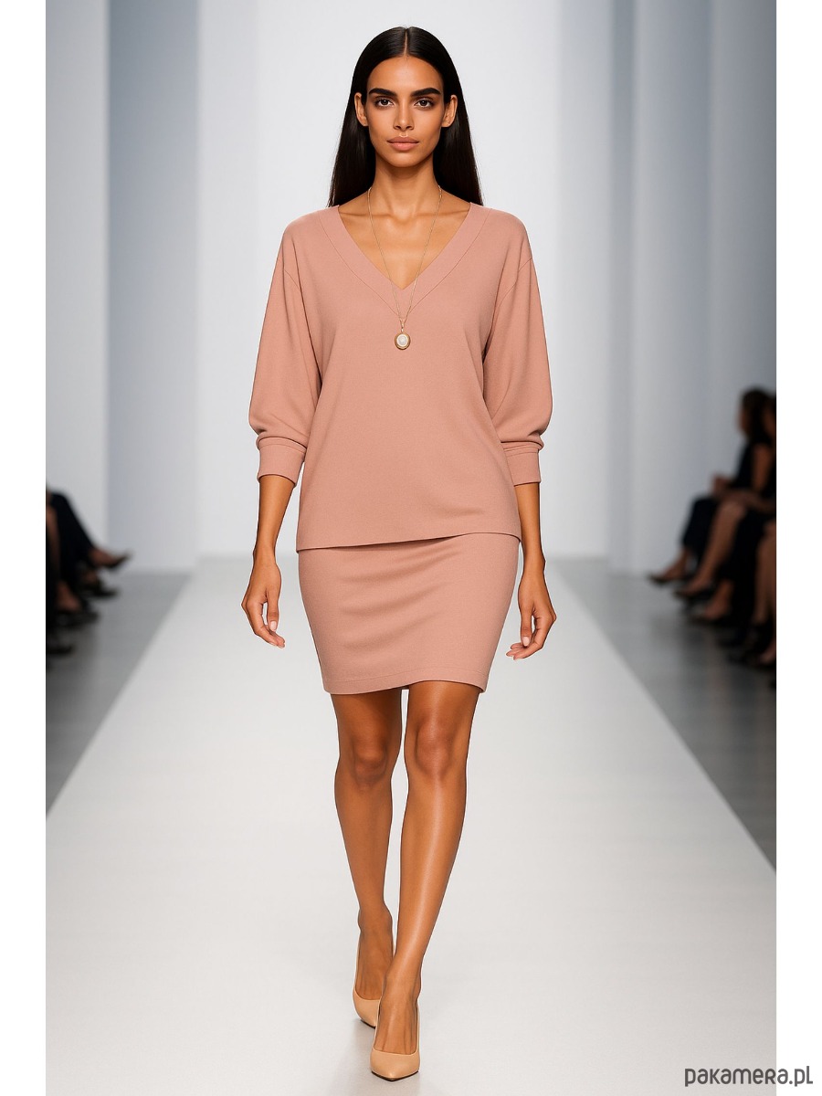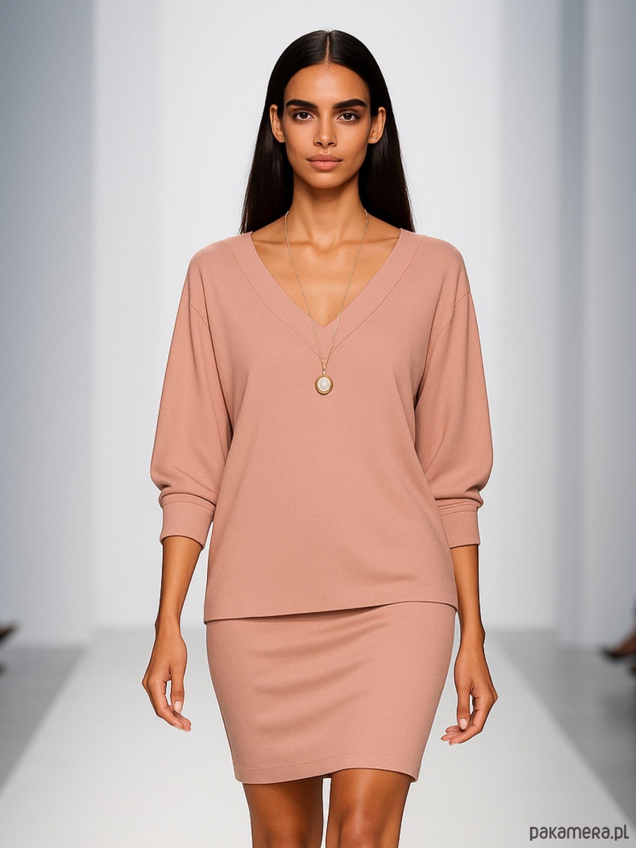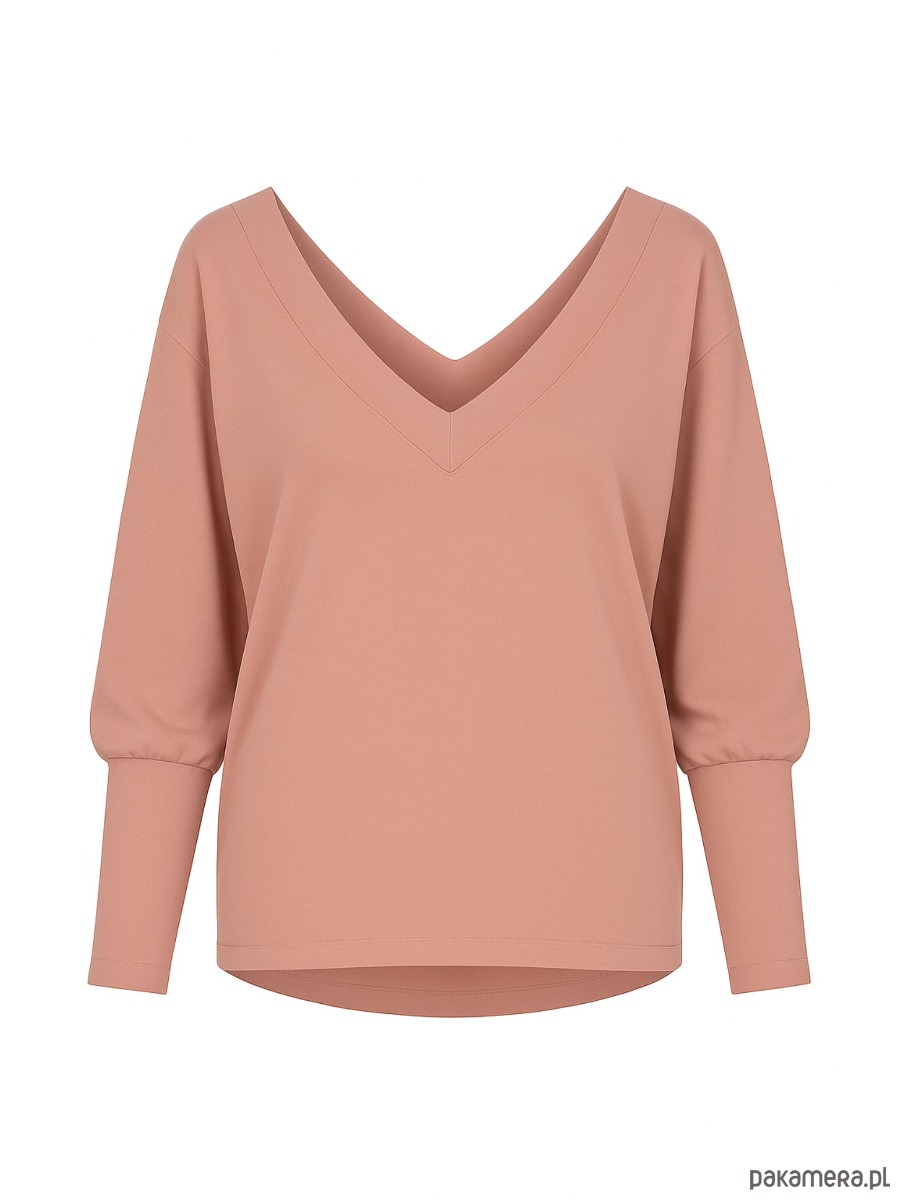 Bluzka luźna. Krój luźny; typ „nietoperz”; dekolt w szpic. Wykonana z naturalnej dzianiny wysokiej jakości; tkanina przyjemna dla ciała, przewiewna, rozciągliwa. Długość rękawa: ok. 61 cm; długość przodu: ok. 63 cm; długość tyłu: ok. 72 cm. Dzianina naturalna: wiskoza 95%, elastan 5%. Kolor: brudny.róż . Sposób konserwacji: pranie w pralce w temp. 30 stopni; suszenie w stanie rozwieszonym; prasowanie parą.