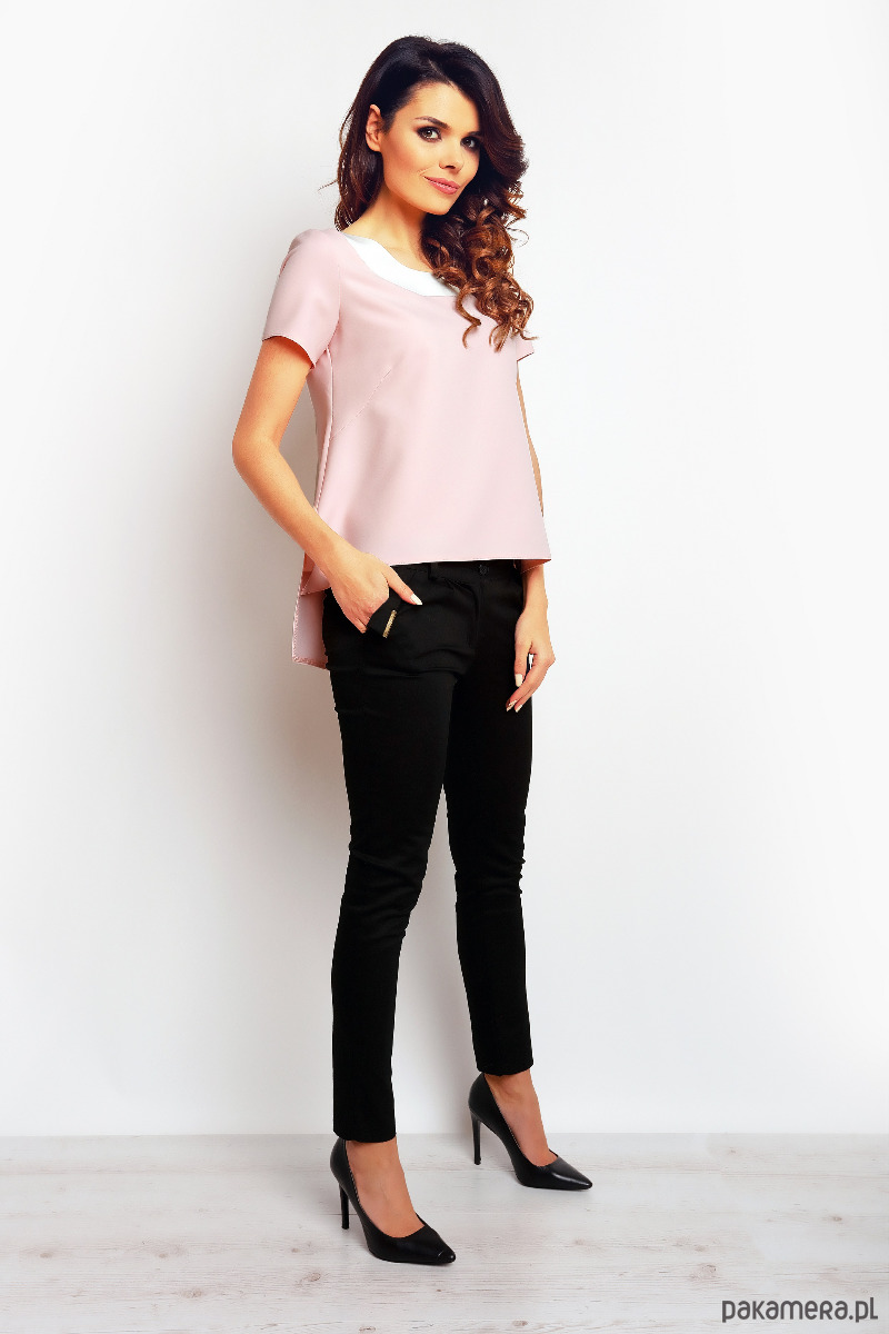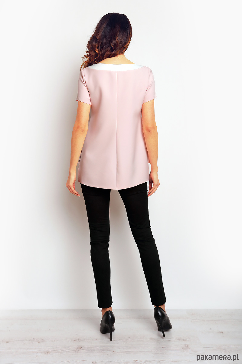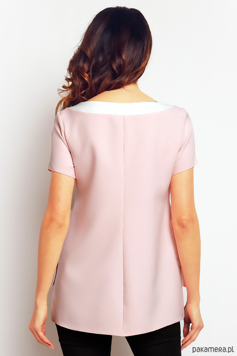 Stylowa bluzka z krótkim rękawem i wydłużonym tyłem.