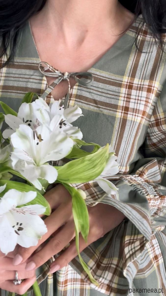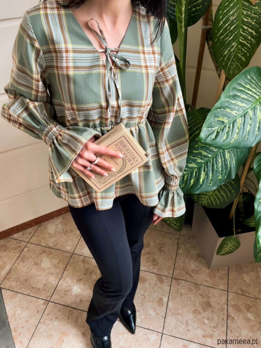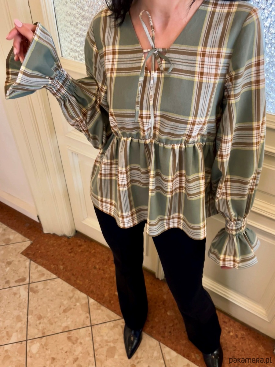 Bawełniana bluzka Franka w kratę – szałwiowo-brązowa