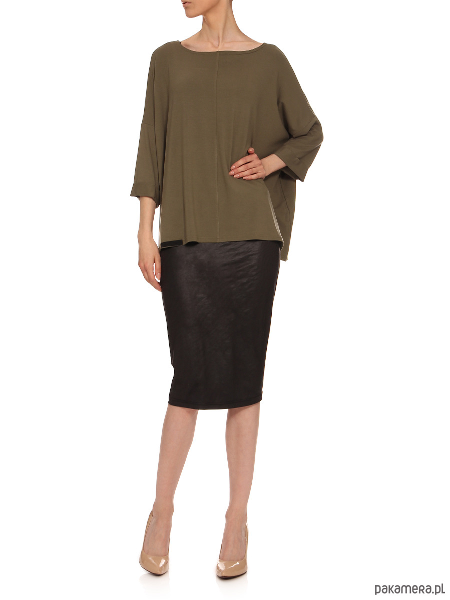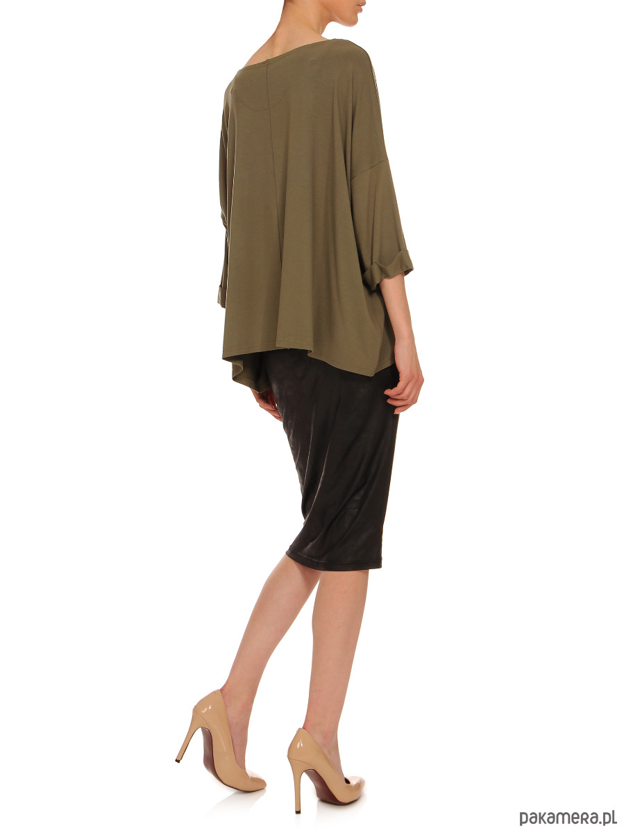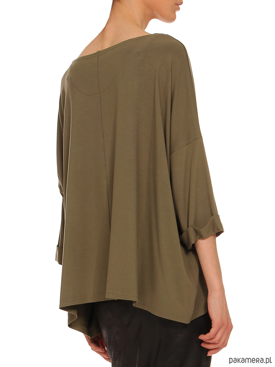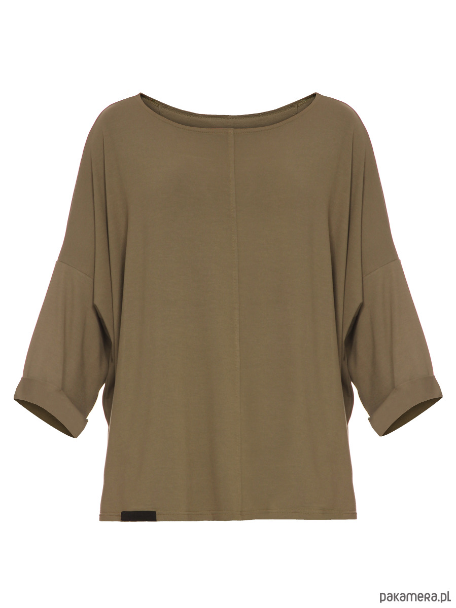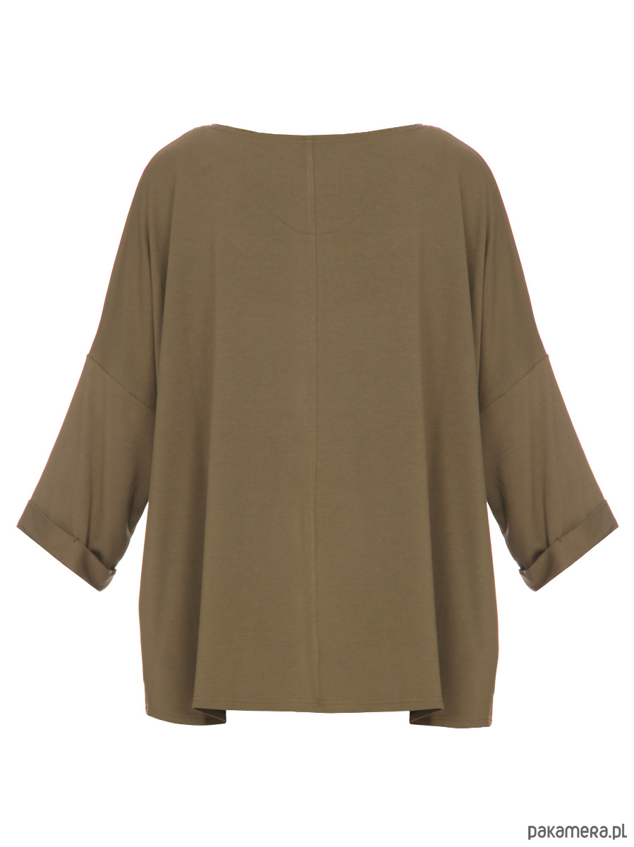 Bluzka o luźnym kroju; uniwersalna i wygodna; pozycja obowiązkowa w każdej szafie; idealna do jeansów i spódnic; sportowa elegancja. Kolor: khaki RAL6007. Długość rękawów ok. 35 cm; długość ok. 62 cm. Tkanina: 60% wiskoza, 35% poliamid, 5% elastan. Sposób konserwacji: pranie w pralce w 30° C