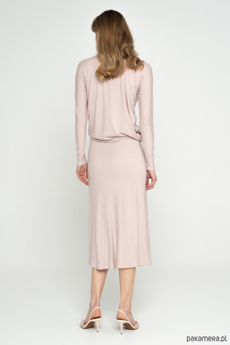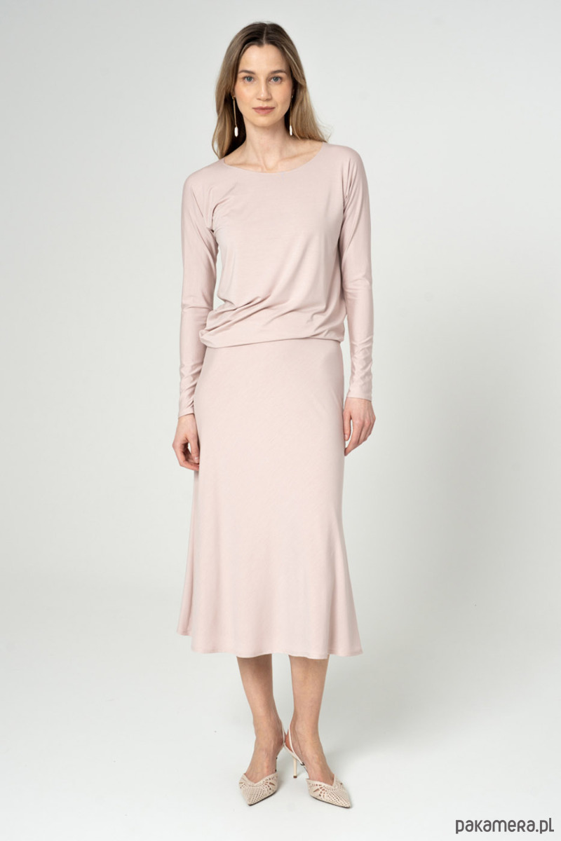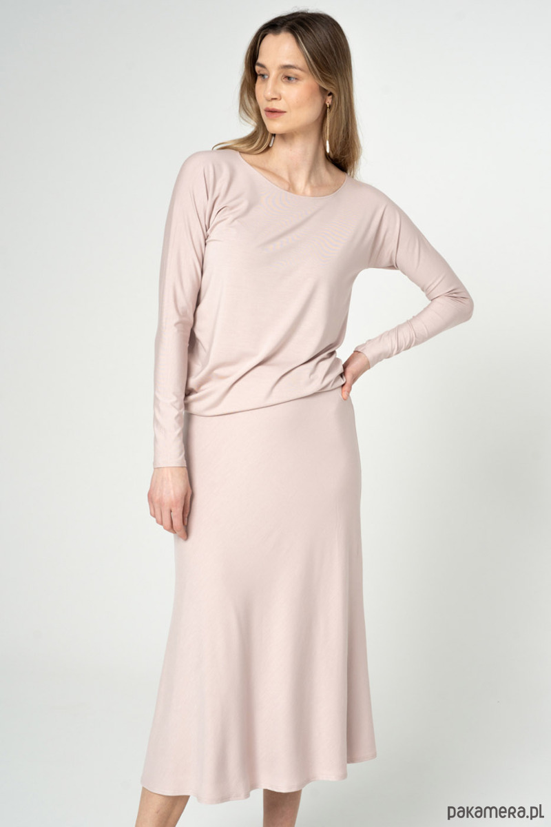 Bluzka z drapowanym bokiem i wąskim rękawem. Uszyta z modalowej dzianiny, która jest naturalna i wyjątkowa odporna na uszkodzenia. Nie mechaci się, nie zmienia swojej formy i daje duży komfort noszenia. Fason – luźny i wygodny ukrywający niedoskonałości sylwetki.