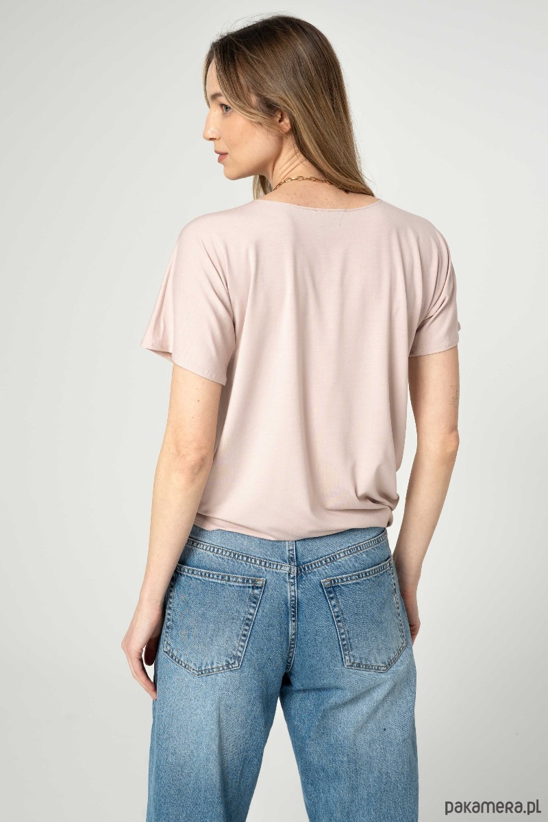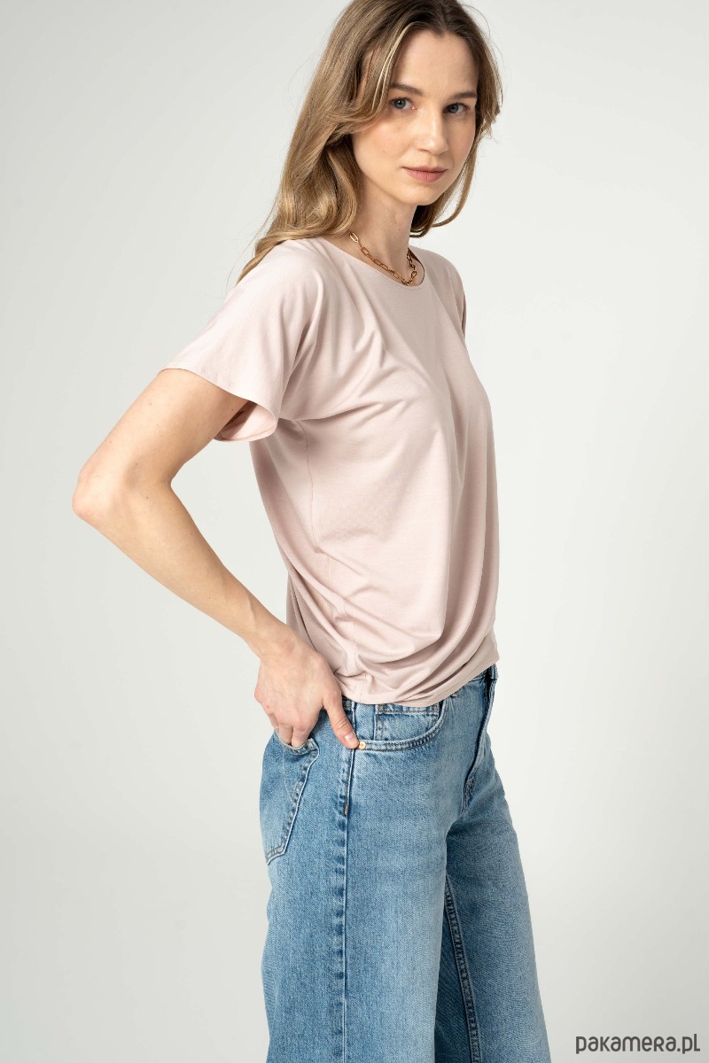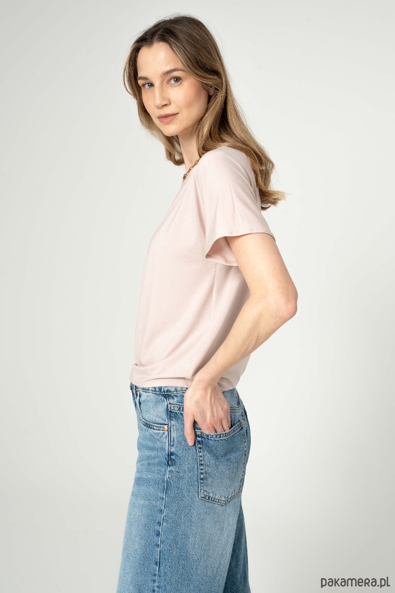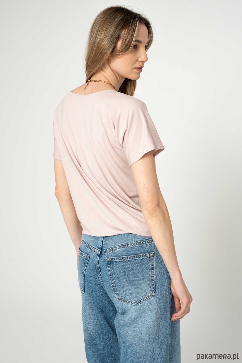 Bluzka z drapowaniem na jednym z boków. Rękaw szeroki, t-shirtowy. Dekolt w łudkę.