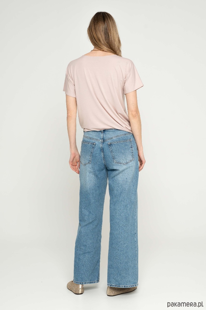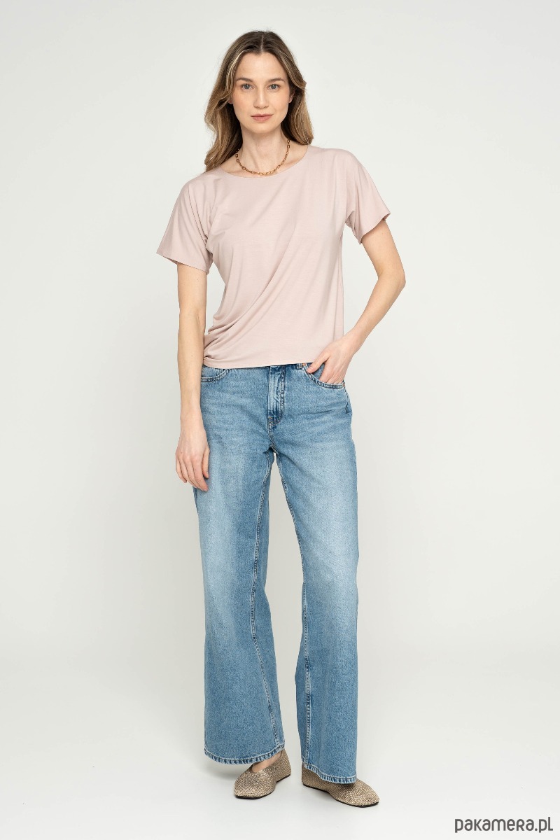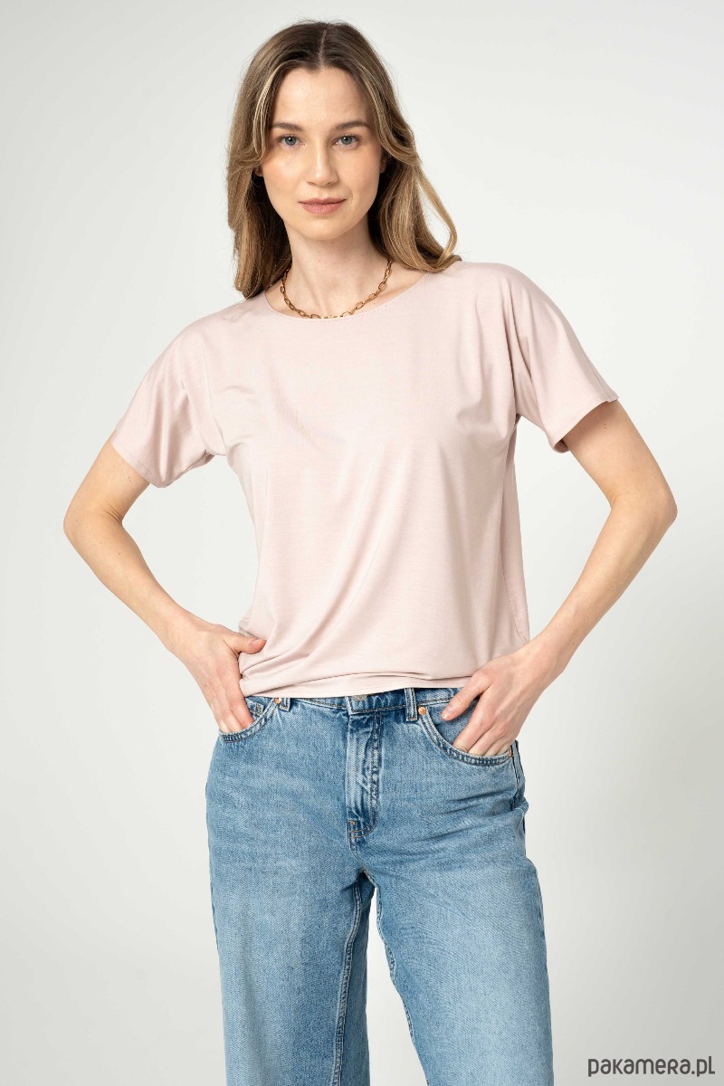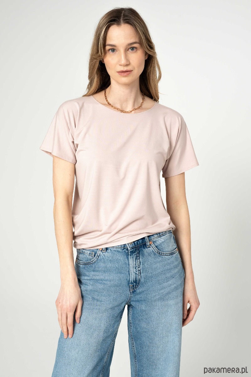 Bluzka z drapowaniem na jednym z boków. Rękaw szeroki, t-shirtowy. Dekolt w łudkę.