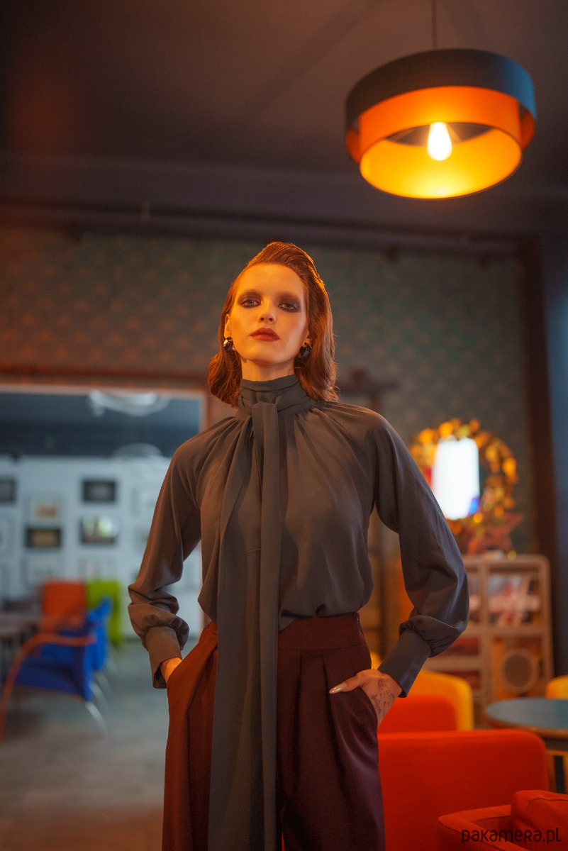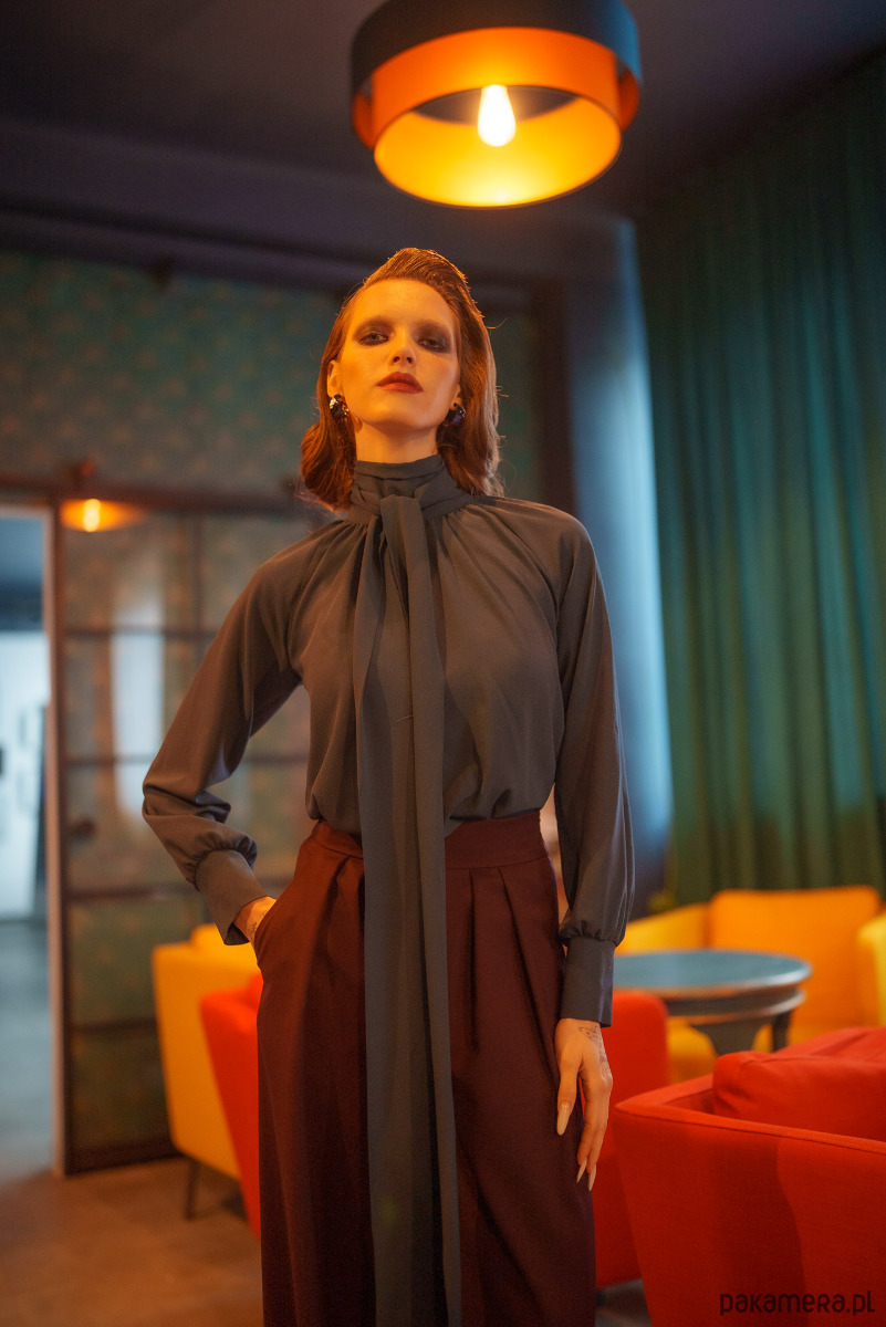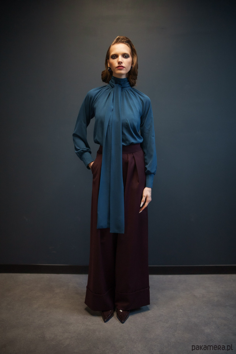 Styl: Klasyczny krój z modnymi akcentami, takimi jak wiązanie pod szyją na półgolfie oraz delikatne, subtelne pasy