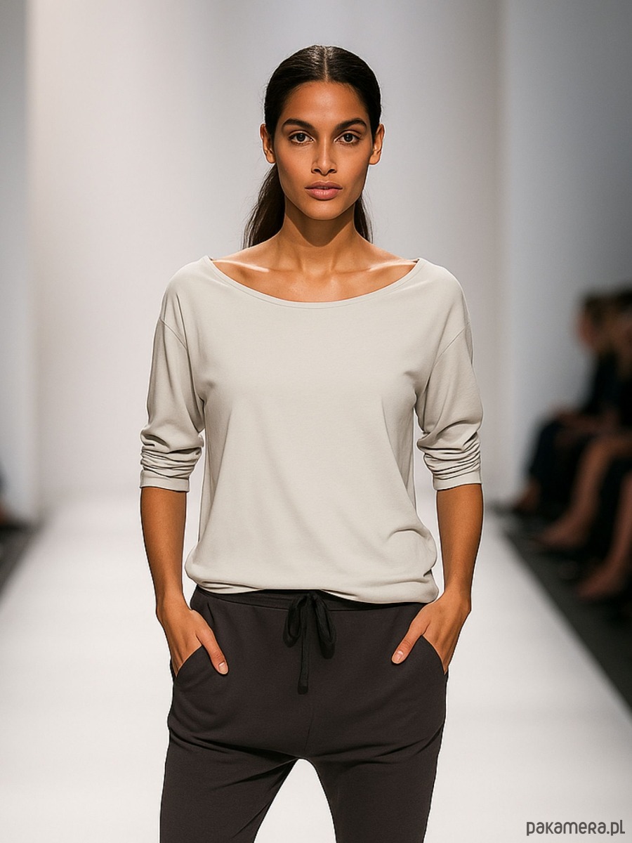 Luźna bluzka; swobodny i niekrępujący fason; dekolt w "łódkę". Rękawy zakończone mankietami; bluzka na co dzień. Wykonana z naturalnej dzianiny wysokiej jakości; tkanina przyjemna dla ciała, przewiewna, rozciągliwa. Materiał o naturalnym składzie przyjemny dla ciała. Kolor bluzki: popielaty RAL9018. Długość bluzki: 60 cm; długość rękawów 40 cm. Dzianina naturalna: 95% wiskoza, 5% elastyn. Pranie w pralce w temp. 30 stopni; suszenie w stanie rozwieszonym; prasowanie parą.