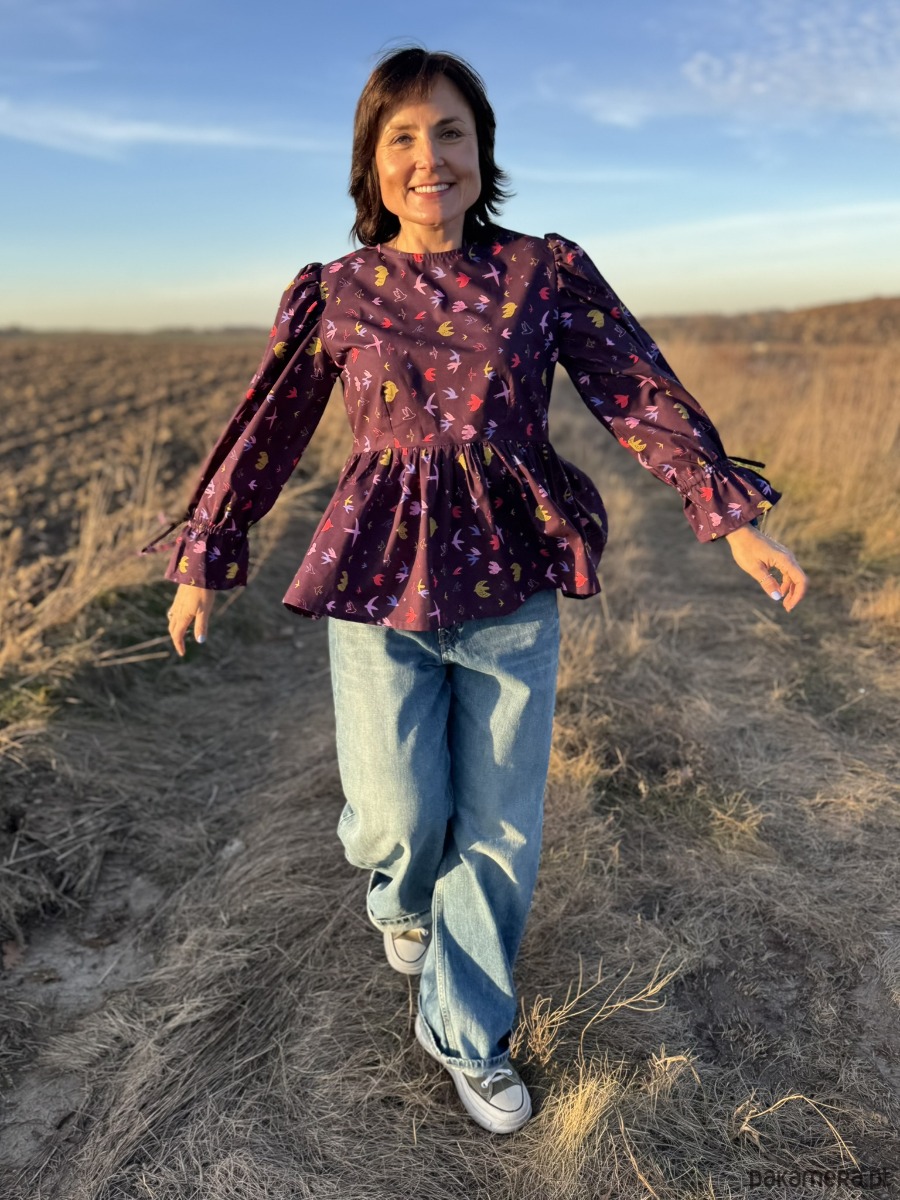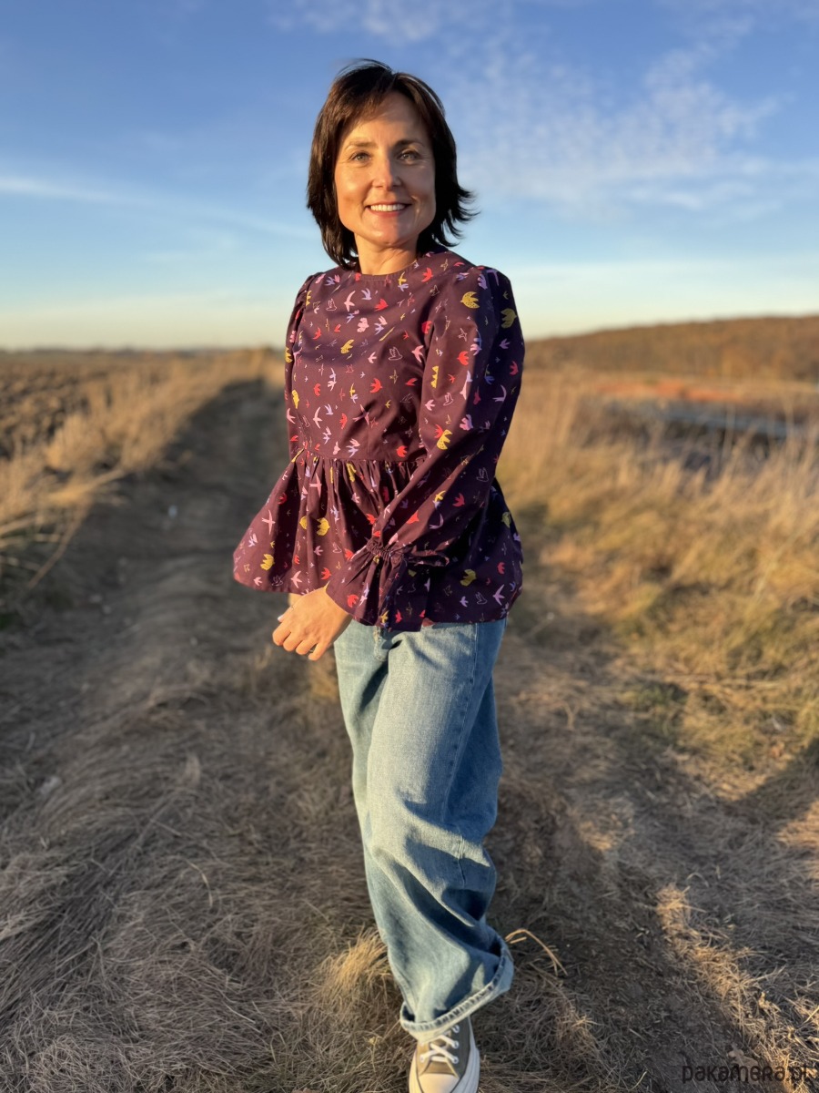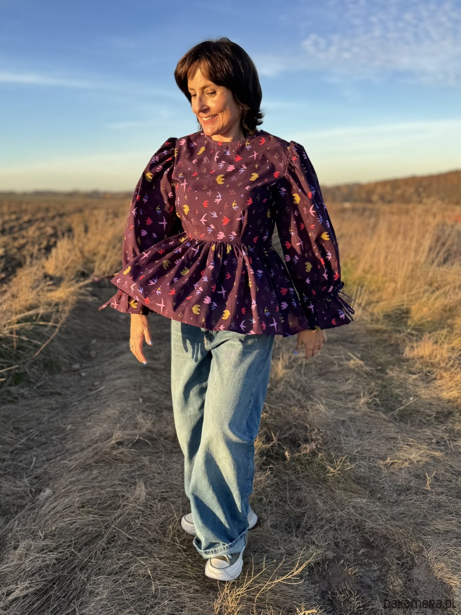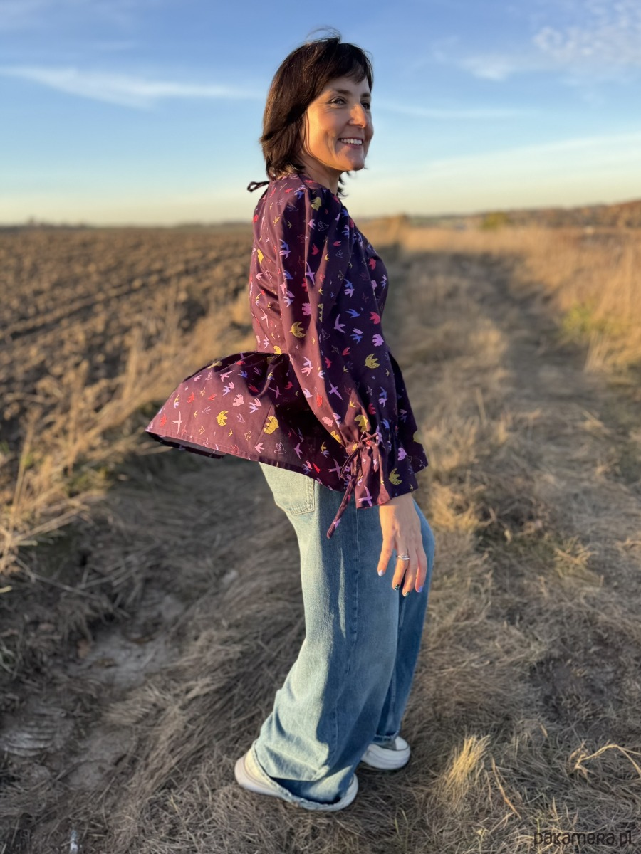 Bluzka to połączenie klasyki z radosnym kolorem – idealna na każdy sezon. Uszyta z naturalnej bawełny w kolorowe jaskółki na ciemnym fiolecie, przyciąga wzrok i dodaje energii niezależnie od pogody.