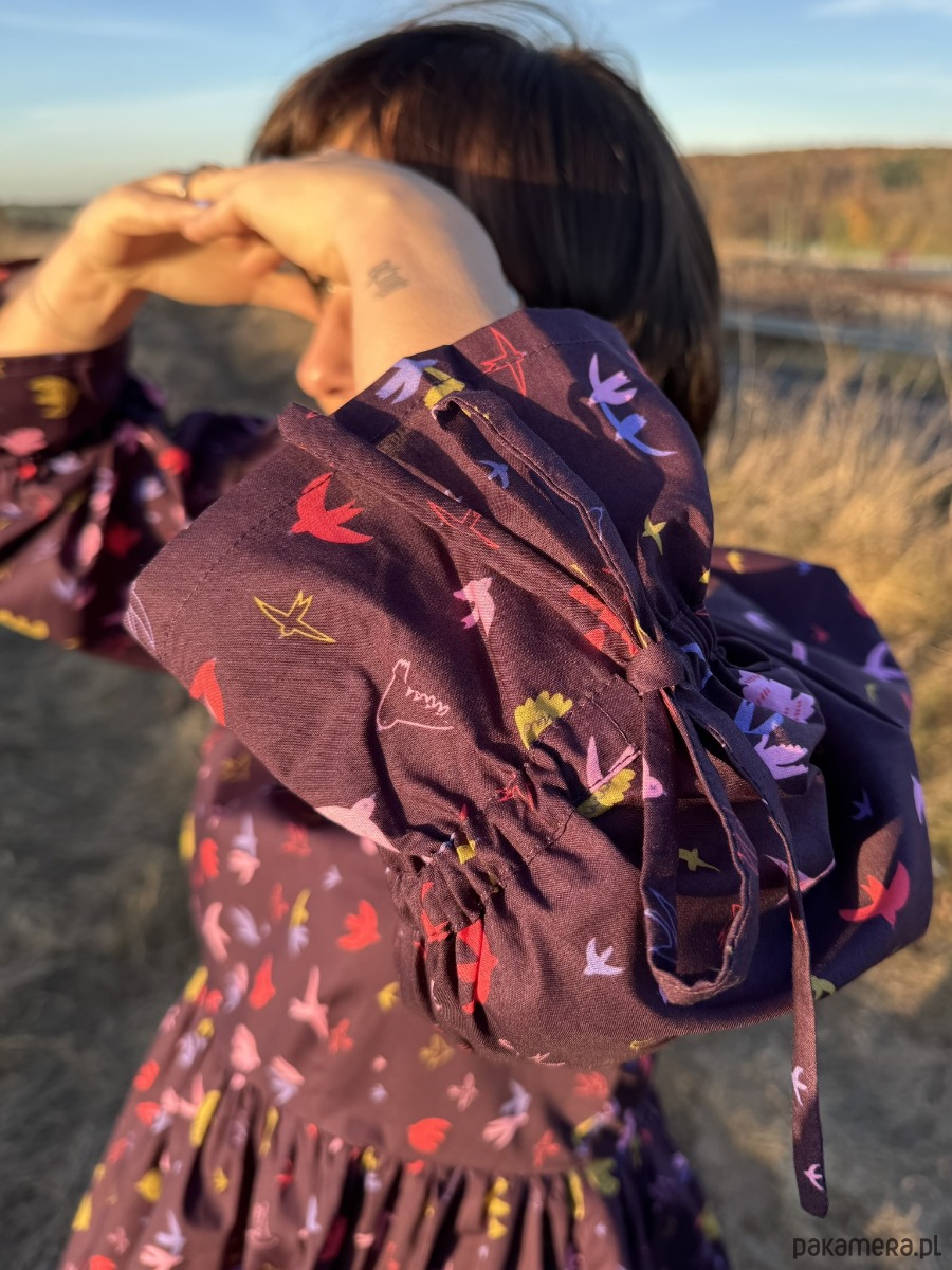 Bufiaste rękawy zakończone wiązaniami i delikatne marszczenia przy talii tworzą kobiecą, romantyczną sylwetkę. Rozkloszowany dół pięknie układa się w ruchu, a subtelne wiązanie z tyłu dodaje elegancji.