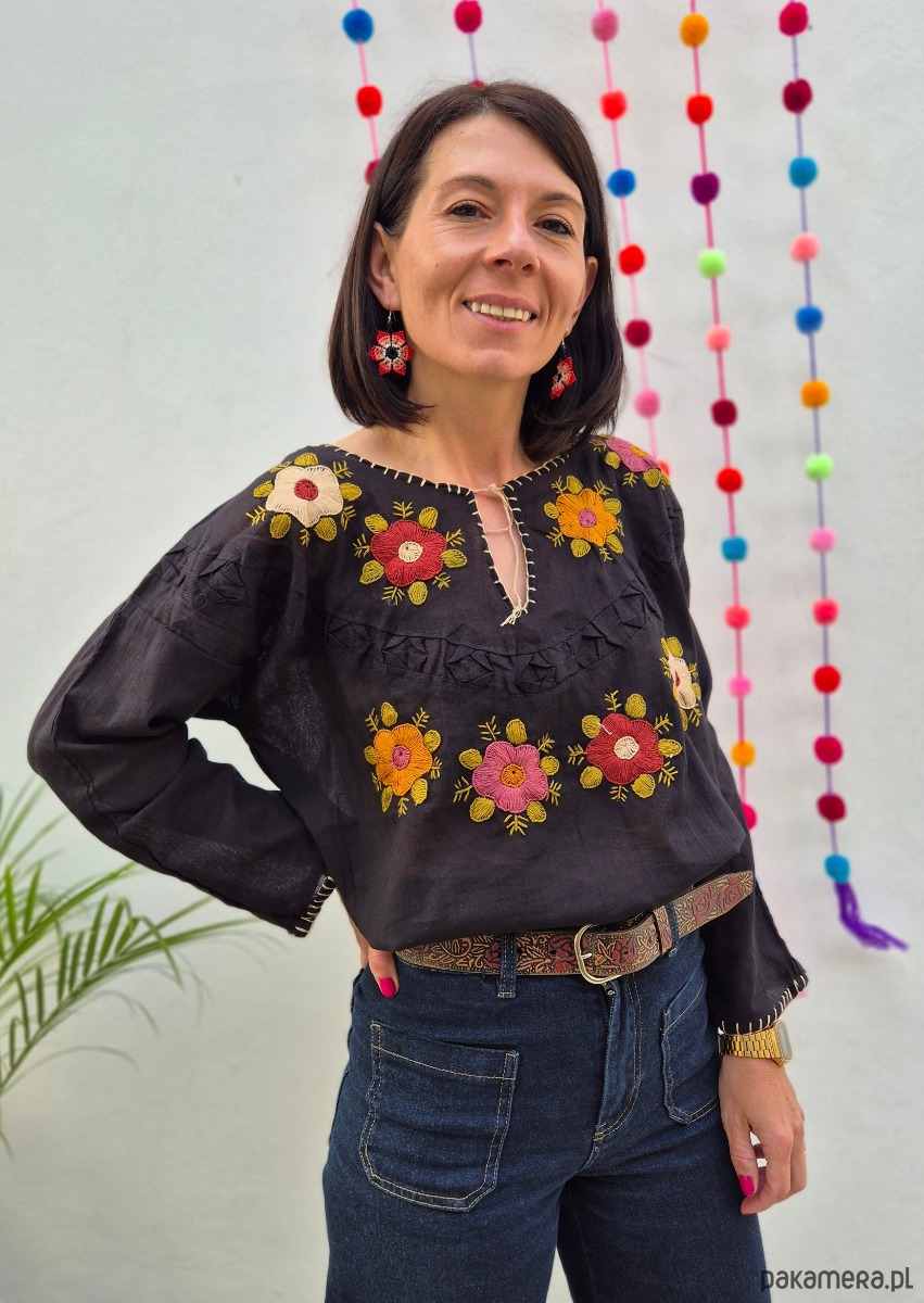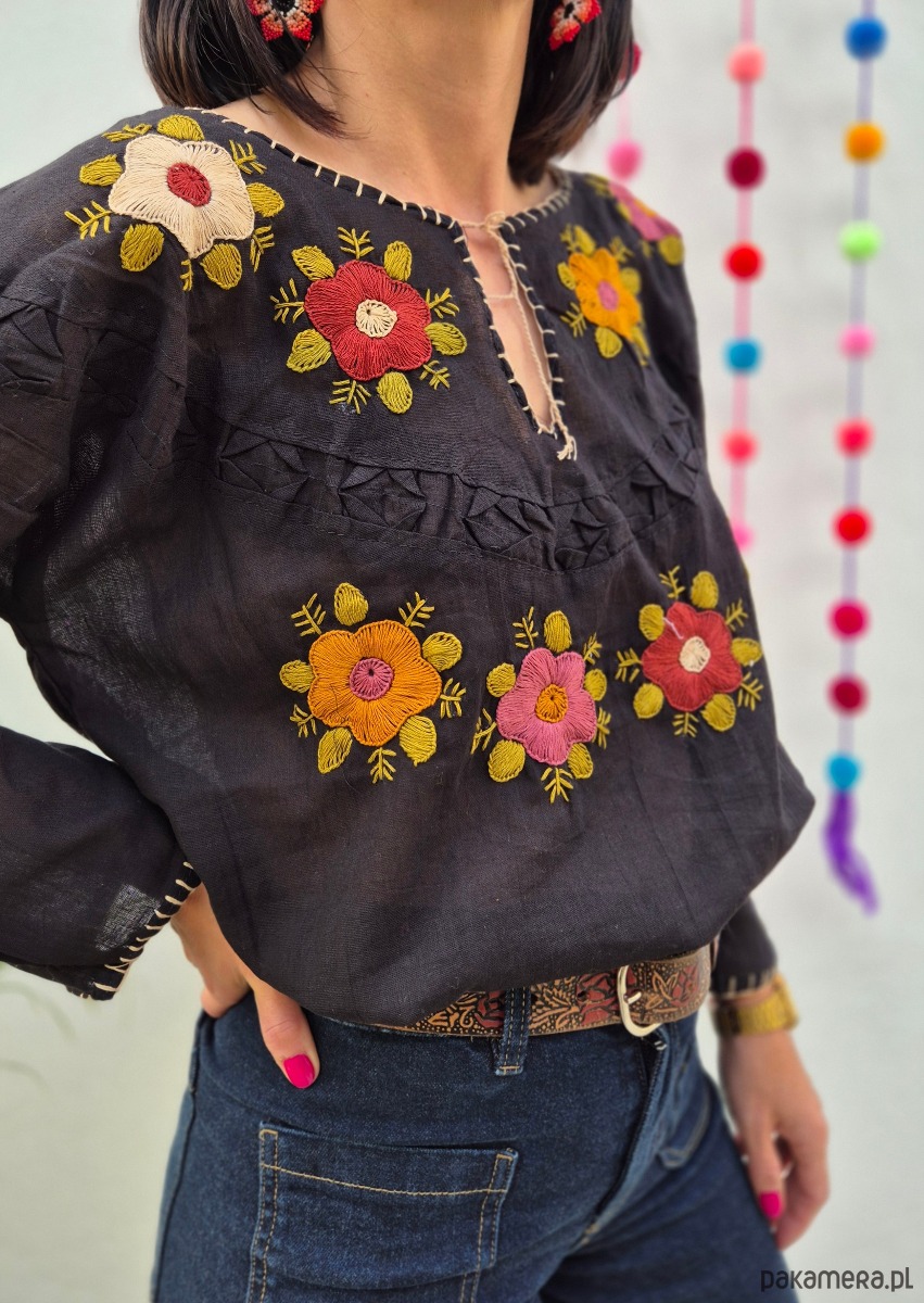 Bluzka ręcznie haftowana CAMA Czarna kwiaty ONE SIZE