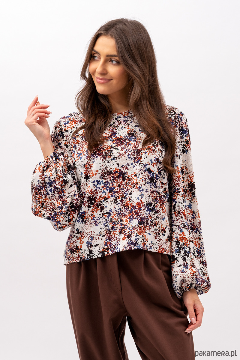 Charakterystyka: Wiązanie w dekolcie – kobiecy i uniwersalny akcent. Szeroki, przewiewny rękaw zakończony gumką.