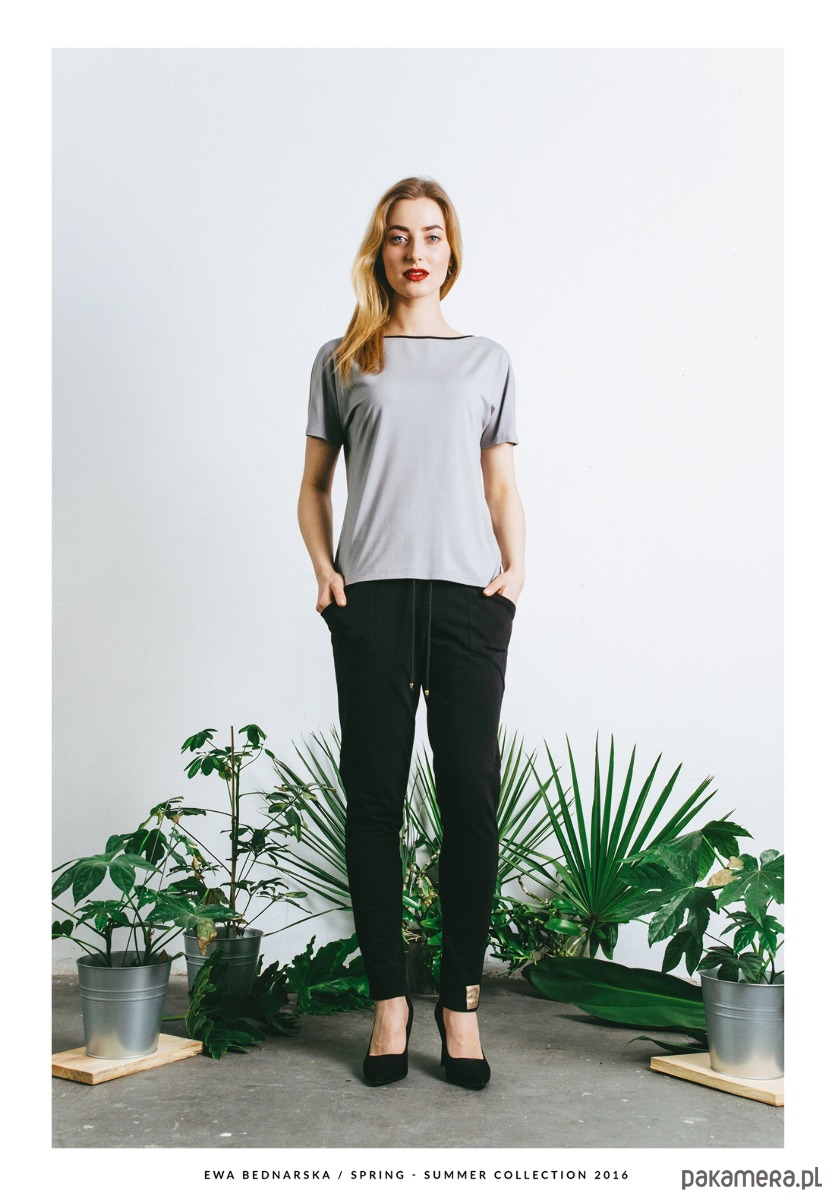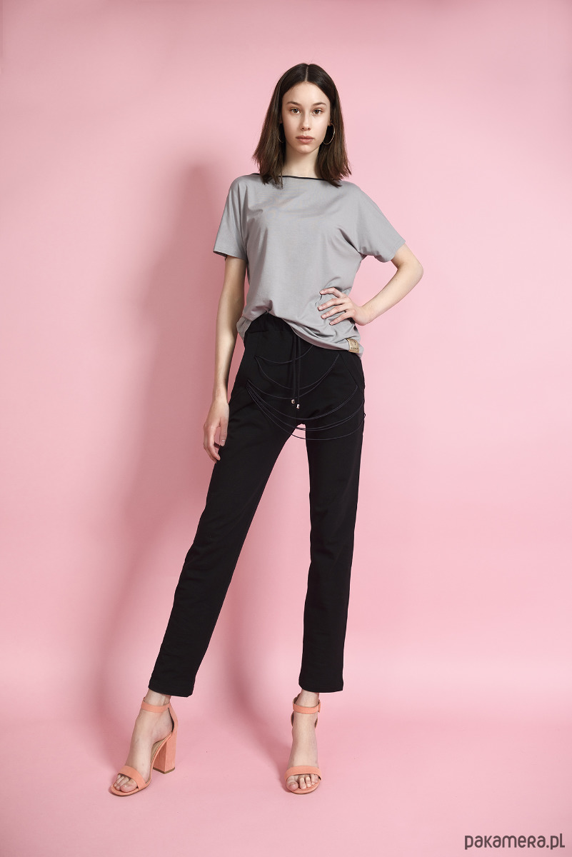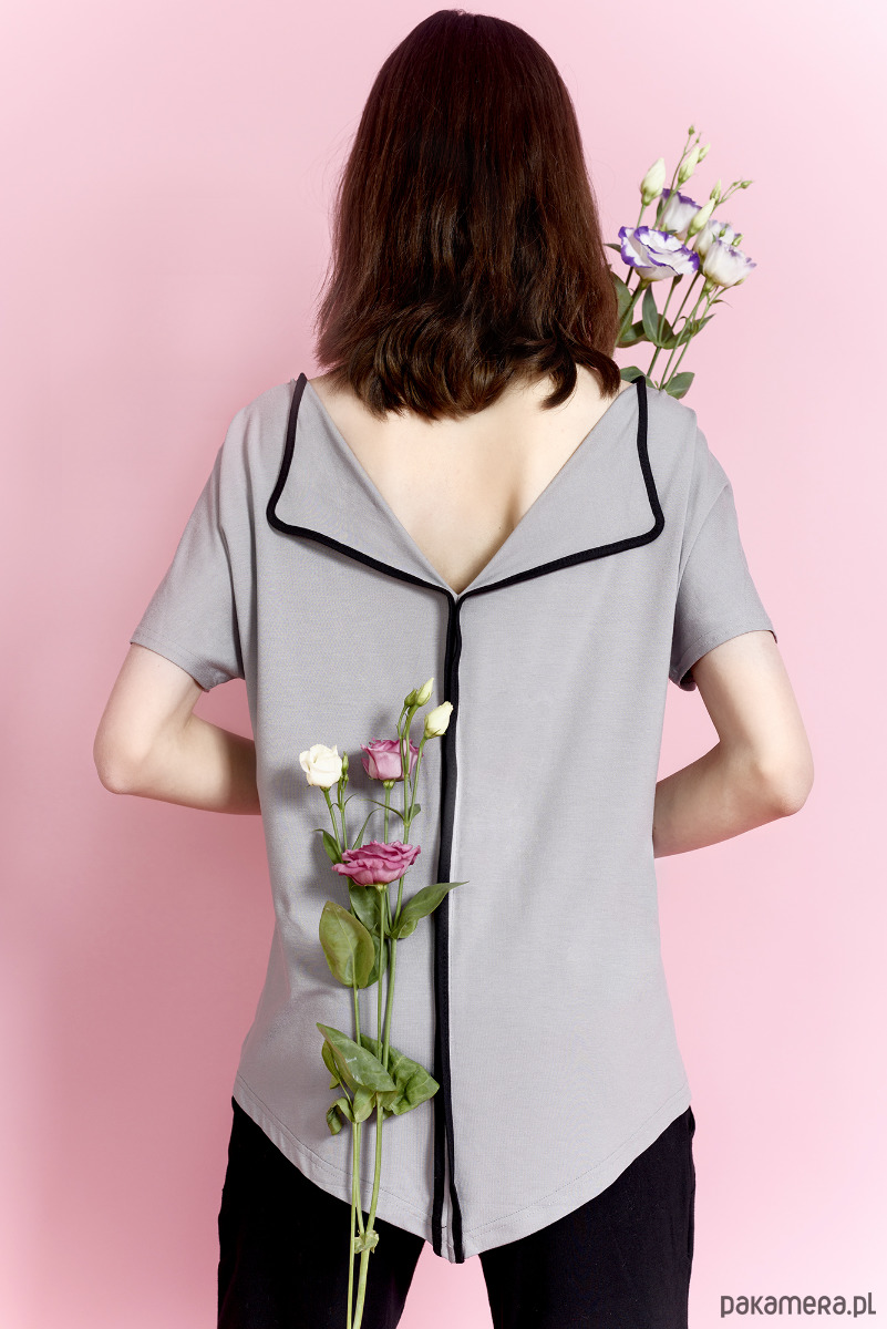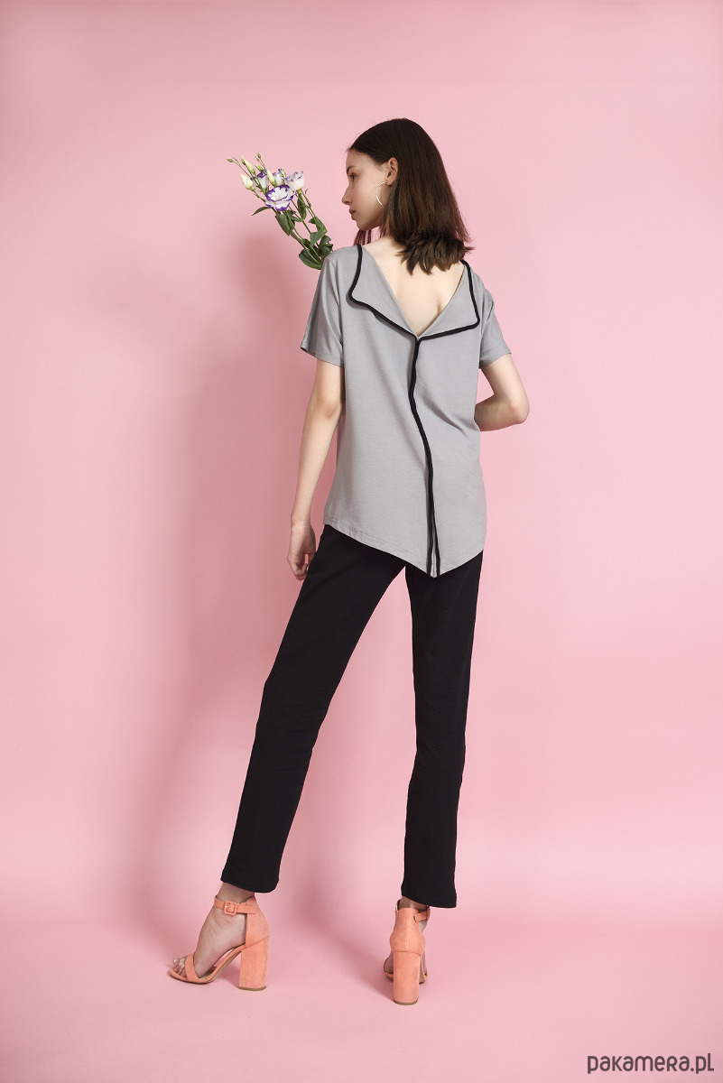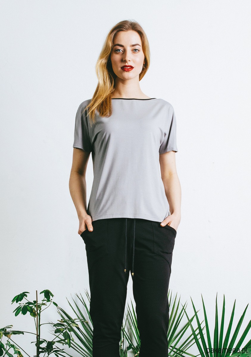 Bluzka z bardzo przyjemnej w dotyku dzianiny wiskozowej produkowanej w Polsce,w kolorze szarym z wykończeniem czarną lamówką. Rękaw opadający, tył dłuższy z ciekawym dekoltem. Produkt w całości uszyty w Polsce.