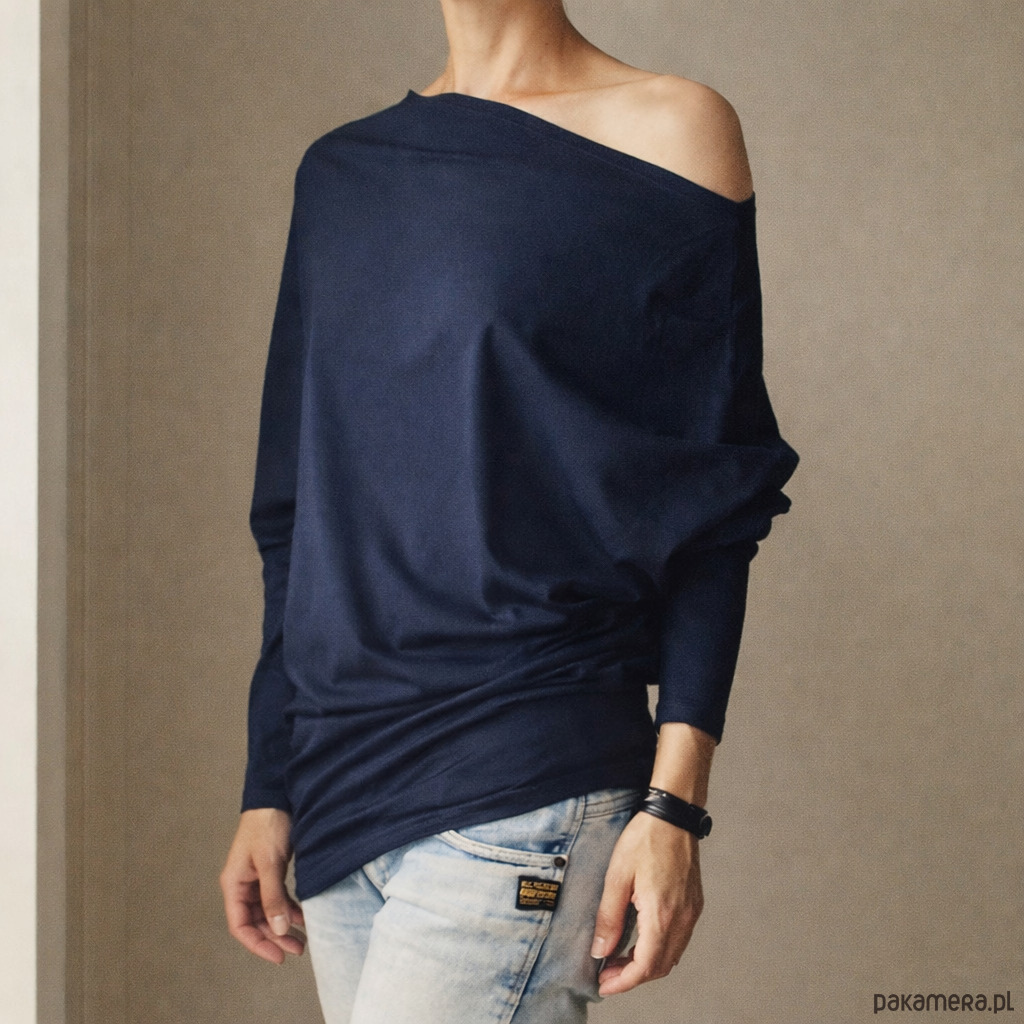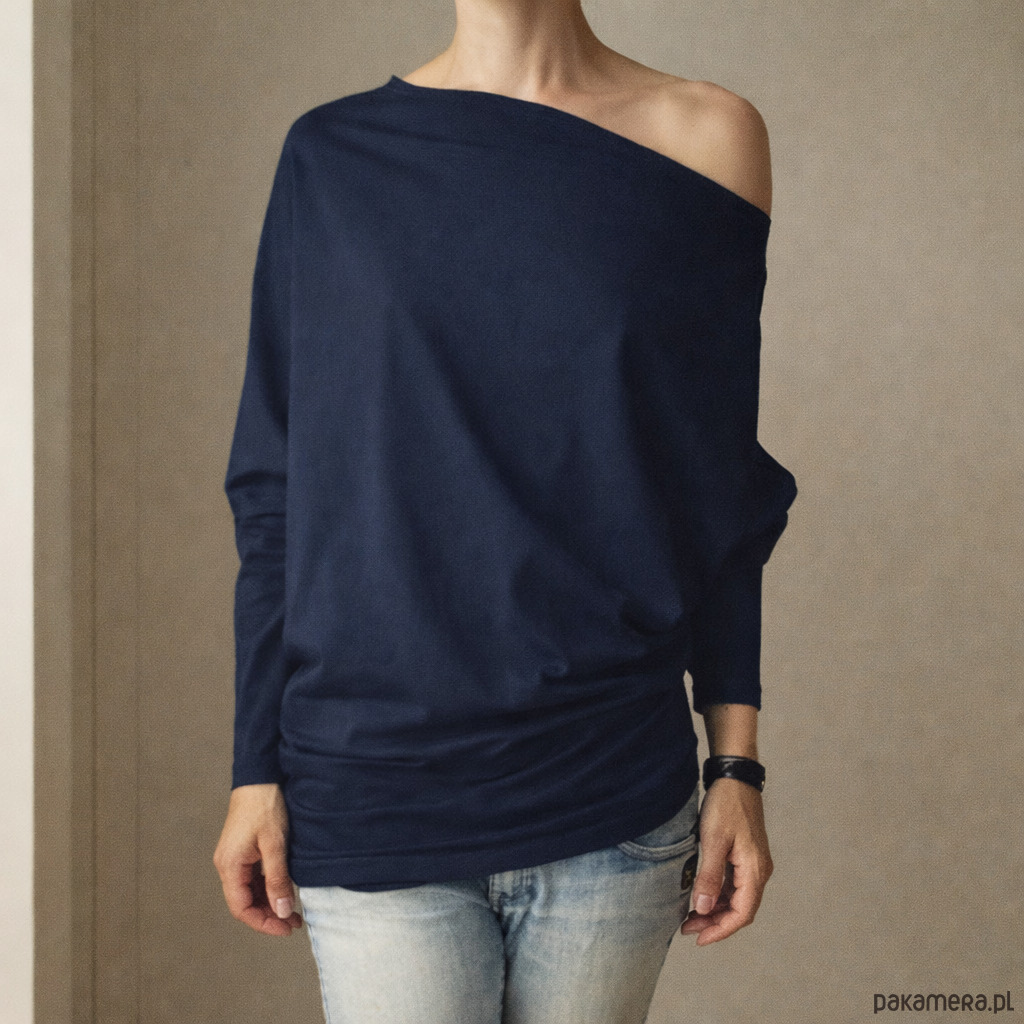Granatowa bluzka o asymetrycznym kroju. Nawiązuje trochę do lat 80tych i 90tych, luźna, kobieca, bardzo wygodna.