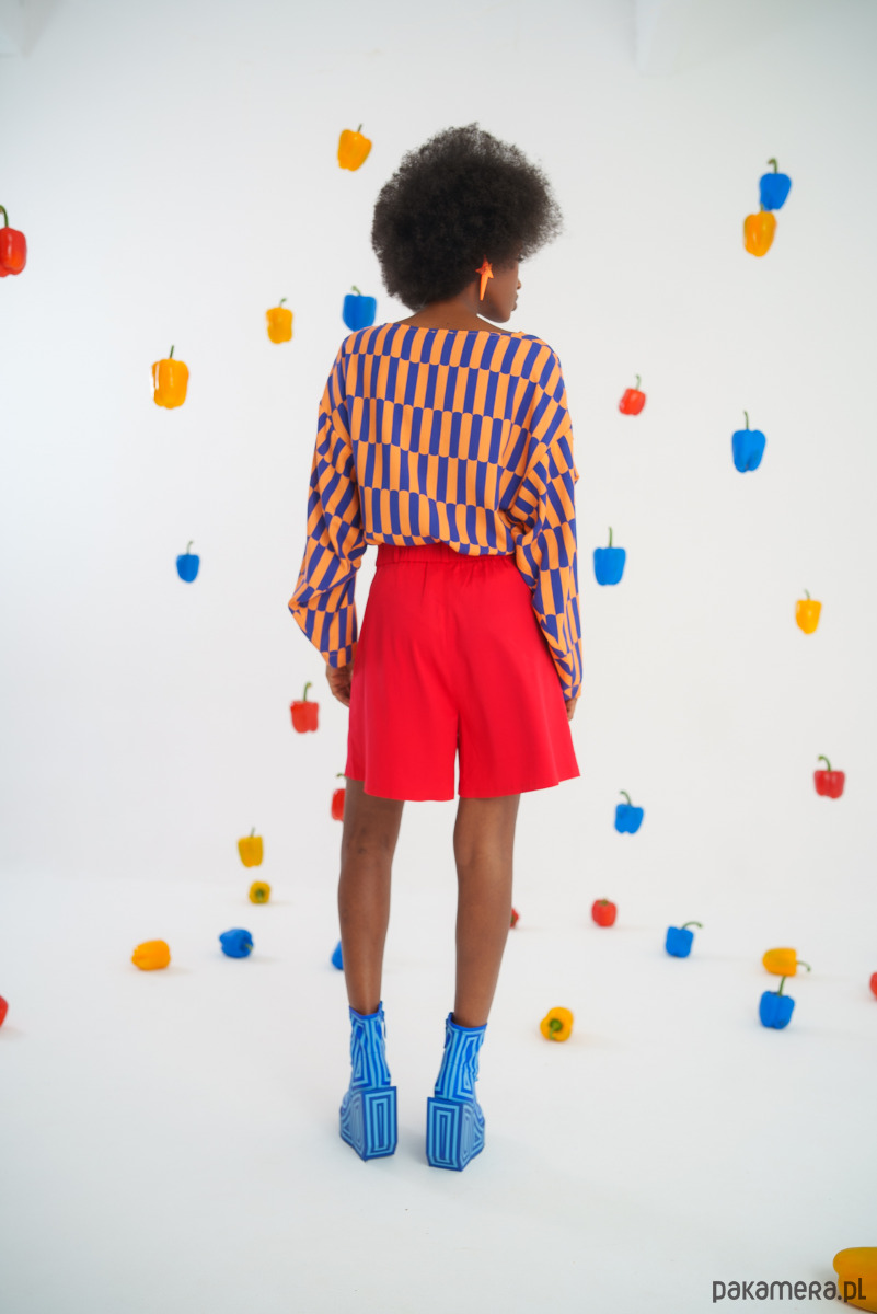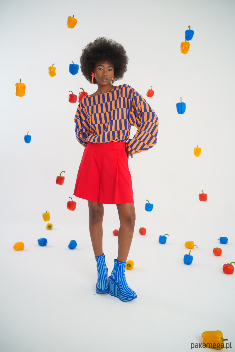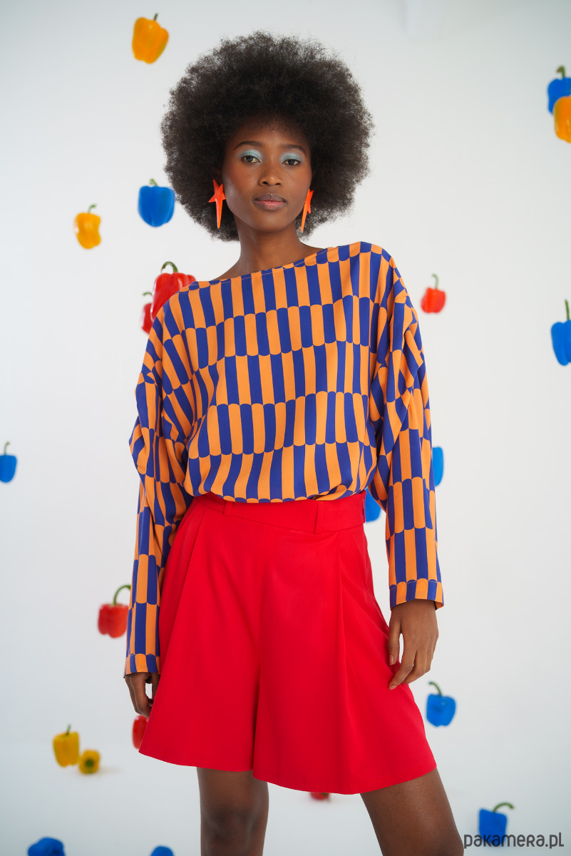 Stylowa bluzka damska, która łączy elegancję z artystycznym akcentem. Model inspirowany nowoczesnym designem, idealny dla kobiet, które cenią sobie unikalność i pragną wyrażać swoją osobowość poprzez odważne kolory i wzory.