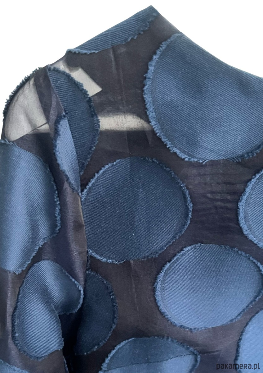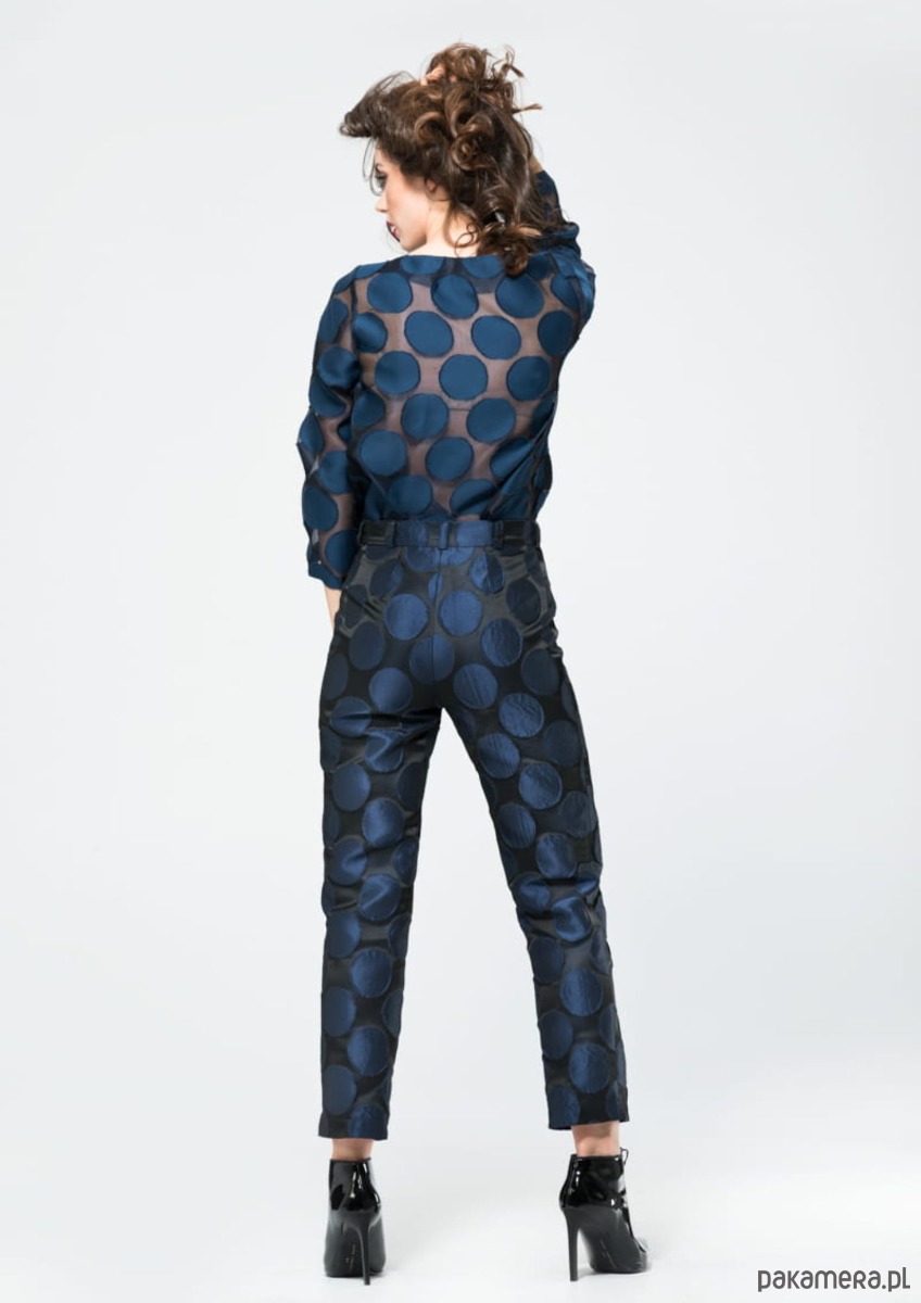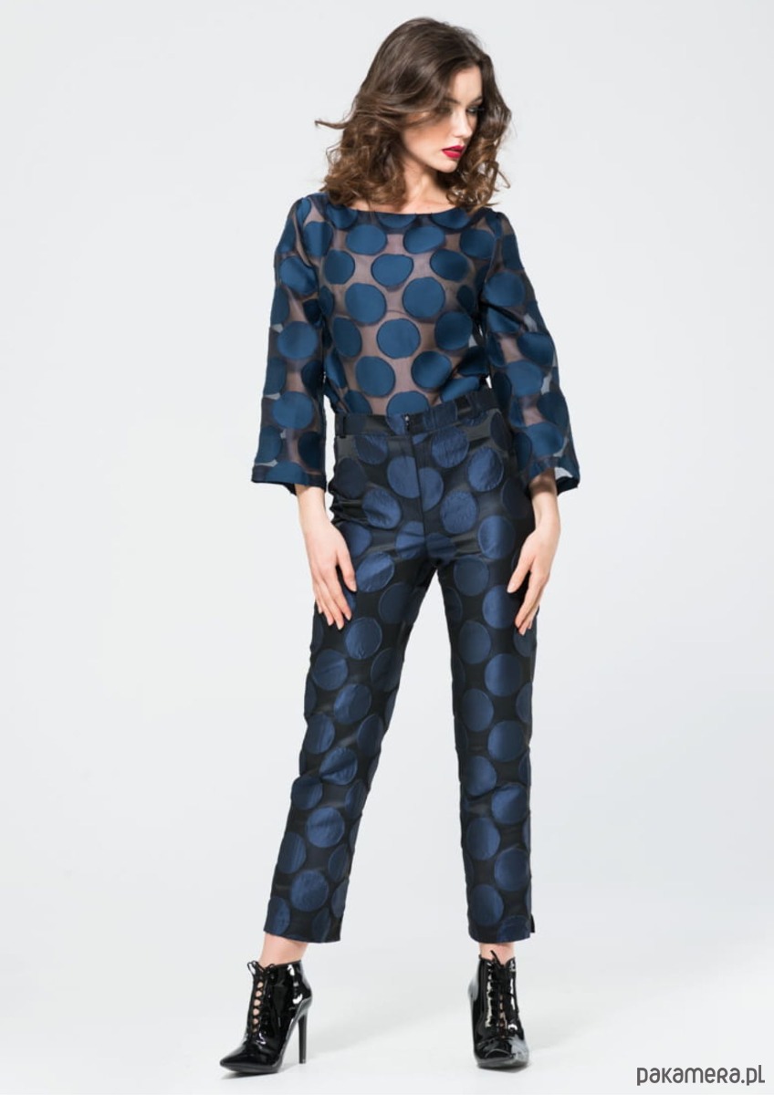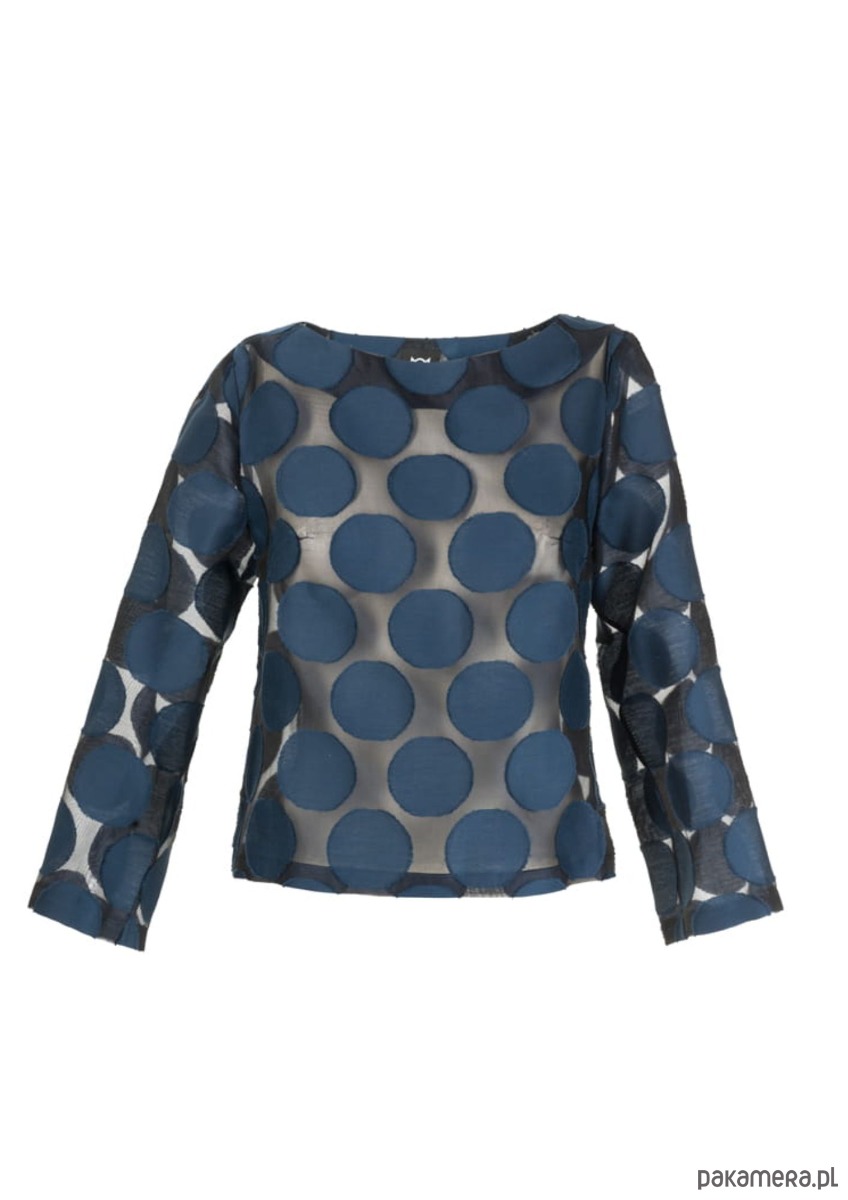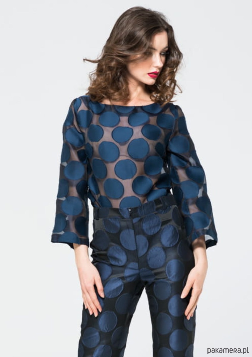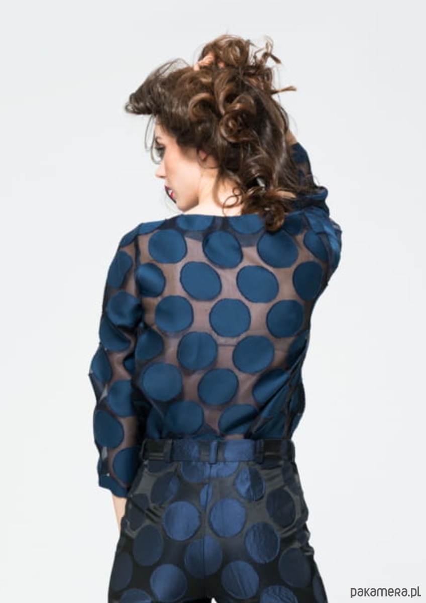 Lekko prześwitująca jedwabna bluzka w grochy to moja propozycja dla pewnych siebie kobiet. Niekonwencjonalny wzór, czyli duże granatowe kropy wkomponowane w przeźroczyste tło, przez które przeziera opalona skóra, nie pozostawia obojętnym.