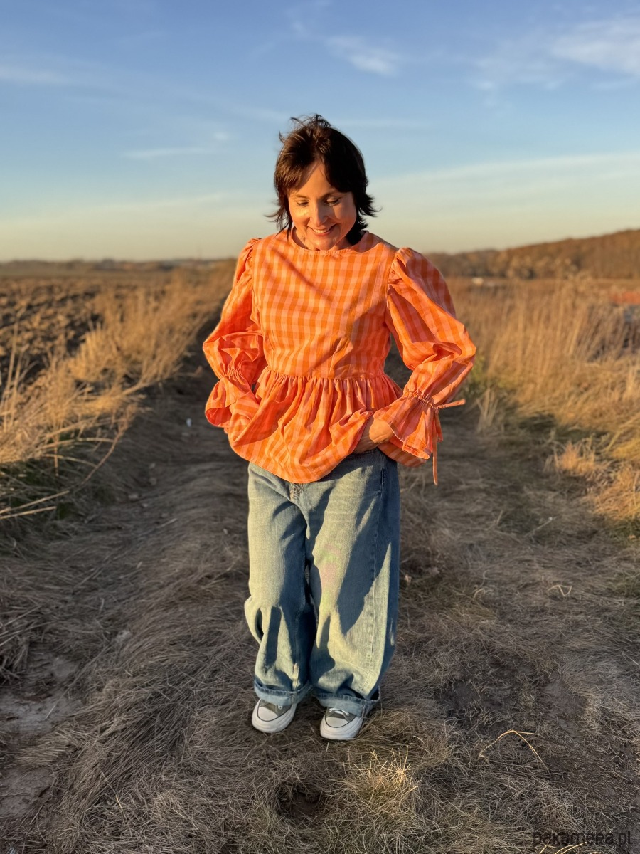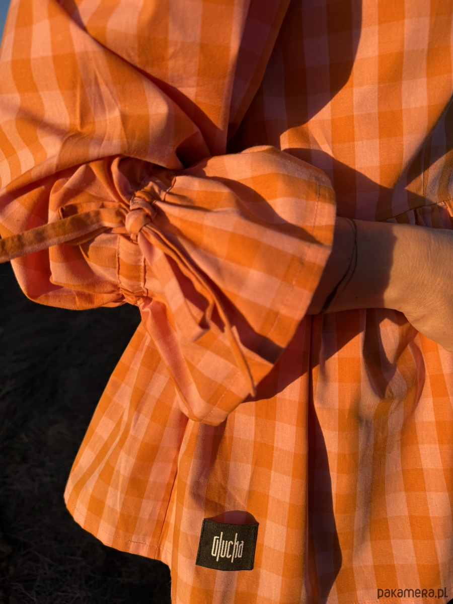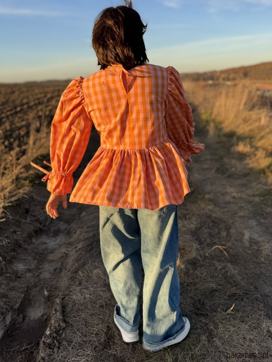 Bluzka to połączenie klasyki z radosnym kolorem – idealna na każdy sezon. Uszyta z naturalnej bawełny w pomarańczową kratkę vichy, przyciąga wzrok i dodaje energii niezależnie od pogody.