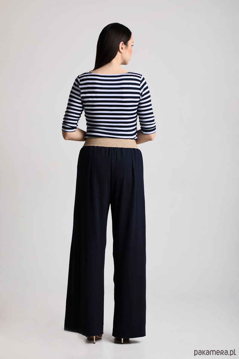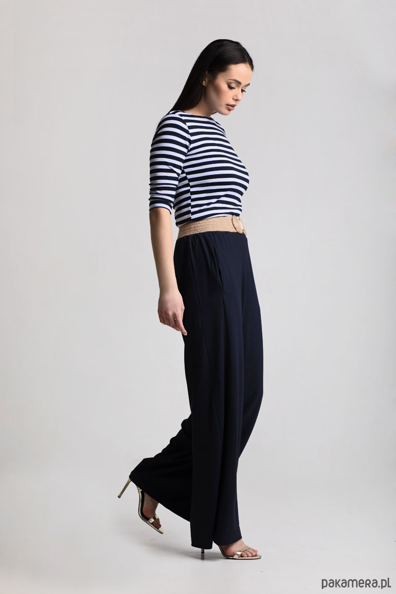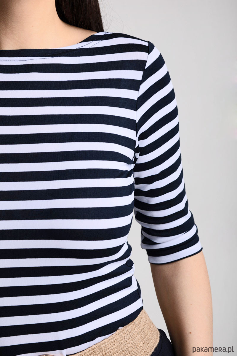 T-shirt damski w paski typu basic. Model z krótkim rękawem i dekoltem w łódkę. Uszyty z cienkiej i elastycznej dzianiny, dzięki czemu idealnie dopasowuje się do kształtów. Model ten stanowi idealną bazę do wielu letnich stylizacji. T-shirt uszyty w Krakowie.
