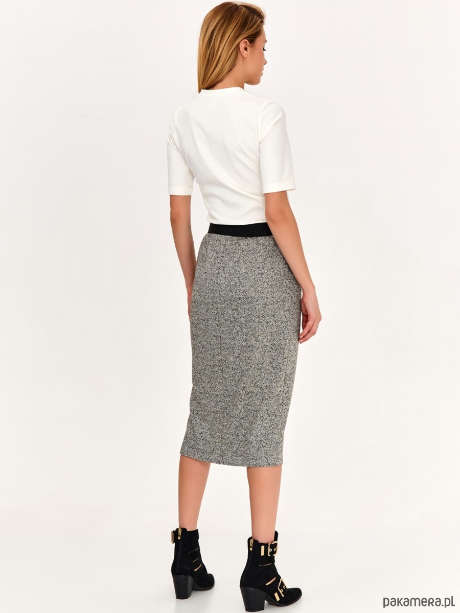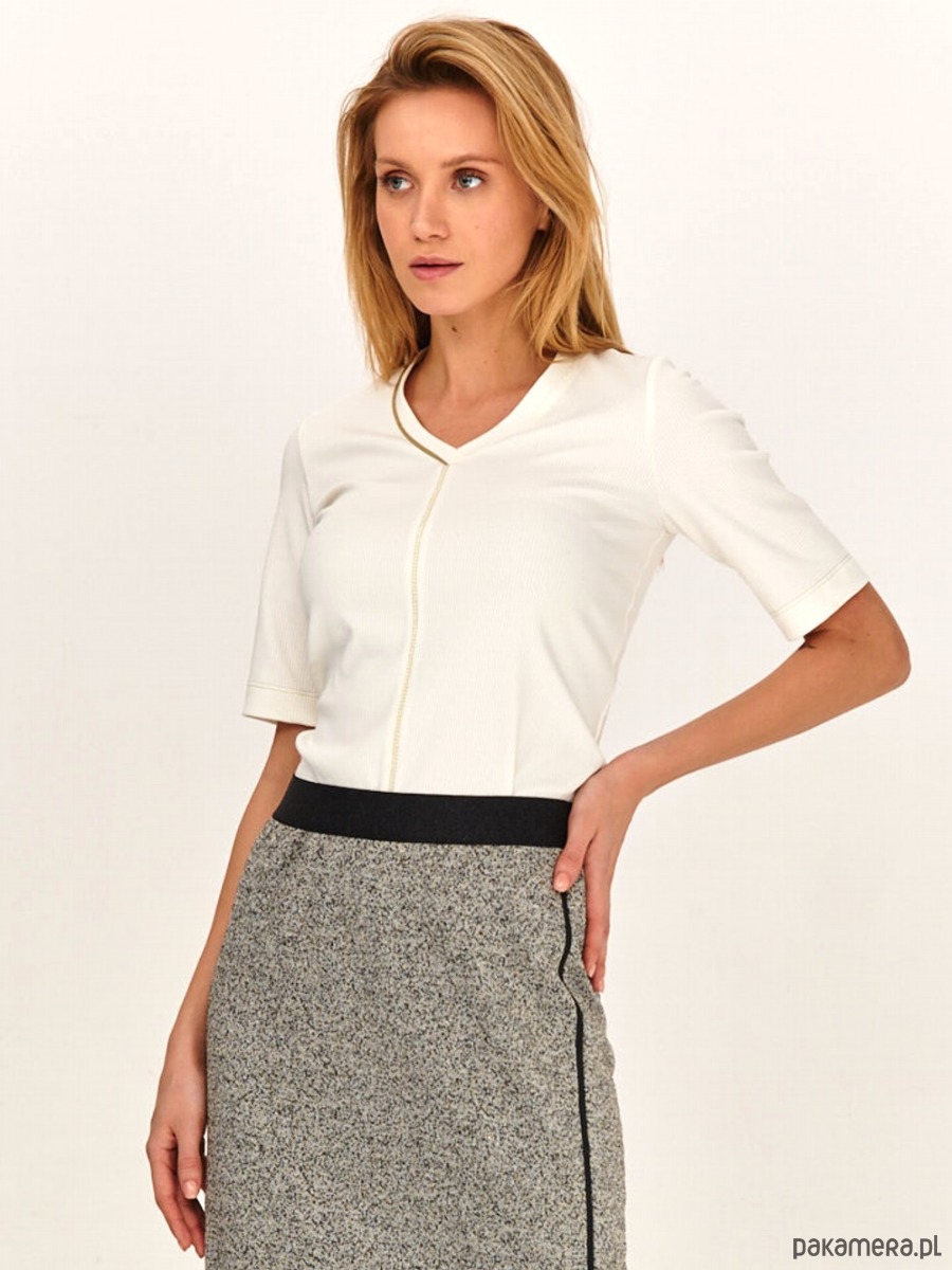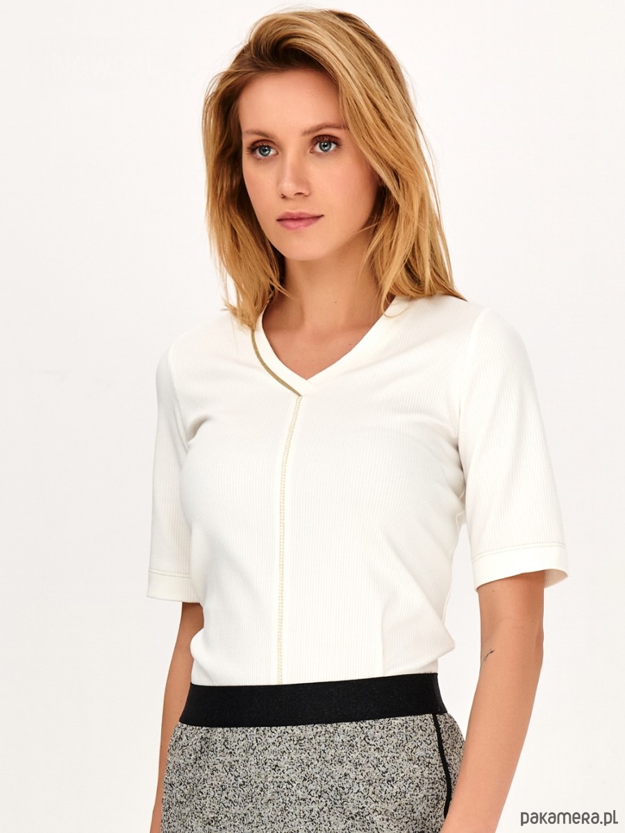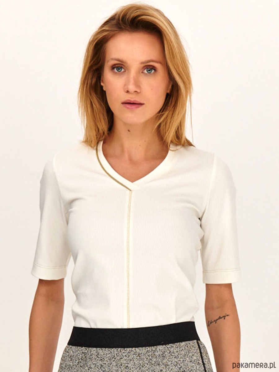 Koszulka - t-shirt ze strukturalnej i mięsistej dzianiny. Dzianina typu ściągacz - rib. Wysoki gatunek włókna wiskozowego. Dekolt w serek, ozdobiony złotą wypustką. Dodatkowo koszulka ma ozdobne przeszycia na przodzie, rownież w kolorze złota. Krotki rękaw.