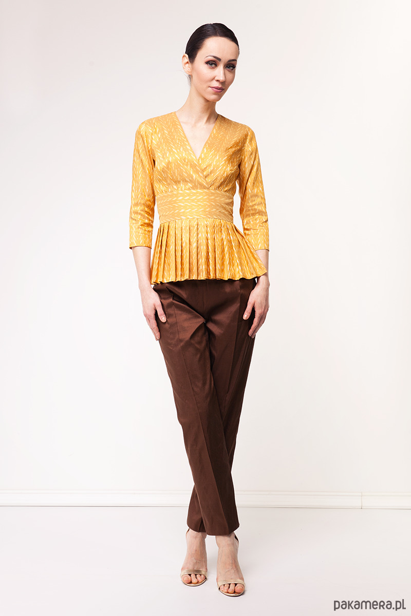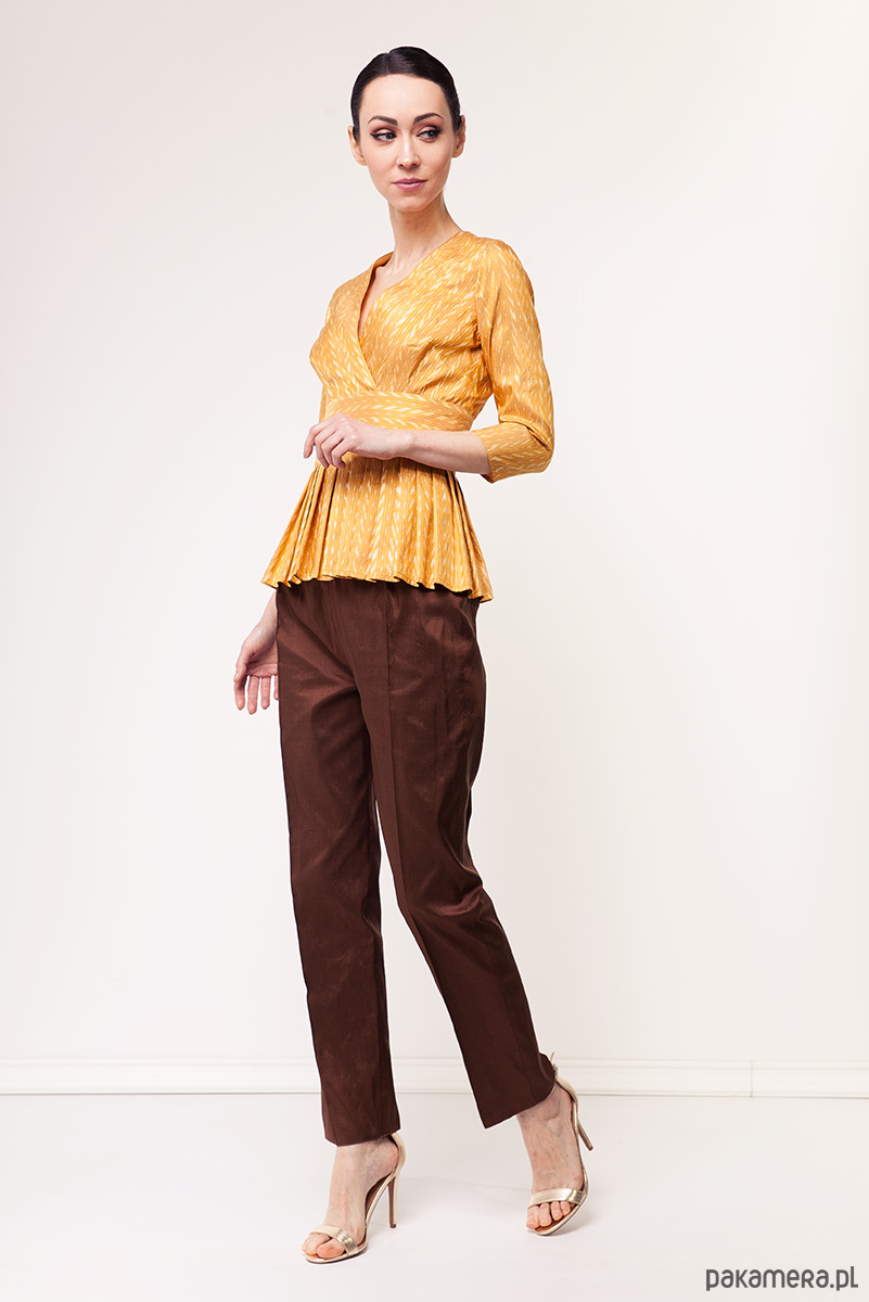 Bluzka z kolekcji specjalnej uszytej na tajski tydzień mody. Wykonana z tajskiego, ręcznie tkanego jedwabiu królewskiego. Tkanina nie jest elastyczna. Góra kopertowa, na podszewce. Talia podkreślona szerokim pasem, baskinka z zakładek, rękawy 3/4, zamek kryty z tyłu, długość około 55 cm.