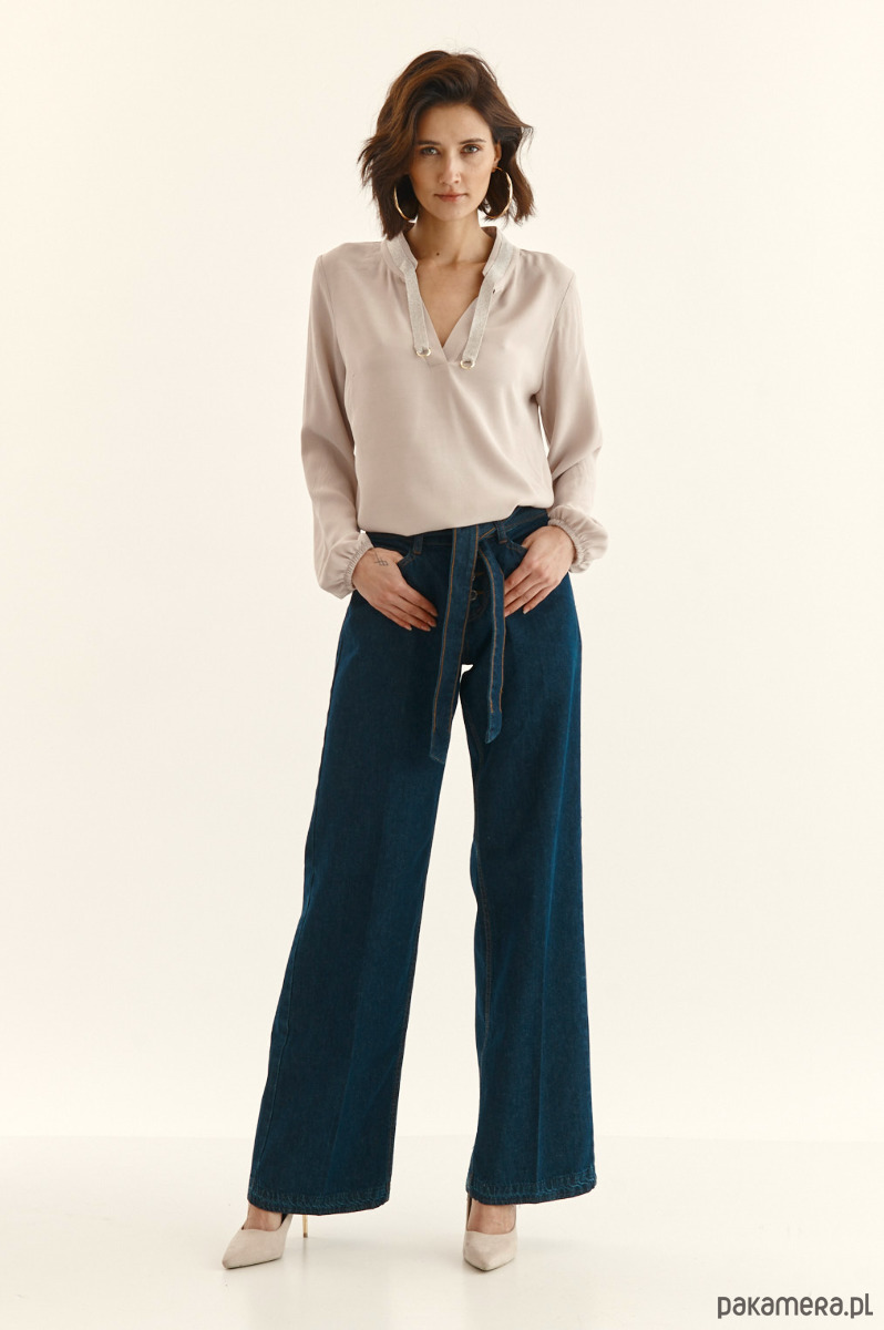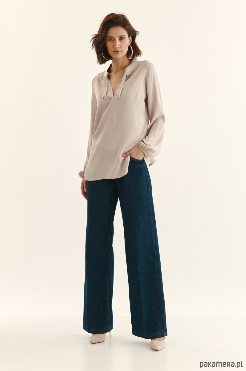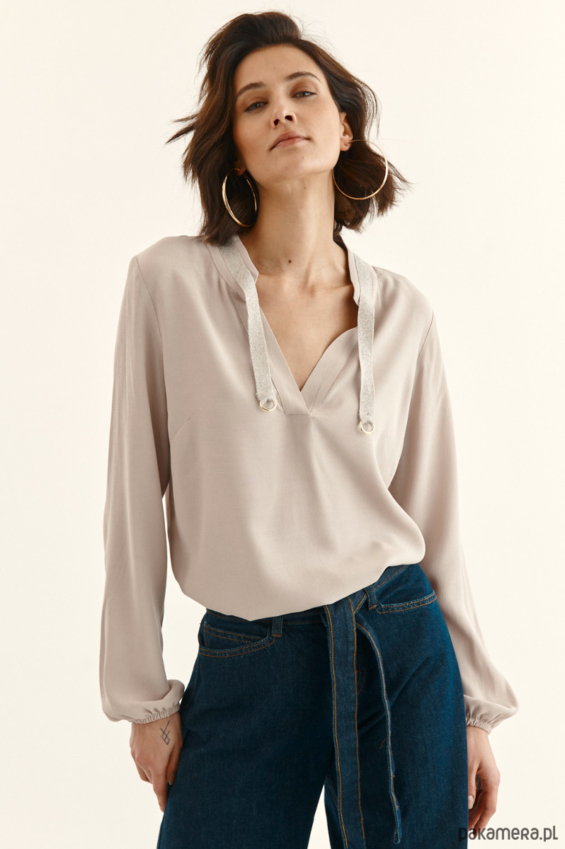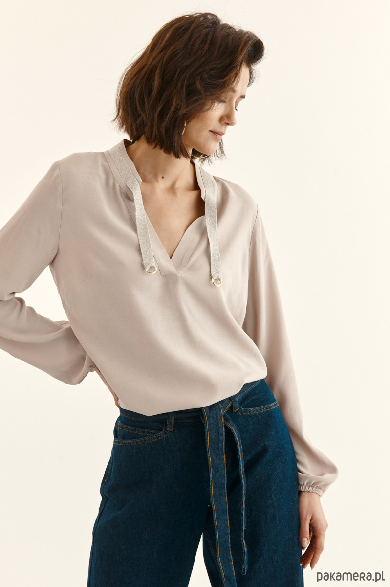 Bluzka Agata z lekko elastycznej, lejącej wiskozy. W pięknym kolorze jasnego, kamiennego beżu. Stójka z naszytą ozdobną delikatną taśmą. Końcówki taśmy zakończone małymi kółeczkami. Dekolt polo, w kształcie "serka". Długi rękaw. Doły rękawów lekkie bufki, ujęte w gumkę. Po bokach rozporki.