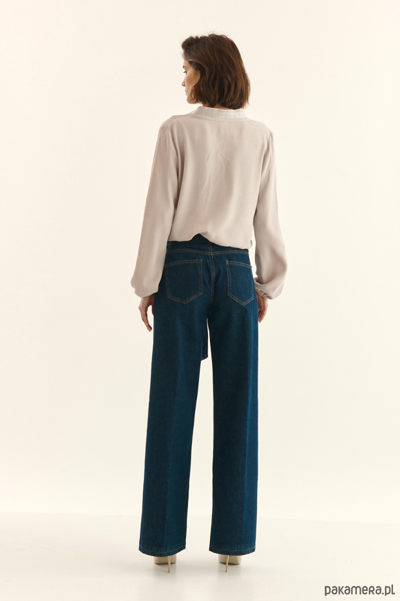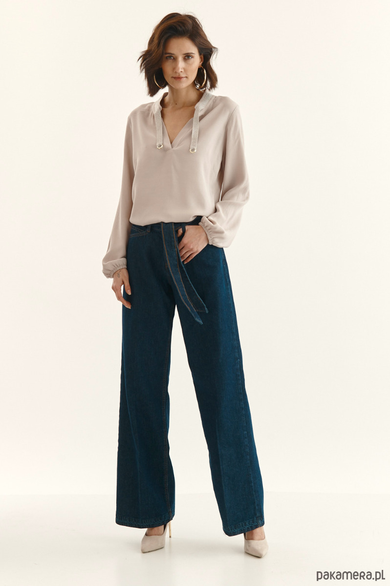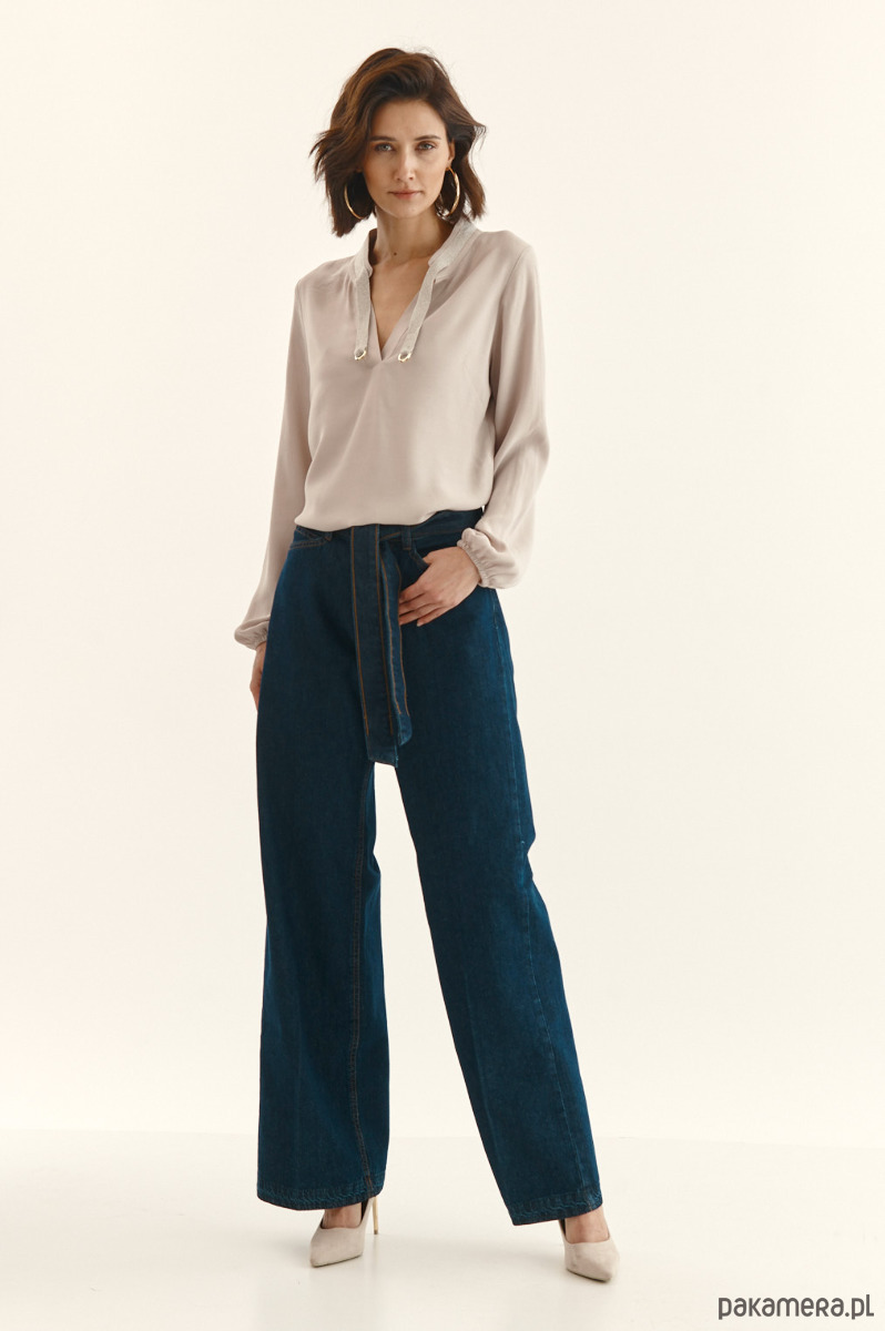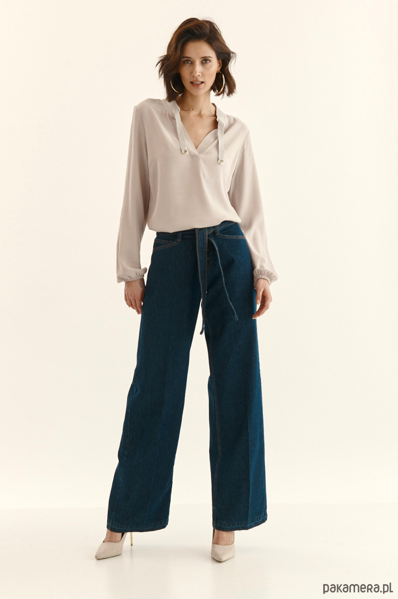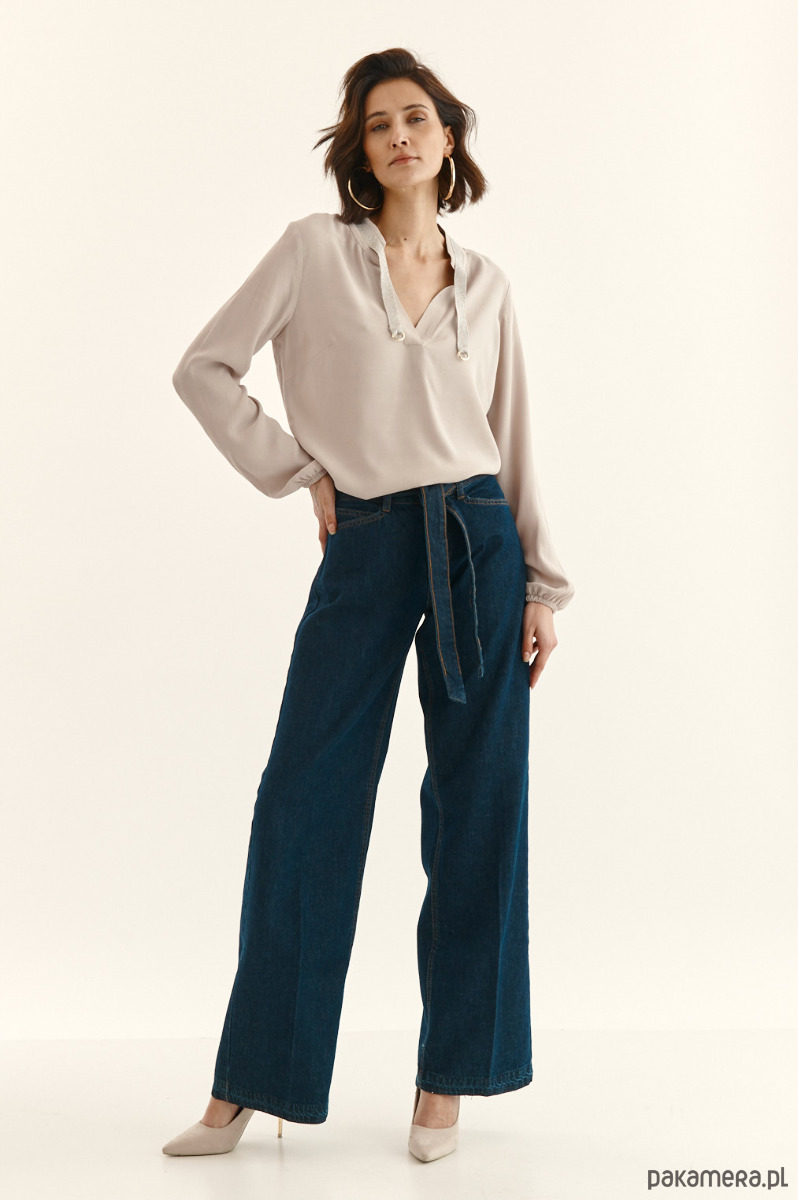 Bluzka Agata z lekko elastycznej, lejącej wiskozy. W pięknym kolorze jasnego, kamiennego beżu. Stójka z naszytą ozdobną delikatną taśmą. Końcówki taśmy zakończone małymi kółeczkami. Dekolt polo, w kształcie "serka". Długi rękaw. Doły rękawów lekkie bufki, ujęte w gumkę. Po bokach rozporki.