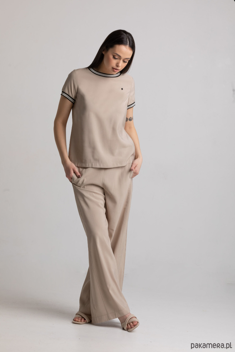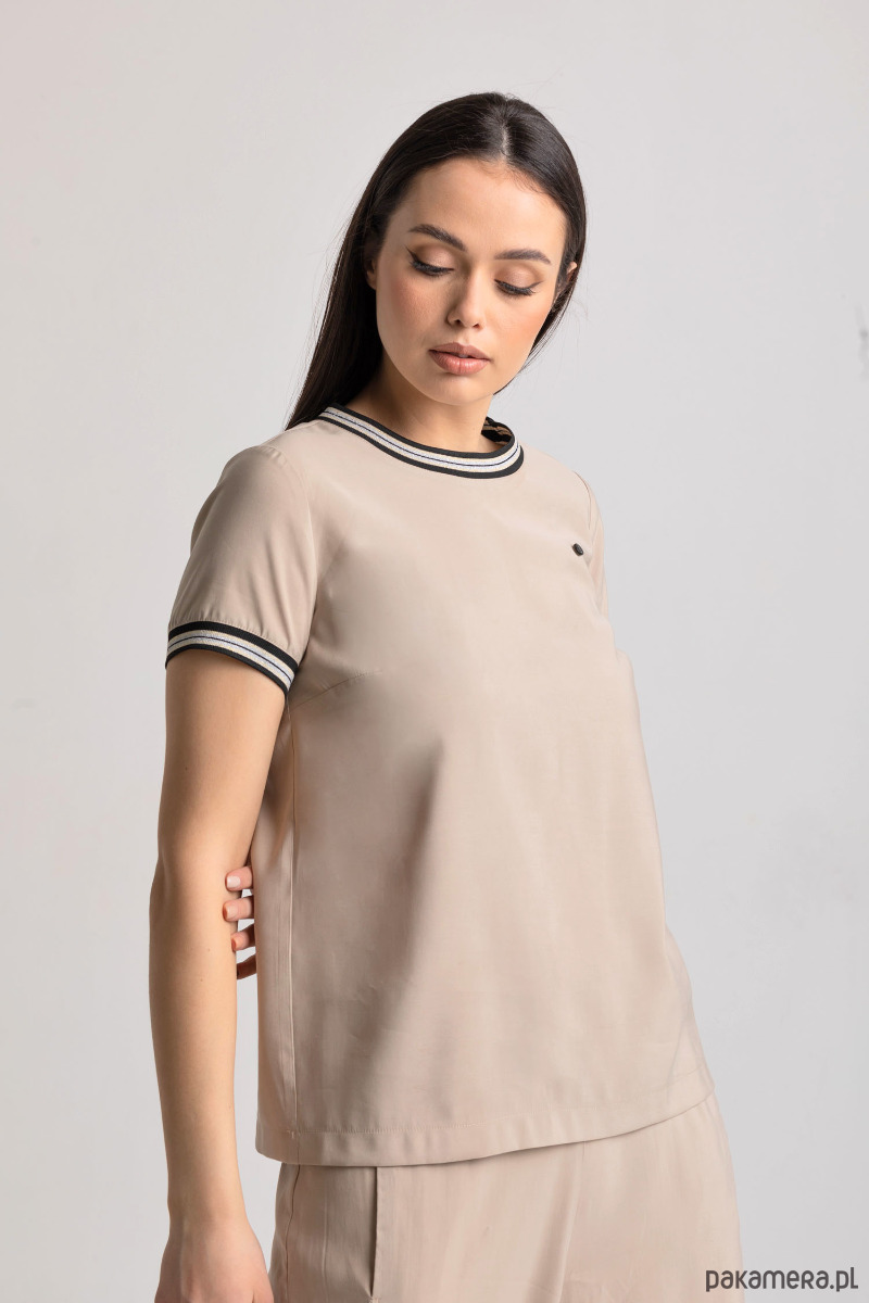 Bluzka beżowa z ozdobnymi taśmami pod szyją i na rękawach. Idealnie sprawdzi się do codziennym stylizacji, jak i na specjalne okazje. Na piersi posiada małą ozdobną broszkę Click.