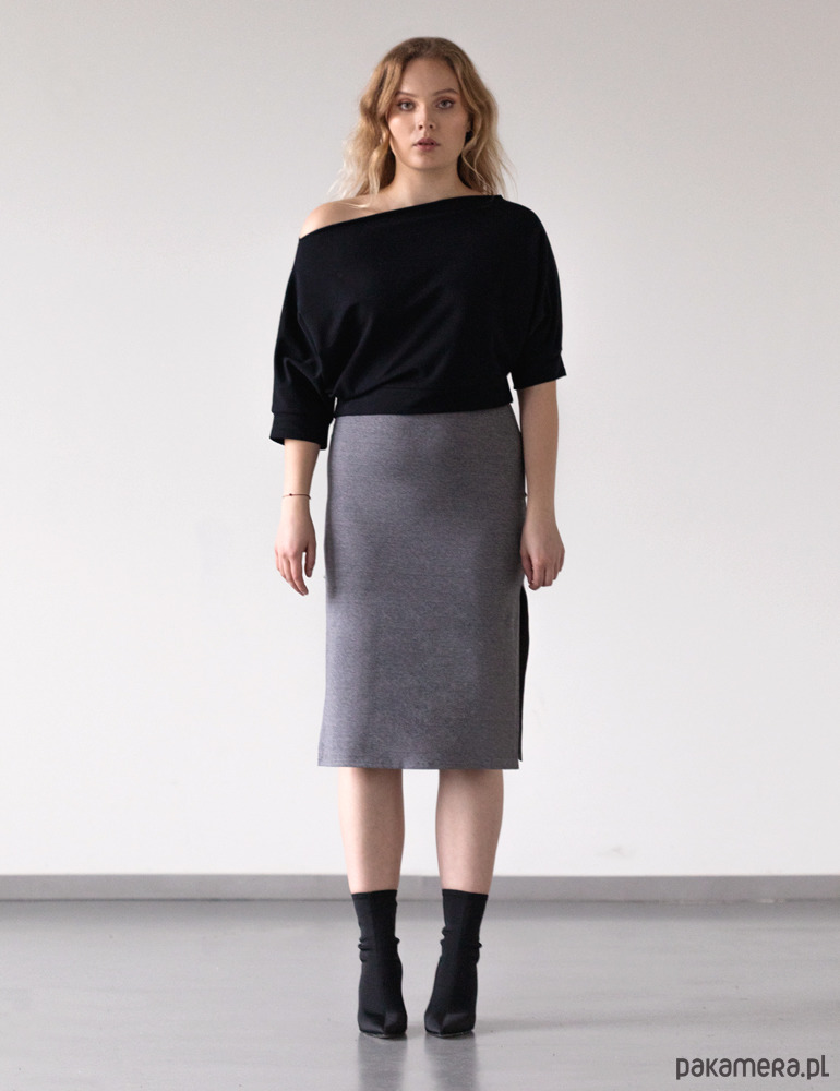 Wygodna bluzka dzianinowa o luźnym, kimonowym kroju w kolorze czarnym, którą można nosić na wiele sposobów, zakładając na gołe ciało, top, dopasowany longsleeve czy golf. Szeroki dekolt łódka pozwala na noszenie bluzki asymetrycznie, opuszczonej na jedno ramię.