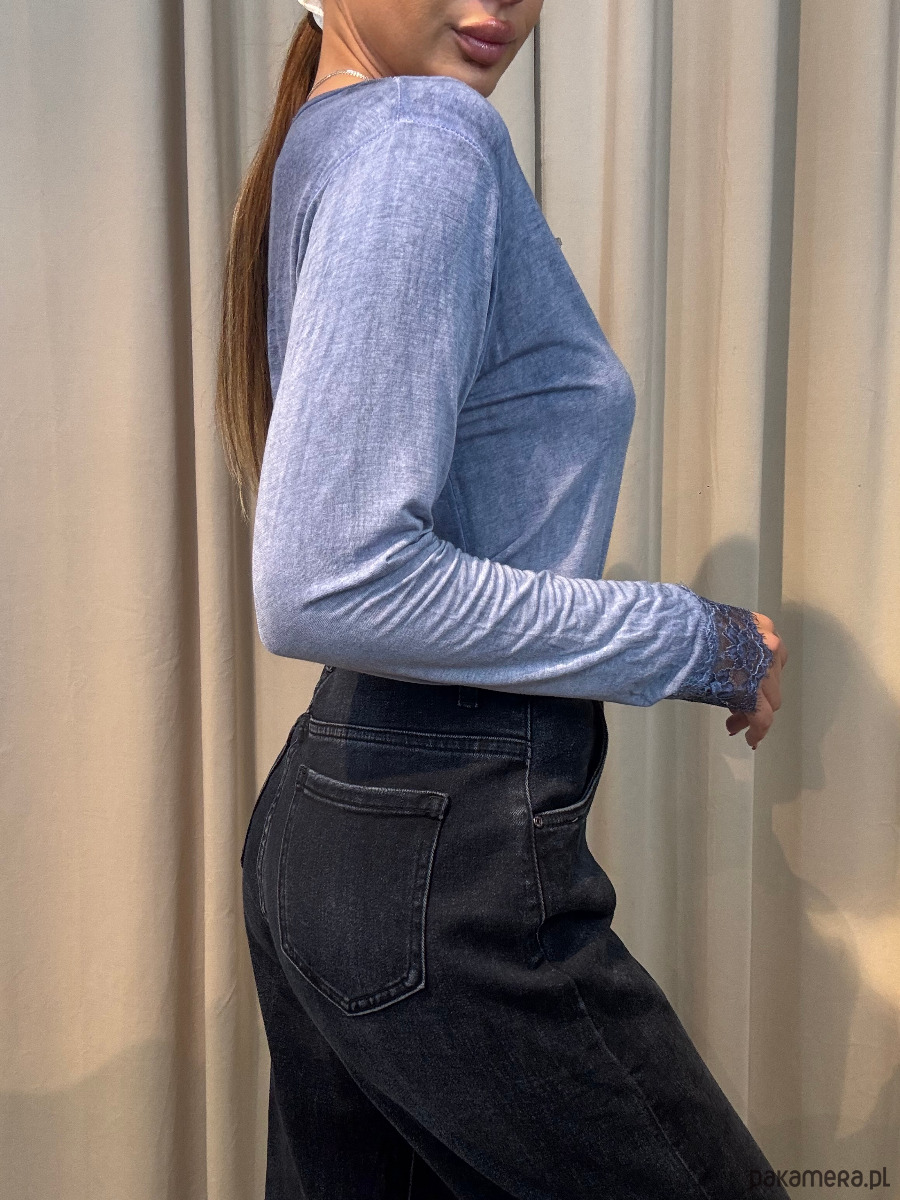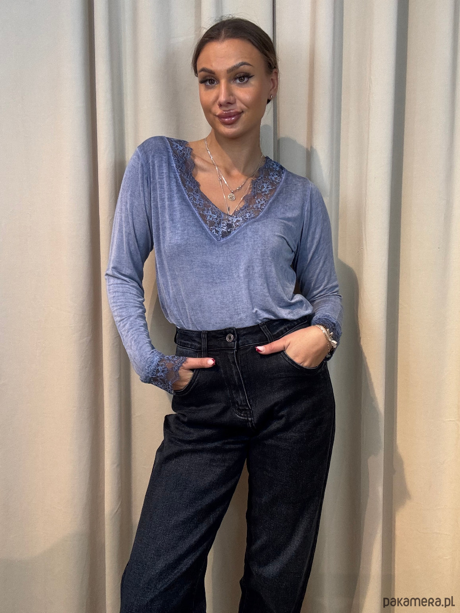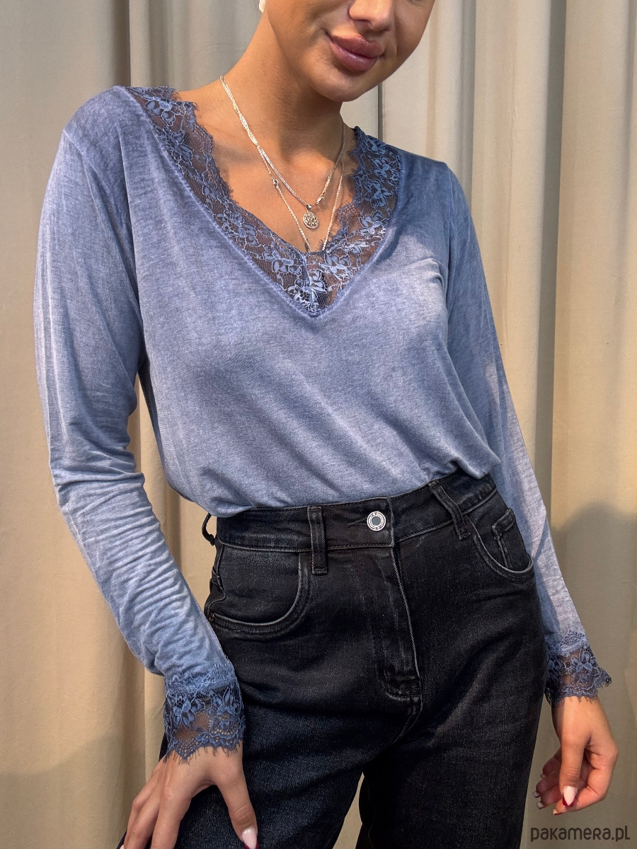 Bluzka z wykończenie koronkowym przy dekolcie oraz na rękawach.