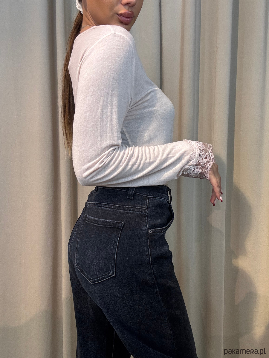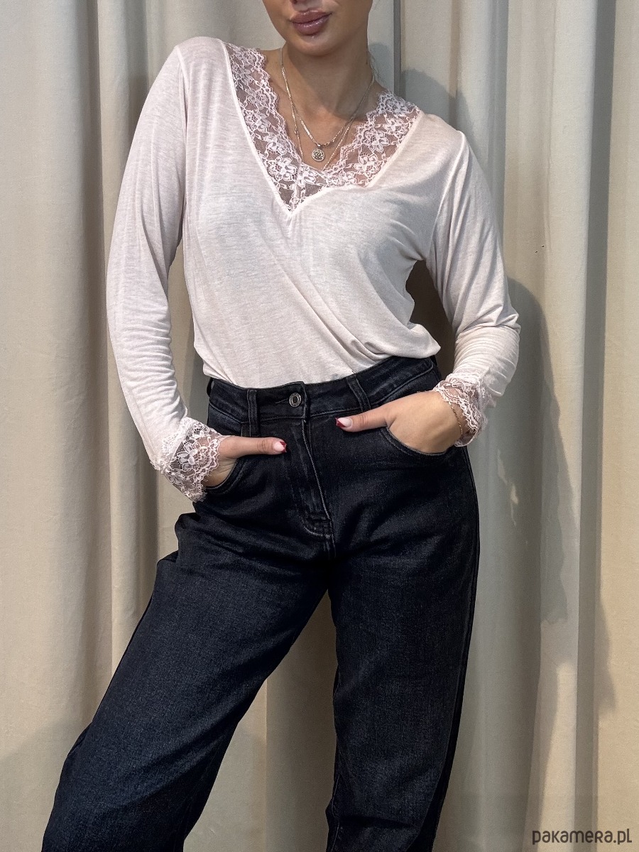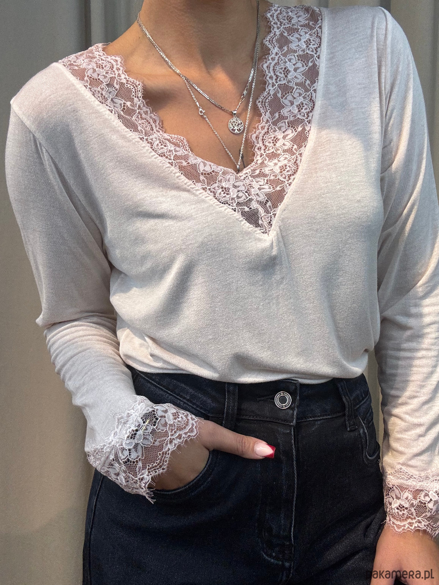 Bluzka z wykończenie koronkowym przy dekolcie oraz na rękawach.