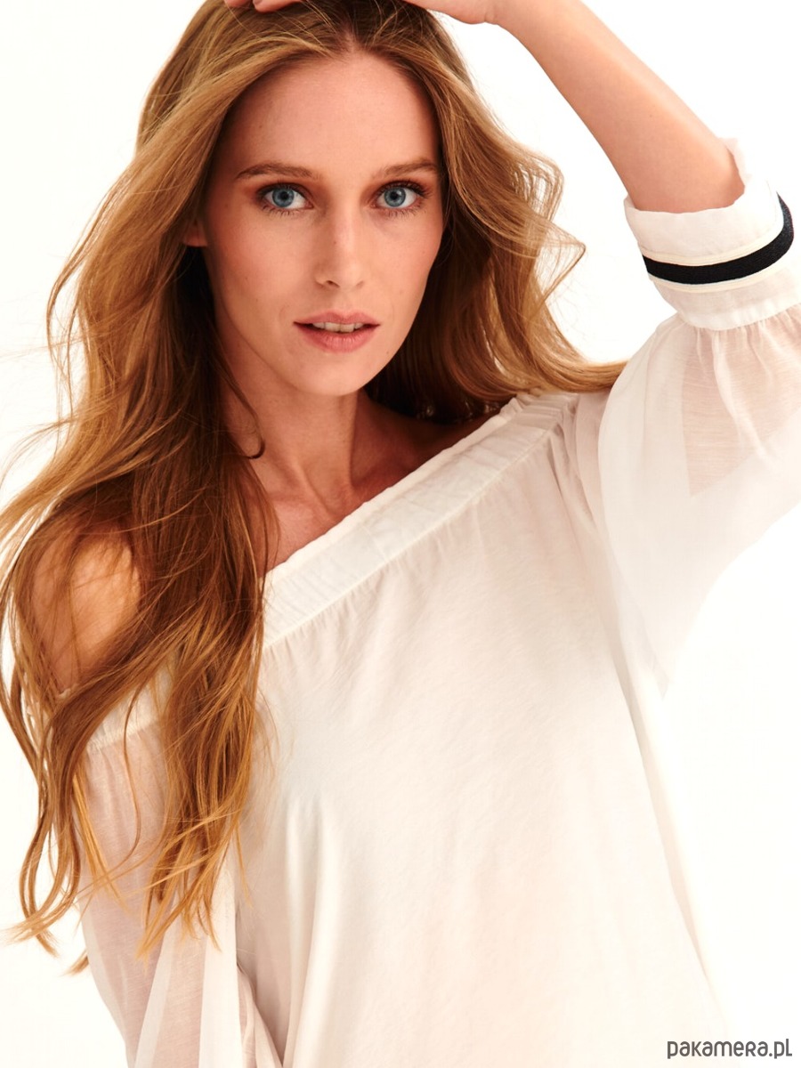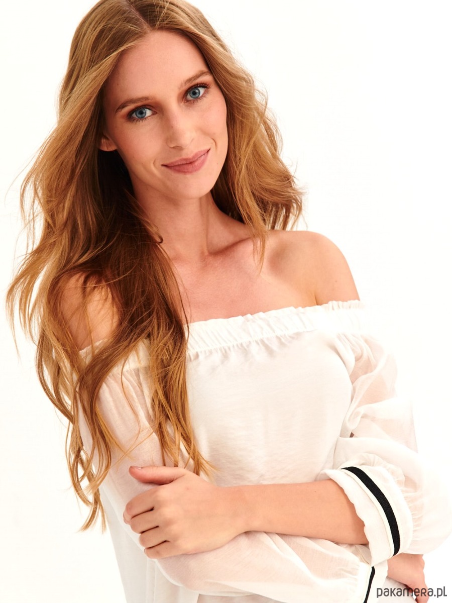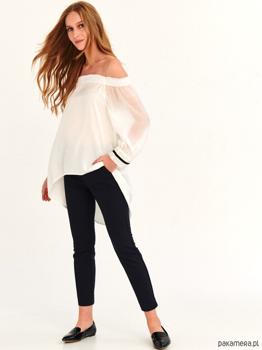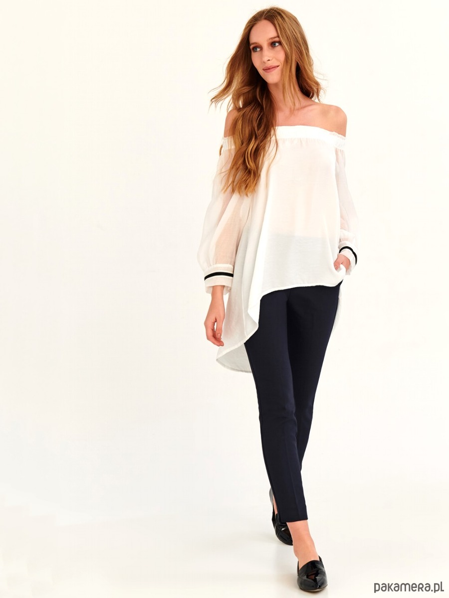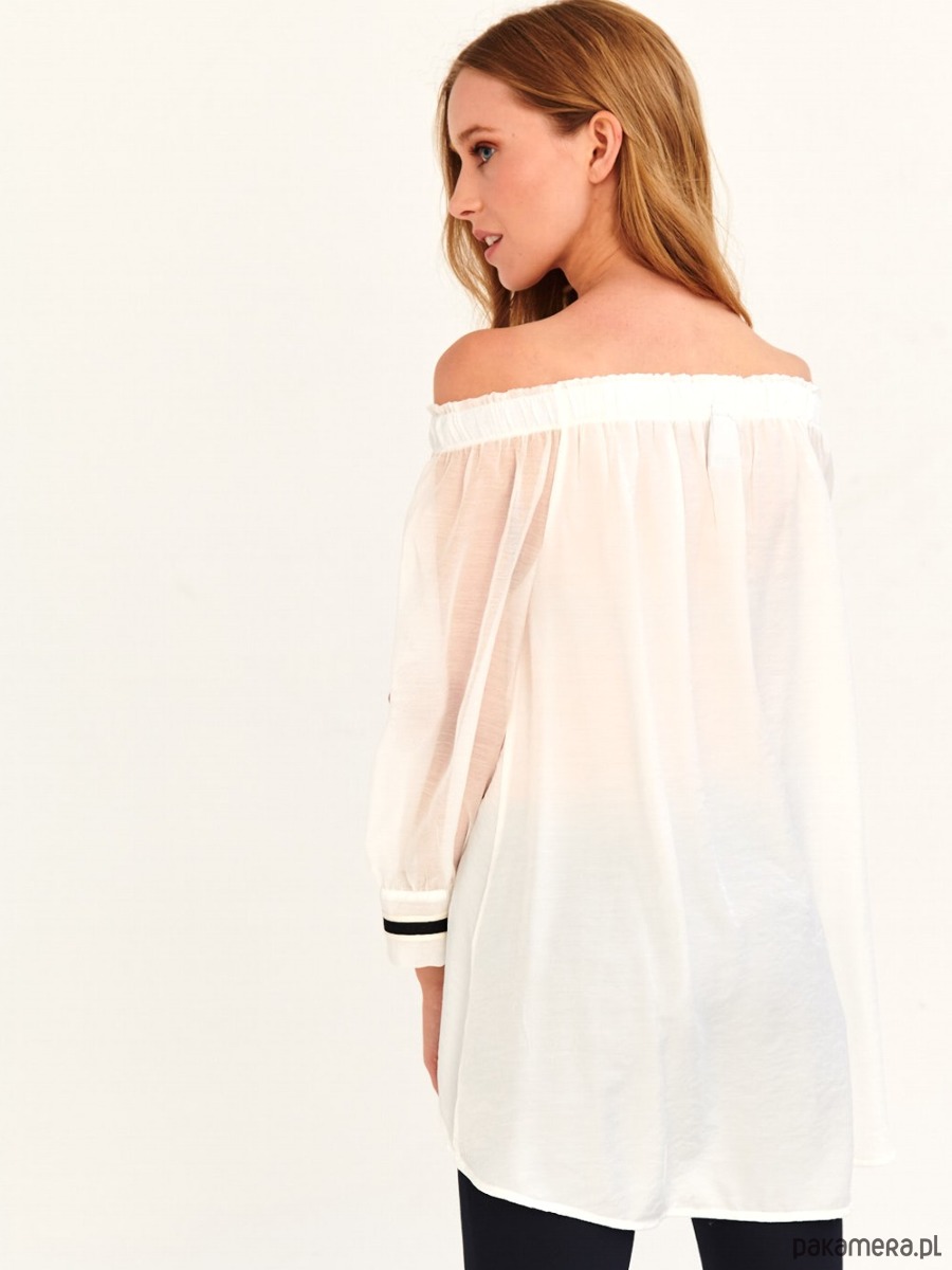 Bluzka ze zwiewnej, delikatnej wiskozowej tkaniny . Krój w kształcie litery A, przód krótszy niż tył. Odsłaniający ramiona hiszpański dekolt. Rękawy długości 3/4, zakończone mankietem oraz ozdobną taśmą.