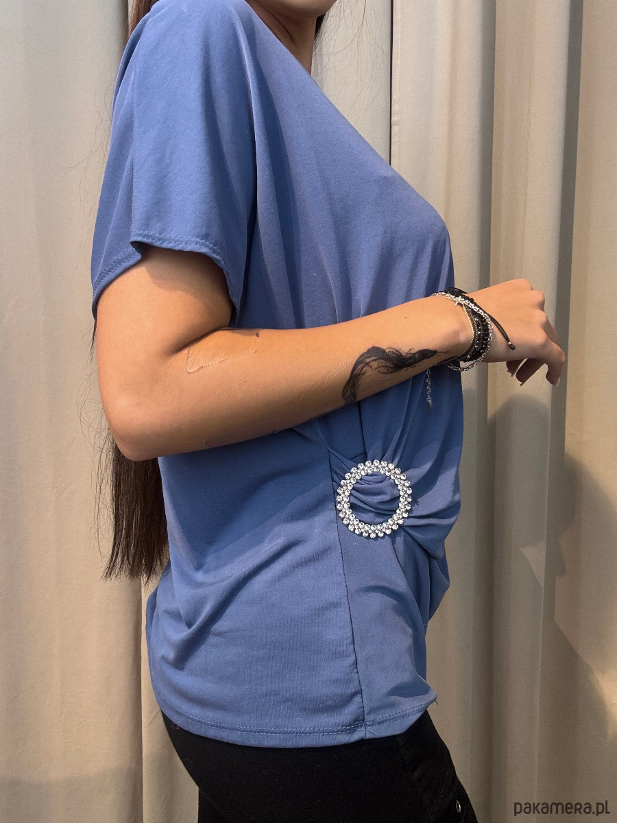 Damska bluzka z marszczeniem oraz zdobieniem.