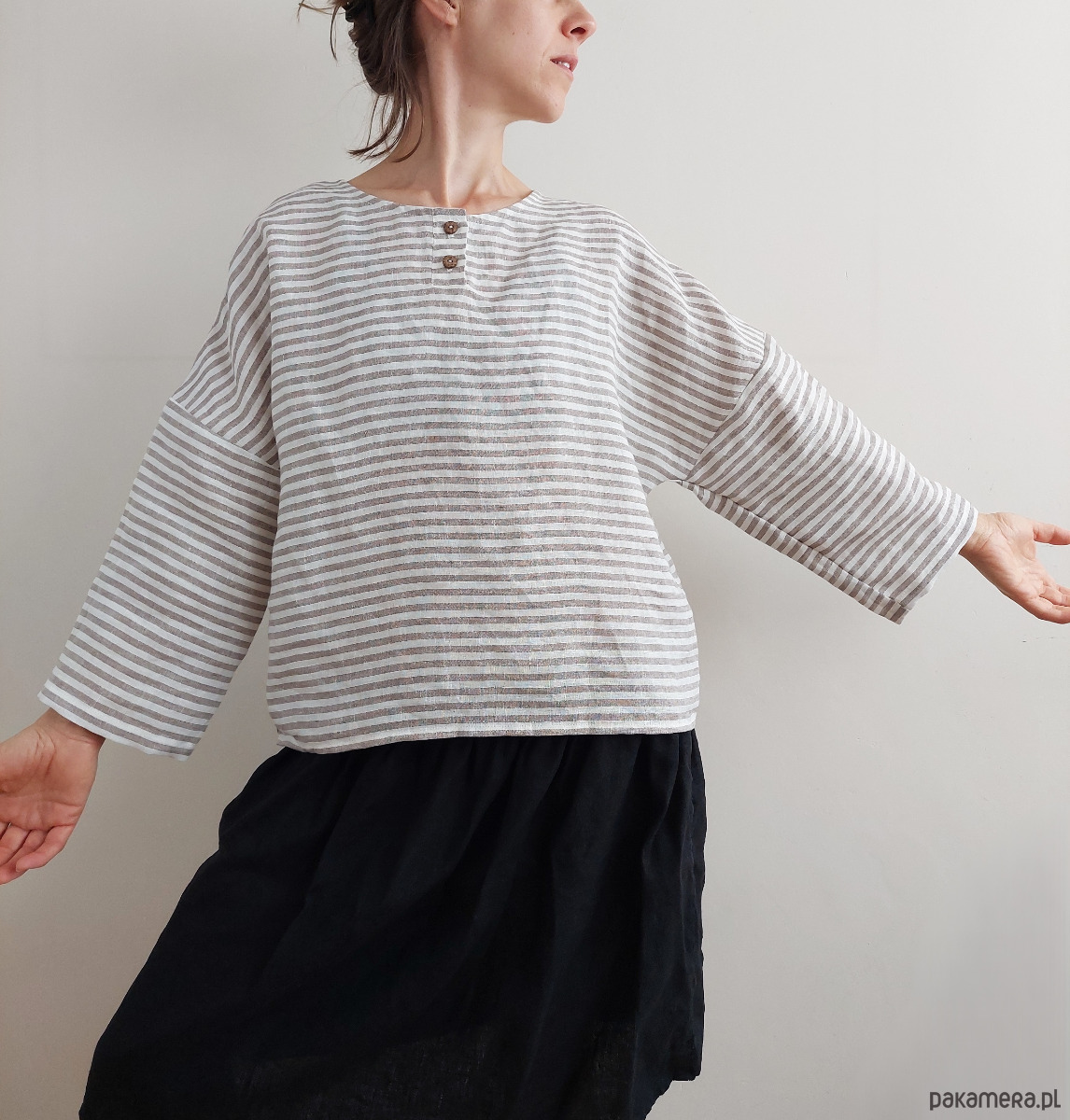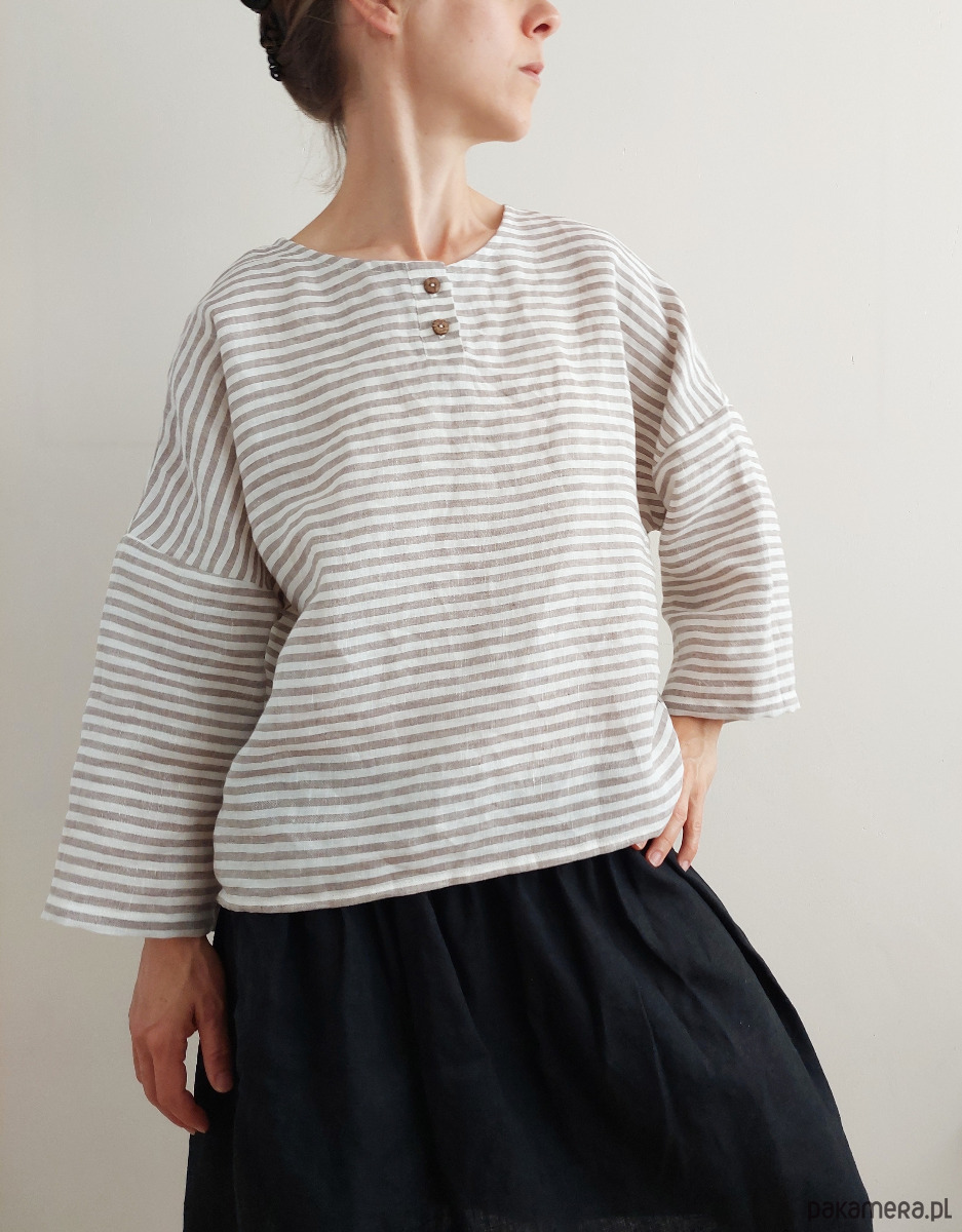 Wykonana z polskiego lnu 100%, paski w kolorze mocha, delikatna, cudownie wygodna, luźna, miła dla skóry i oka.